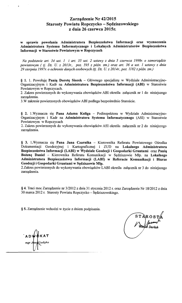 Zarzqdzenie Nr 4212015 Starosty Powiatu Ropczycko - S~dziszowskiego z dnia 26 czerwca 2015r. w sprawie powolania Administratora Bezpieczeiistwa Informacji oraz wyznaczenia Administratora Systemu Informatycznego i Lokalnych Administratorow Bezpieczeiistwa Informacji w Starostwie Powiatowym w Ropczycach Na podstawie art. 34 ust. 1 i art. 35 ust. 2 ustawy z dnia 5 czerwca 1 9 9 8 ~o samorzqdzie powiatowym ( tj. Dz. U. z 2013r, poz. 595 z p6in. zm.) oraz art. 36 a ust. 1 ustawy z dnia 29 sierpnia 1 9 9 7 ~o ochronie danych osobowych (0. Dz. U. z 2 0 1 4 ~poz. , 1182 zp6in. zm.) @ 1. 1. Powolujq Paniq Dorotq Siorek - Glbwnego specjalistq w Wydziale AdministracyjnoOrganizacyjnym i Kadr na Administratora Bezpieczeiistwa Informacji (ABI) w Starostwie Powiatowym w Ropczycach. 2. Zakres powierzonych do wykonywania obowiqzk6w ABI okreila zalqcznik nr 1 do niniejszego zarzqdzenia. 3.W zakresie powierzonych obowiqzkbw ABI podlega bezpoirednio Staroicie. @ 2. 1,Wyznacza siq Pana Adama Kuliga - Podinspektora w Wydziale AdministracyjnoOrganizacyjnym i Kadr na Administratora Systemu Informatycznego (ASI) w Starostwie Powiatowym w Ropczycach 2. Zalrres powierzonych do wykonywania obowiqzk6w AS1 okreSla zalqcznik nr 2 do niniejszegc, zarzqdzenia. @ 3. 1.Wyznacza siq Pana Jana Czarnika - Kierownika Referatu Powiatowego OSrodka Dokumentacji Geodezyjnej i Kartograficznej i ZUD na Lokalnego Administratora Bezpieczenstwa Informacji (LABI) w Wydziale Geodezji i Gospodarki Gruntami oraz Paniq Boienq Daniel - Kierownika Referatu Komunikacji w Sqdziszowie Mlp. na Lokalnego Administratora Bezpieczenstwa Informacji (LABI) w Referacie Komunikacji i Biurze Geodezji i Gospodarki Gruntami w Sqdziszowie Mlp. 2.Zakres powierzonych do wykonywania obowiqzkbw LABI okreSla zalqcznik nr 3 do niniejszego zarzqdzenia. @ 4. Traci moc Zarzqdzenie nr 3/20 12 z dnia 3 1 stycznia 20 12 r. oraz Zarzqdzenie Nr 18/2012 z dnia 30 marca 2012 r. Starosty Powiatu Ropczycko - Sqdziszowskiego. 5 5. Zarzqdzenie wchodzi w zycie z dniem podpisania. Zalqcznik nr 1 do Zarzqdzenie Nr 4212015 Starosty Powiatu Ropczycko - S~dziszowskiego z dnia 26 czerwca 2015r. Zakres dzialania Administratora Bezpieczenstwa Informacji (ABI) Stosowanie Srodkdw technicznych i organizacyjnych zapewniajqcych ochronq przetwarzania danych odpowiedniq do zagrozen oraz kategorii danych objqtych ochronq, a w szczegolnoSci zabezpieczenie danych przed ich udostqpnieniem osobom nieupowaznionym, zabraniem przez osobe nieupowainionq, przetwarzaniem z naruszeniem ustawy, utratq, uszkodzeniem lub zniszczeniem. 1. Zapewnianie przestrzegania przepis6w o ochronie danych osobowych, w szczegolnoici przez: a) sprawdzanie zgodnogci przetwarzania danych osobowych z przepisami o ochronie danych osobowych oraz opracowanie w tyrn zakresie sprawozdania dla administratora danych, b) nadzorowanie opracowania i aktualizowania dokurnentacji, o ktdrej mowa w art. 36 ust. 2, oraz przestrzegania zasad w niej okreSlonych, c) zapewnianie zapoznania os6b upowainionych do przetwarzania danych osobowych z przepisami o ochronie danych osobowych; 2. Prowadzenie rejestru zbiorow danych przetwarzanych przez administratora danych, z wyjqtkiem zbior6w, o ktorych mowa w art. 43 ust. 1, zawierajqcego nazwq zbioru oraz informacje, o kt6rych mowa w art. 4.1 ust. 1 pkt 2-4a i 7. 3. Prowadzenie ewidencji os6b upowainionych do przetwarzania danych osobowych. Zaiqcznik nr 2 do Zarzqdzenie Nr 4212015 Starosty Powiatu Ropczycko - Sqdziszowskiego z dnia 26 czenvca 2015r. Zakres dzialania Administratora Systemu Informatycznego (ASI) Administrator Systemu Informatycznego, w zakresie zadan wykonywanych dla zapewnienia systemom bezpieczenstwa, zgodnego z celami i metodologiq wdrozonej polityki bezpieczenstwa informacji, wspdlpracuje bezpoirednio z Administratorem Bezpieczenstwa Informacji (ABT). Do zadan Administratora Systemu Informatycznego naleiy: 1. Formulowanie, w uzgodnieniu z administratorem danych illub osobami, kt6rym administrator delegowal uprawnienia oraz ABI, sposobu okreilania uprawnien w systemach informatycznych. 2.Realizacja decyzji Administratora Danych Osobowych (Iinnych) odnoSnie nadania osobom uprawnien dostqpu do danych i wybranych hnkcji narzqdzi sluzqcych do ich przetwarzania, w Brodowisku IT Starostwa tj.: 1) tworzenie kont uzytkownikbw w systemach informatycznych, 2) przypisywanie, do kont, startowych hasel uwierzytelniajqcych uzytkownikow tych kont, 3) przypisywanie do zalozonych kont polityk odnoinie jakoSci hasel i czqstotliwoSci ich zmiany, 4) resetowanie utraconych hasef, 5) usuwanie kont i uprawnien dla kont osdb, ktdre zakonczyfy pracq w Starostwie, 6) dostarczanie ABI informacji potrzebnych do oceny prawidlowoSci funkcjonowania sprzqtowoprogramowych. 3.Planowanie inwestycji oraz dostaw i uslug niezbqdnych dla utrzymania i rozwoju Srodowiska IT w Starostwie; 4. Planowanie i wykonywanie zadah zwiqzanych z tworzeniem kopii bezpieczenstwa system6w i danych; 5.Zapewnienie awaryjnego zasilania komputerdw oraz innych urzqdzen majqcych wpfyw na bezpieczenstwo przetwarzania danych osobowych; 6.Automatyzacja zadah konsenvacyjnych w systemie - w tym wykonywania kopii zapasowych oprogramowania i danych; 7. Nadzor nad naprawami, konsenvacjq oraz likwidacjq urzqdzen komputerowych na kt6rych zapisywane sq dane osobowe; 8. Monitorowanie stanu Srodowiska IT, stanu sprzqtu IT i wykorzystywanego oprogramowania oraz aktywnoici sieciowej uiytkownikdw; 9. Monitorowanie 1egalnoSci oprogramowania wykorzystywanego na stacjach roboczych; 10.Zapewnienie senverom i stacjom roboczym niezbqdnych licencji programowych; 11. Systematyczne aktualizowanie oprogramowania systemowego, aplikacyjnego i ochronnego; 12.Zapewnienie eksploatowanym systemom opieki serwisowej producenta - zawieranie urndw regulujqcych formy tej opieki; 13.Rozwiqzywanie, samodzielnie i we wspdlpracy z pozostalym personelem IT, problemow towarzyszqcych eksploatacji systemdw informatycznych; 14.Monitorowanie zabezpieczen wdrozonych w celu ochrony danych oso