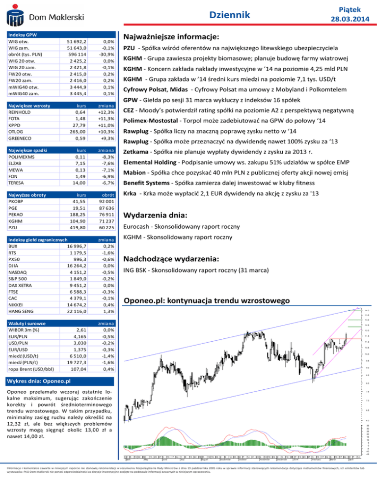 Piątek 28.03.2014 Dziennik Indeksy GPW WIG otw. WIG zam. obrót (tys. PLN) WIG 20 otw. WIG 20 zam. FW20 otw. FW20 zam. mWIG40 otw. mWIG40 zam. 51 692,2 51 643,0 596 114 2 425,2 2 421,8 2 415,0 2 416,0 3 444,9 3 445,4 0,0% -0,1% -30,9% 0,0% -0,1% 0,2% 0,2% 0,1% 0,1% Największe wzrosty REINHOLD FOTA KPPD OTLOG GREENECO kurs 0,64 1,48 27,79 265,00 0,59 zmiana +12,3% +11,3% +11,0% +10,3% +9,3% Największe spadki POLIMEXMS ELZAB MEWA FON TERESA kurs 0,11 7,15 0,13 1,49 14,00 zmiana -8,3% -7,6% -7,1% -6,9% -6,7% Najwyższe obroty PKOBP PGE PEKAO KGHM PZU kurs 41,55 19,51 188,25 104,90 419,80 obrót 92 001 87 636 76 911 71 237 60 225 Indeksy giełd zagranicznych BUX 16 996,7 RTS 1 179,5 PX50 996,3 DJIA 16 264,2 NASDAQ 4 151,2 S&P 500 1 849,0 DAX XETRA 9 451,2 FTSE 6 588,3 CAC 4 379,1 NIKKEI 14 674,2 HANG SENG 22 116,0 zmiana 0,2% -1,6% -0,6% 0,0% -0,5% -0,2% 0,0% -0,3% -0,1% 0,4% 1,3% Najważniejsze informacje: PZU - Spółka wśród oferentów na największego litewskiego ubezpieczyciela KGHM - Grupa zawiesza projekty biomasowe; planuje budowę farmy wiatrowej KGHM - Koncern zakłada nakłady inwestycyjne w ’14 na poziomie 4,25 mld PLN KGHM - Grupa zakłada w ’14 średni kurs miedzi na poziomie 7,1 tys. USD/t Cyfrowy Polsat, Midas - Cyfrowy Polsat ma umowy z Mobyland i Polkomtelem GPW - Giełda po sesji 31 marca wykluczy z indeksów 16 spółek CEZ - Moody’s potwierdził rating spółki na poziomie A2 z perspektywą negatywną Polimex-Mostostal - Torpol może zadebiutować na GPW do połowy ‘14 Rawplug - Spółka liczy na znaczną poprawę zysku netto w ‘14 Rawplug - Spółka może przeznaczyć na dywidendę nawet 100% zysku za ‘13 Zetkama - Spółka nie planuje wypłaty dywidendy z zysku za 2013 r. Elemental Holding - Podpisanie umowy ws. zakupu 51% udziałów w spółce EMP Mabion - Spółka chce pozyskać 40 mln PLN z publicznej oferty akcji nowej emisj Benefit Systems - Spółka zamierza dalej inwestować w kluby fitness Krka - Krka może wypłacić 2,1 EUR dywidendy na akcję z zysku za '13 Wydarzenia dnia: Eurocash - Skonsolidowany raport roczny KGHM - Skonsolidowany raport roczny Nadchodzące wydarzenia: ING BSK - Skonsolidowany raport roczny (31 marca) Oponeo.pl: kontynuacja trendu wzrostowego 14.0 13.5 13.0 Waluty i surowce WIBOR 3m (%) EUR/PLN USD/PLN EUR/USD miedź (USD/t) miedź (PLN/t) ropa Brent (USD/bbl) 2,61 4,165 3,030 1,375 6 510,0 19 727,3 107,04 zmiana 0,0% -0,5% -0,2% -0,3% -1,4% -1,6% 0,4% 12.5 12.0 11.5 11.0 10.5 10.0 9.5 9.0 8.5 Wykres dnia: Oponeo.pl 8.0 Oponeo przełamało wczoraj ostatnie lokalne maksimum, sugerując zakończenie korekty i powrót średnioterminowego trendu wzrostowego. W takim przypadku, minimalny zasięg ruchu należy określić na 12,32 zł, ale bez większych problemów wzrosty mogą sięgnąć okolic 13,00 zł a nawet 14,00 zł. 7.5 7.0 6.5 6.0 35 30 25 20 15 10 5 0 -5 -10 -15 25 2 8 April 15 22 29 13 May 20 27 3 10 June 17 24 1 8 July 15 22 29 5 12 19 August 26 2 9 16 September 23 30 7 14 October 21 28 4 12 18 November 25 2 9 16 December 23 7 13 2014 20 27 3 10 17 24 February 3 10 March 17 24 31 7 April 14 Informacje i komentarze zawarte w niniejszym raporcie nie stanowią rekomendacji w rozumieniu Rozporządzenia Rady Ministrów z dnia 19 października 2005 roku w sprawie informacji stanowiących rekomendacje dotyczące instrumentów finansowych, ich emitentów lub wystawców. PKO Dom Maklerski nie ponosi odpowiedzialności za decyzje inwestycyjne podjęte na podstawie informacji zawartych w niniejszym opracowaniu. Dziennik Najważniejsze informacje PZU Spółka wśród oferentów na największego litewskiego ubezpieczyciela Lietuvos Draudimas Litewska prasa poinformowała, że PZU znalazło się wśród oferentów na największego litewskiego ubezpieczyciela Lietuvos Draudimas, należącego do tej pory do brytyjskiego RSA Insurance Group. Wartość transakcji może wynieść potencjalnie 500 mln LTL (ok. 603 mln PLN). KGHM Grupa zawiesza projekty biomasowe; planuje budowę farmy wiatrowej Prezes spółki Energetyka z grupy KGHM, Adam Witek, poinformował wnp.pl, że z uwagi na brak ustawy o odnawialnych źródłach energii i spadek cen zielonych certyfikatów, zawieszono projekt budowy bloków na biomasę. Ostateczna decyzja co do terminu rozpoczęcia drugiego etapu realizacji inwestycji w zakresie budowy bloków na biomasę ma zostać podjęta po ustabilizowaniu się sytuacji na rynkowej na satysfakcjonującym poziomie. Witek dodał, że obecnie trwają już prace przygotowawcze do budowy farmy wiatrowej w okolicach Głogowa. Farma będzie produkować energię na potrzeby KGHM. Jej moc ma wynosić 34,5 MW. KGHM inwestuje również w jednostki opalane gazem ziemnym. W listopadzie 2013 r. przekazano formalnie do eksploatacji blok gazowo-parowy Polkowice o mocy 45 MWe. Kolejny blok gazowy, również o mocy 45 MWe, ma zostać wkrótce oddany. (A. Iwański) KGHM Koncern zakłada nakłady inwestycyjne w ’14 na poziomie 4,25 mld PLN KGHM planuje przeznaczyć na inwestycje w 2014 r. 4,25 mld PLN, w tym 2,565 mld PLN na inwestycje rzeczowe i 1,686 mld PLN na inwestycje kapitałowe. Plan inwestycyjny zakłada odtworzenie majątku oraz kontynuację rozpoczętych w grupie projektów strategicznych. (A. Iwański) KGHM Grupa zakłada w ’14 średni kurs miedzi na poziomie 7,1 tys. USD/t, a srebra – 22 USD/troz KGHM zakłada w budżecie na 2014 r. średnioroczne notowania miedzi na poziomie 7,1 USD/tona, średnioroczne notowania srebra na poziomie 22 USD/troz. Przyjęto, że kurs USD/PLN będzie kształtować się na poziomie 3,05. W raporcie rocznym podano, że wrażliwość spółki na wahania cen miedzi jest ograniczana dzięki stosowanym strategiom zabezpieczającym. (A. Iwański) Cyfrowy Polsat Midas Cyfrowy Polsat ma umowy z Mobyland i Polkomtelem na transmisję danych Cyfrowy Polsat poinformował o zawarciu umowy ze spółką Mobyland z grupy Midas, na mocy której obniżona została stawka jednostkowa za 1 MB transmisji danych. W