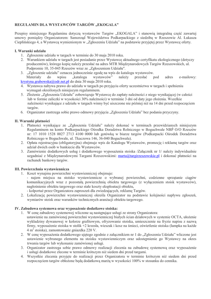 REGULAMIN DLA WYSTAWCÓW TARGÓW „EKOGALA” Przepisy