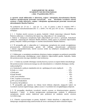 ZARZĄDZENIE NR 48/2011 STAROSTY SZCZECINECKIEGO z dnia 19 października 2011 r. w sprawie zasad oddawania w dzierżawę, najem i obciążania nieruchomości Skarbu Państwa ograniczonymi prawami rzeczowymi oraz określenia wysokości stawek czynszu z tytułu dzierżawy, najmu i obciążania ograniczonymi prawami rzeczowymi nieruchomości Skarbu Państwa. Na podstawie art. 23 ust. 1 oraz art. 11 i art. 13 ustawy z dnia 21 sierpnia 1997 r. o gospodarce nieruchomościami (Dz. U.: z 2010 r. Nr 102, poz. 651 ze zm.) – zarządzam, co następuje: § 1. 1. Ustalam stawki czynszu za grunty, budynki i lokale stanowiące własność Skarbu Państwa oddawane w dzierżawę lub najem wg. załącznika nr 1 do zarządzenia. 2. Ilekroć w niniejszym zarządzeniu bądź załącznikach jest mowa o gruntach, budynkach i lokalach stanowiących własność Skarbu Państwa, należy przez to rozumieć odpowiednio grunty, budynki i lokale pozostające w zasobie nieruchomości Skarbu Państwa. § 2. W przypadku gdy w załączniku nr 1 niniejszego zarządzenia nie zostało uwzględnione przeznaczenie dzierżawionego gruntu lub odbiega zdecydowanie położeniem i stanem zagospodarowania, stawki czynszu ustala się odrębnym zarządzeniem Starosty Szczecineckiego. § 3. Oddawanie w posiadanie przedmiotu dzierżawy/najmu następuje na podstawie protokółu zdawczo-odbiorczego określającego części składowe odpowiednio gruntu, budynku, lokalu lub pomieszczenia oraz jego standard i stan techniczny. § 4. 1. Ustala się czynniki obniżające stawkę bazową czynszu za najem lokalu mieszkalnego lub pomieszczenia wykorzystywanego na cele mieszkaniowe o wskaźnik obniżający stawkę maksymalną(%): a) w budynkach o pełnym standardzie ale nie spełniających norm cieplnych - 5% b) brak c.o. z sieci - 10% c) brak gazu - 10% d) brak łazienki - 10% e) WC poza lokalem - 5% f) WC wspólne na korytarzu - 10% g) WC poza budynkiem - 15% h) sutereny lub poddasze - 10% 2. W przypadku gdy najemca na własny koszt dokona ulepszeń, mających wpływ na wysokość czynszu regulowanego, opłaca czynsz w wysokości nie uwzględniającej ulepszeń. § 5. W przypadku określenia wysokości stawek czynszu za dzierżawę/najem gruntów, budynków i lokali w drodze postępowania przetargowego, ustalone w niniejszym zarządzeniu stawki należy traktować jako podstawę do ustalenia stawki czynszu wywoławczego. § 6. 1.Stawki czynszu/najmu za grunty, budynki i lokale określone w załączniku nr 1 do niniejszego zarządzenia mają zastosowanie do nowo zawieranych umów dzierżaw/najmu. 2. W przypadku zawierania kolejnej umowy dzierżawy/najmu z tym samym dzierżawcą/najemcą, mającej za przedmiot tą samą nieruchomość, stawka czynszu zostanie naliczona wg zasad określonych w niniejszym zarządzeniu, nie może być jednak niższa od stawki dotychczasowej. § 7. W umowie określa się cel na jaki grunt, budynek, lokal w dzierżawę/najem. zostaje oddany § 8. 1. Wysokość czynszu za dzierżawę/najem może ulec zmianie w okresie nie krótszym niż 1 rok. 2. Zmiana wysokości czynszu za dzierżawę/najem następuje z chwilą zmiany przeznaczenia przedmiotu dzierżawy/najmu na inny cel niż określony w umowie. 3. Zmiana wysokości czynszu za dzierżawę/najem gruntu, budynku, lokalu może ulec podwyższeniu nie więcej jednak niż o wskaźnik wzrostu cen towarów i usług konsumpcyjnych publikowany przez Prezesa Głównego Urzędu Statystycznego. Zmiana wysokości czynszu następuje poprzez jednostronne powiadomienie dzierżawcy/najemcy przez właściciela nieruchomości o nowej wysokości czynszu. § 9. 1. Wznoszenie nowych obiektów budowlanych lub dokonywanie innych nakładów na przedmiocie dzierżawy/najmu wymaga każdorazowo pisemnej zgody właściciela gruntu. 2. W razie wzniesienia lub dokonania przez dzierżawcę lub najemcę, bez pisemnej zgody, nakładów na przedmiocie dzierżawy/najmu, właściciel nieruchomości ma prawo zatrzymać ulepszenia bez zapłaty sumy odpowiadającej ich wartości w chwili zwrotu lub żądać przywrócenia stanu poprzedniego. § 10. W przypadku bezumownego zajęcia gruntu, budynku lub lokalu, bądź w przypadku dalszego korzystania z nieruchomości do której umowa najmu/dzierżawy uległa rozwiązaniu lub wygaśnięciu, stosuje się dwukrotne stawki czynszu wynikające z niniejszego zarządzenia. § 11. 1.Stawki czynszu nie obejmują opłat za usługi komunalne, w szczególności: z tytułu utrzymania czystości ulic i chodników przyległych do przedmiotu dzierżawy/najmu, z tytułu dostarczenia energii elektrycznej, gazu, oraz korzystania z kanalizacji sanitarnej, itp. 2. Za usługi wymienione w ust. 1 dzierżawca/najemca ponosi opłaty na zasadach ogólnych. § 12. Dzierżawca/najemca oprócz czynszu zobowiązany jest uiścić podatki i inne ciężary związane z posiadaniem przedmiotu dzierżawy/najmu. § 13. Do stawek czynszu, o których mowa w załączniku nr 1 do niniejszego zarządzenia dolicza się podatek od towarów i usług VAT wg obowiązujących stawek. § 14. 1. Ustalenie odpłatności za ustanowienie ograniczonego prawa rzeczowego (służebność, użytkowanie) następuje na podstawie operatu szacunkowego sporządzonego przez uprawnionego rzeczoznawcę majątkowego. 2. Opłaty za ustanowienie ograniczonego prawa rzeczowego ustala się w następujący sposób: - opłatę roczną za ustanowienie użytkowania prawa rzeczowego ustala się w wysokości określonej w operacie szacunkowym; - jednorazową opłatę za ustanowienie służebności ustala się w wysokości określonej w operacie szacunkowym 3. Wszelkie koszty związane z ustanawianiem ograniczonego prawa rzeczowego, w szczególności: koszty notarialne, koszty sądowe , koszty operatu szacunkowego, koszty dokumentacji geodezyjnej ponosi osoba zainteresowana ustanowieniem ograniczonego prawa rzeczowego. § 15. Wykonanie zarządzenia powierza się Geodecie Powiatowemu. § 16. Zarządzenie wchodzi w życie z dniem podpisani