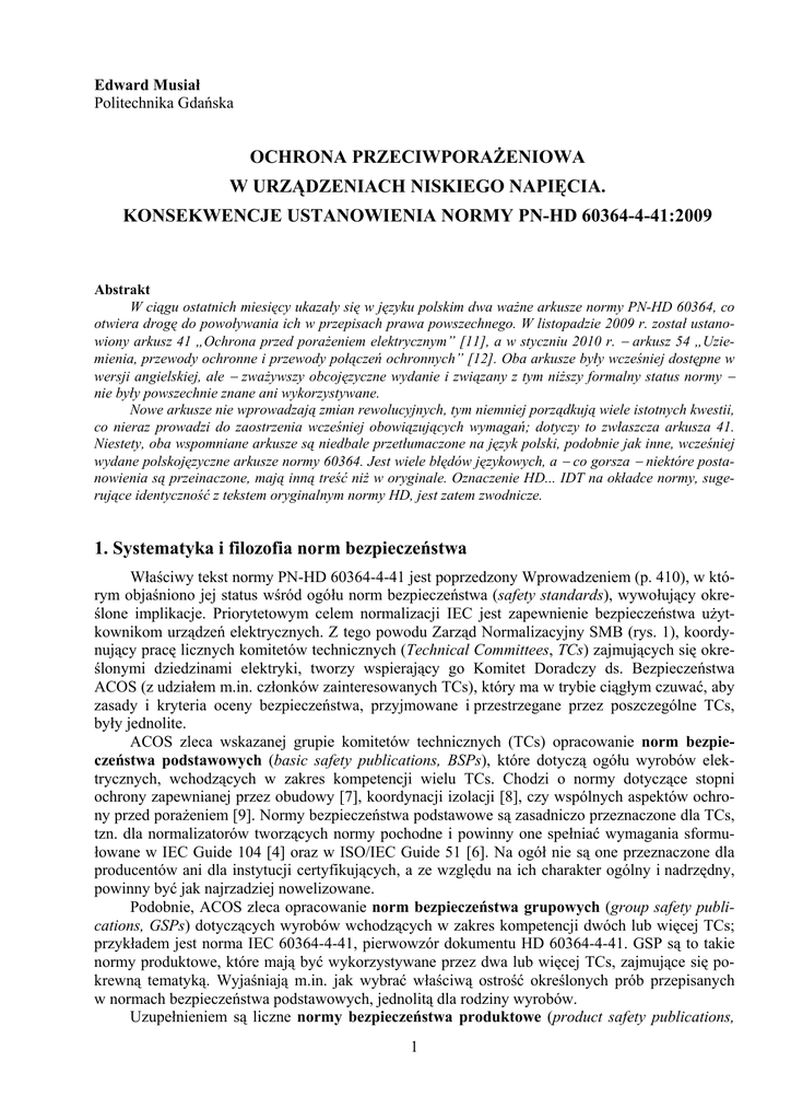 Edward Musiał Politechnika Gdańska OCHRONA PRZECIWPORAŻENIOWA W URZĄDZENIACH NISKIEGO NAPIĘCIA. KONSEKWENCJE USTANOWIENIA NORMY PN-HD 60364-4-41:2009 Abstrakt W ciągu ostatnich miesięcy ukazały się w języku polskim dwa ważne arkusze normy PN-HD 60364, co otwiera drogę do powoływania ich w przepisach prawa powszechnego. W listopadzie 2009 r. został ustanowiony arkusz 41 „Ochrona przed porażeniem elektrycznym” [11], a w styczniu 2010 r. − arkusz 54 „Uziemienia, przewody ochronne i przewody połączeń ochronnych” [12]. Oba arkusze były wcześniej dostępne w wersji angielskiej, ale − zważywszy obcojęzyczne wydanie i związany z tym niższy formalny status normy − nie były powszechnie znane ani wykorzystywane. Nowe arkusze nie wprowadzają zmian rewolucyjnych, tym niemniej porządkują wiele istotnych kwestii, co nieraz prowadzi do zaostrzenia wcześniej obowiązujących wymagań; dotyczy to zwłaszcza arkusza 41. Niestety, oba wspomniane arkusze są niedbale przetłumaczone na język polski, podobnie jak inne, wcześniej wydane polskojęzyczne arkusze normy 60364. Jest wiele błędów językowych, a − co gorsza − niektóre postanowienia są przeinaczone, mają inną treść niż w oryginale. Oznaczenie HD... IDT na okładce normy, sugerujące identyczność z tekstem oryginalnym normy HD, jest zatem zwodnicze. 1. Systematyka i filozofia norm bezpieczeństwa Właściwy tekst normy PN-HD 60364-4-41 jest poprzedzony Wprowadzeniem (p. 410), w którym objaśniono jej status wśród ogółu norm bezpieczeństwa (safety standards), wywołujący określone implikacje. Priorytetowym celem normalizacji IEC jest zapewnienie bezpieczeństwa użytkownikom urządzeń elektrycznych. Z tego powodu Zarząd Normalizacyjny SMB (rys. 1), koordynujący pracę licznych komitetów technicznych (Technical Committees, TCs) zajmujących się określonymi dziedzinami elektryki, tworzy wspierający go Komitet Doradczy ds. Bezpieczeństwa ACOS (z udziałem m.in. członków zainteresowanych TCs), który ma w trybie ciągłym czuwać, aby zasady i kryteria oceny bezpieczeństwa, przyjmowane i przestrzegane przez poszczególne TCs, były jednolite. ACOS zleca wskazanej grupie komitetów technicznych (TCs) opracowanie norm bezpieczeństwa podstawowych (basic safety publications, BSPs), które dotyczą ogółu wyrobów elektrycznych, wchodzących w zakres kompetencji wielu TCs. Chodzi o normy dotyczące stopni ochrony zapewnianej przez obudowy [7], koordynacji izolacji [8], czy wspólnych aspektów ochrony przed porażeniem [9]. Normy bezpieczeństwa podstawowe są zasadniczo przeznaczone dla TCs, tzn. dla normalizatorów tworzących normy pochodne i powinny one spełniać wymagania sformułowane w IEC Guide 104 [4] oraz w ISO/IEC Guide 51 [6]. Na ogół nie są one przeznaczone dla producentów ani dla instytucji certyfikujących, a ze względu na ich charakter ogólny i nadrzędny, powinny być jak najrzadziej nowelizowane. Podobnie, ACOS zleca opracowanie norm bezpieczeństwa grupowych (group safety publications, GSPs) dotyczących wyrobów wchodzących w zakres kompetencji dwóch lub więcej TCs; przykładem jest norma IEC 60364-4-41, pierwowzór dokumentu HD 60364-4-41. GSP są to takie normy produktowe, które mają być wykorzystywane przez dwa lub więcej TCs, zajmujące się pokrewną tematyką. Wyjaśniają m.in. jak wybrać właściwą ostrość określonych prób przepisanych w normach bezpieczeństwa podstawowych, jednolitą dla rodziny wyrobów. Uzupełnieniem są liczne normy bezpieczeństwa produktowe (product safety publications, 1 PSPs) obejmujące wszelkie aspekty bezpieczeństwa jednego lub więcej wyrobów wchodzących w zakres kompetencji pojedynczego komitetu technicznego (TC). Wyrób powinien być inherentnie bezpieczny w następstwie jego koncepcji i wykonania. Jeśli to nieosiągalne, to należy wskazać środki ochrony stosowne do zagrożeń. Jeśli mimo to pozostaje jakiekolwiek zagrożenie niezminimalizowane do akceptowalnego poziomu (ryzyka szczątkowego), to użytkownik powinien być o tym poinformowany. Zarazem powinien być pouczony, jakie przeszkolenia i/lub jakie indywidualne środki ochrony są potrzebne w celu zmniejszenia zagrożenia do poziomu akceptowalnego. Między tymi trzema poziomami norm bezpieczeństwa obowiązuje zależność hierarchiczna: dokument niższego szczebla może uszczegółowić lub uzupełnić postanowienia dokumentu wyższego szczebla, ale nie powinien ich w żaden sposób modyfikować. Rys. 1. Relacje między normami bezpieczeństwa różnej rangi [5] w pracach IEC Podstawowa zasada ochrony przed porażeniem elektrycznym, sformułowana w punkcie 4 normy bezpieczeństwa podstawowej [9] głosi, że części czynne niebezpieczne nie powinny być dostępne, a części przewodzące dostępne nie powinny być niebezpieczne: ani w warunkach normalnego użytkowania, ani w warunkach pojedynczego uszkodzenia. Za warunki normalnego użytkowania (normal conditions) uważa się sytuację, kiedy urządzenie jest używane zgodnie z przeznaczeniem, a wszelkie przewidziane środki ochrony są sprawne [4]. Porażeniom prądem w warunkach normalnego użytkowania ma zapobiegać 1. stopień ochrony, ochrona przeciwporażeniowa podstawowa, wymagana powszechnie, poza nielicznymi wyjątkowymi sytuacjami. Za warunki pojedynczego uszkodzenia (single fault conditions) uważa się [4, 9] niesprawność jednego ze środków ochrony − z wyłączeniem środka ochrony wzmocnionej − bądź wprowadzające zagrożenie uszkodzenie jakiegokolwiek pojedynczego elementu (tzw. uszkodzenie niebezpieczne). Obejmuje to również sytuacje, kiedy jedno uszkodzenie nieuchronnie wywołuje niesprawność więcej niż jednego elementu. Porażeniom prądem w warunkach pojedynczego uszkodzenia ma zapobiegać 2. stopień ochrony, ochrona przeciwporażeniowa dodatkowa (ochrona przy uszkodzeniu), wymagana powszechnie, poza nielicznymi ściśle określonymi wyjątkami. W okre