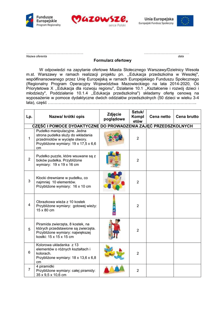 …………………………………………………. Nazwa oferenta ………………………………………. data Formularz ofertowy W odpowiedzi na zapytanie ofertowe Miasta Stołecznego Warszawy/Dzielnicy Wesoła m.st. Warszawy w ramach realizacji projektu pn. ,,Edukacja przedszkolna w Wesołej", współfinansowanego przez Unię Europejską w ramach Europejskiego Funduszu Społecznego (Regionalny Program Operacyjny Województwa Mazowieckiego na lata 2014-2020, Oś Priorytetowa X ,,Edukacja dla rozwoju regionu", Działanie 10.1 ,,Kształcenie i rozwój dzieci i młodzieży", Poddziałanie 10.1.4 ,,Edukacja przedszkolna") składamy ofertę cenową na wyposażenie w pomoce dydaktyczne dwóch oddziałów przedszkolnych (50 dzieci w wieku 3-4 lata), część ……………………………………………………………………………………………….. Sztuk/ Kompl Cena netto Cena brutto etów CZĘŚĆ I POMOCE DYDAKTYCZNE DO PROWADZENIA ZAJĘĆ PRZEDSZKOLNYCH Zdjęcie poglądowe Lp. Nazwa/ krótki opis 1 Pudełko manipulacyjne. Jedna strona pudełka służy do wkładania przedmiotów w wycięte otwory. Przybliżone wymiary: 19 x 17,5 x 6,6 cm 2 2 Pudełko puzzle, które wsuwane są z boków pudełka. Przybliżone wymiary: 19 x 19 x 16 cm 2 3 Klocki drewniane w pudełku, co najmniej 10 elementów. Przybliżone wymiary: 16 x 10 cm 2 4 Obrazkowa wieża z 10 kostek Przybliżone wymiary: gotowej wieży: 15 x 80 cm 2 5 Piramida zwierzęta, 8 kostek, na których przedstawione są zwierzęta. Przybliżone wymiary: największej kostki: 15 x 15 x 15 cm 2 6 7 Kolorowa układanka z 13 elementów o różnych kształtach i kolorach. Przybliżone wymiary: 18 x 13,6 x 6,8 cm 4 piramidki Przybliżone wymiary: całej piramidy: 35 x 9,5 x 10,6 cm 2 2 8 Magnetyczna wieża. Koła układane są za pomocą magnesu, który wbudowany jest w każdy element. Przybliżone wymiary: średnica: 9,5 cm, wysokość: 21 cm 2 9 Pajacyk Przybliżone wymiary: średnica: 11,5 cm, wysokość: 19,5 cm 2 10 Wieża motoryczna Kolorowe kształty, zestaw co najmniej 16 klocków oraz podstawy z drewna. Przybliżone wymiary: 26,1 x 13,9 x 6,9 cm 11 Figurki do nawlekania Co najmniej 8 kolorowych figurek, do nawlekania według koloru lub kształtu. Zestaw co najmniej: 12 plansz, 80 figurek i 10 sznurowadeł o długości 1 m 2 12 Przewlekana Przybliżone wymiary największego elementu: 7 x 3 x 8 cm 2 13 14 15 16 17 18 Mozaika w pudełku Zestaw co najmniej 400 plastikowych grzybków o średnicy 1,5 cm, 1 tabliczkę o wymiarach 28 x 20 cm, 10 arkuszy z obrazkami, drewniane pudełko. Przybliżone wymiary pudełka: 40 x 34 x 9 cm Mozaika duża Zestaw co najmniej 240 grzybków w 4 kształtach i 4 kolorach. Średnica grzybka, co najmniej 39 mm. Puzzle edukacyjne. Zestaw zawiera 4 puzzle, każdy po 8 elementów. Przybliżone wymiary puzzli: 15 x 15 cm Układanka edukacyjno-dydaktyczna o dobrym wychowaniu. Zestaw 24 plakietki o wym. 11,8 cm x 10,8 cm oraz 45 żetonów. Przybliżone wymiary: opakowania: 37 x 22 x 5 cm Dobre zachowanie. Zapoznanie dzieci z podstawowymi zasadami ochrony przyrody. Zestaw 17 par kart, które pokazują różne sposoby zachowania. Gra zawiera co najmniej 34 karty. Przybliżone wymiary: karty: 9 x 9 cm Puzzle pianka – dzikie zwierzęta co najmniej 6 figurek z obrazkami. Przybliżone wymiary: 18 x 28 cm 2 2 2 2 2 2 2 19 20 21 Puzzle pianka – domowe zwierzęta co najmniej 6 figurek z obrazkami. Przybliżone wymiary: 18 x 28 cm 2 Piankowy dywan z 6 kwadratów przedstawiających obrazki np. zwierząt. Przybliżone wymiary: 1 kwadratu : 32 x 32 cm Grubość: 8 mm Przybliżone wymiary rozłożonego dywanu: 90 x 60 cm Guziki do nawlekania zestaw co najmniej100 kolorowych guzików (czerwone, zielone, niebieskie, żółte) z 1 do 5 otworami na nawlekanie. Zestaw zawiera co najmniej: 8 sznurków o długości 75 cm i 8 końcówek. Przybliżone wymiary opakowania: 29 x 24,5 x 17 cm 2 2 22 Tabliczka do Mozaiki w pudełku Przybliżone wymiary: 28 x 20 cm 23 Puszki zapachowe - 12 słoiczków z tworzywa sztucznego, do włożenia naturalnych zapachów. Przybliżone wymiary 12 x 28 x 7 cm 24 Puzzle umożliwiające zapoznanie z budową zwierząt np.: koń, żaba, ptak, i inne. Przybliżone wymiary: 24 x 24 cm 25 Ramka do zapinania guzików Przybliżone wymiary: 32 x 31 x 2,5 cm 2 26 Ramka do zapinania napy Przybliżone wymiary: 32 x 31 x 2,5 cm 2 27 Ramka do sznurowania Przybliżone wymiary: 32 x 31 x 2,5 cm 2 28 Puszki dźwiękowe, które wydają różne tony dźwięków. Przybliżone wymiary podstawy 30 x 16 x 2 cm, 8 szt. puszek o wym. 6 x 6 x 4 cm 29 Blok z cylindrami do nauki pojęcia: duży, mały. Przybliżone wymiary: 48 x 10 x 9 cm 30 Taca/tablet do ćwiczeń przelewanie, w zestawie z dwoma naczyniami do 2 Brak zdjęcia 2 6 różnych szt. Brak zdjęcia 2 2 Brak zdjęcia 2 31 32 przelewania i gąbką. Przybliżone wymiary tacy/tabletu: 20 x 25 cm Taca/tablet do ćwiczeń przekładanie. W zestawie trzy naczynia i komplet kulek do przekładania. Przybliżone wymiarytacy/tabletu: 20 x 25 cm Taca/tablet do ćwiczeń nabieranie. W zestawie dwa naczynia i łyżka do nabierania. Przybliżone wymiary tacy/tabletu: 20 x 25 cm Brak zdjęcia 2 Brak zdjęcia 2 33 Klocki duże, • wym. od ok. 2,5 x 5 cm do 7 x 5 cm • 75 klocków 2 34 Klocki Przybliżone wymiary: od ok. 2,5 x 5 cm do 7 x 5 cm • 240 elementów 2 35 Klocki domek Około 130 elementów 2 36 Klocki konstrukcyjne w różnych kształtach i kolorach. • 100 elementów o wym. 5 x 5 cm 2 37 38 39 Klocki konstrukcyjne w różnych kształtach i kolorach. • 60 elem. o wym. od 4 x 1,5 do 6,5 x 6,5 cm Klocki o nietypowym sposobie łączenia, który daje możliwość budowy płaskich, jak i przestrzennych konstrukcji. W zestawie instrukcja budowy. • wym. klocka 5 x 5 cm Zestaw zawiera: Co najmniej 510 klocków CLICS Przybliżone wymiary pudełka: 39,4 x 28,7 x 28,9 cm Klocki o różnorodnych kształtach, dające się łatwo składać w zwierzęta. W zes