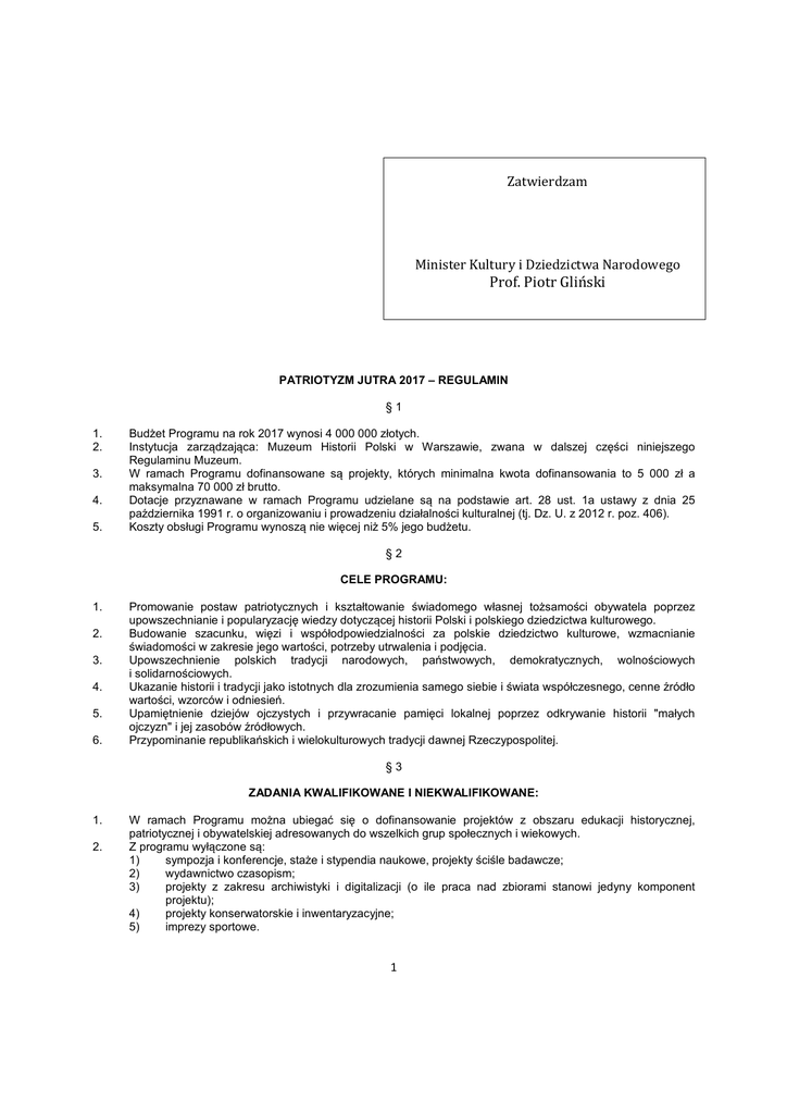 Zatwierdzam Minister Kultury i Dziedzictwa Narodowego Prof. Piotr Gliński PATRIOTYZM JUTRA 2017 – REGULAMIN §1 1. 2. 3. 4. 5. Budżet Programu na rok 2017 wynosi 4 000 000 złotych. Instytucja zarządzająca: Muzeum Historii Polski w Warszawie, zwana w dalszej części niniejszego Regulaminu Muzeum. W ramach Programu dofinansowane są projekty, których minimalna kwota dofinansowania to 5 000 zł a maksymalna 70 000 zł brutto. Dotacje przyznawane w ramach Programu udzielane są na podstawie art. 28 ust. 1a ustawy z dnia 25 października 1991 r. o organizowaniu i prowadzeniu działalności kulturalnej (tj. Dz. U. z 2012 r. poz. 406). Koszty obsługi Programu wynoszą nie więcej niż 5% jego budżetu. §2 CELE PROGRAMU: 1. 2. 3. 4. 5. 6. Promowanie postaw patriotycznych i kształtowanie świadomego własnej tożsamości obywatela poprzez upowszechnianie i popularyzację wiedzy dotyczącej historii Polski i polskiego dziedzictwa kulturowego. Budowanie szacunku, więzi i współodpowiedzialności za polskie dziedzictwo kulturowe, wzmacnianie świadomości w zakresie jego wartości, potrzeby utrwalenia i podjęcia. Upowszechnienie polskich tradycji narodowych, państwowych, demokratycznych, wolnościowych i solidarnościowych. Ukazanie historii i tradycji jako istotnych dla zrozumienia samego siebie i świata współczesnego, cenne źródło wartości, wzorców i odniesień. Upamiętnienie dziejów ojczystych i przywracanie pamięci lokalnej poprzez odkrywanie historii "małych ojczyzn" i jej zasobów źródłowych. Przypominanie republikańskich i wielokulturowych tradycji dawnej Rzeczypospolitej. §3 ZADANIA KWALIFIKOWANE I NIEKWALIFIKOWANE: 1. 2. W ramach Programu można ubiegać się o dofinansowanie projektów z obszaru edukacji historycznej, patriotycznej i obywatelskiej adresowanych do wszelkich grup społecznych i wiekowych. Z programu wyłączone są: 1) sympozja i konferencje, staże i stypendia naukowe, projekty ściśle badawcze; 2) wydawnictwo czasopism; 3) projekty z zakresu archiwistyki i digitalizacji (o ile praca nad zbiorami stanowi jedyny komponent projektu); 4) projekty konserwatorskie i inwentaryzacyjne; 5) imprezy sportowe. 1 §4 TERMIN I TRYB NABORU WNIOSKÓW: 1. 2. Nabór wniosków odbywa się do 5 marca 2017 r. włącznie. Wnioski powinny być składane w formie elektronicznej za pomocą generatora wniosków dostępnego na stronie internetowej Muzeum: www.muzhp.pl i http://formularze.patriotyzmjutra.pl/. §5 UPRAWNIENI WNIOSKODAWCY (WYŁĄCZNIE PODMIOTY PRAWA POLSKIEGO): Wnioskodawcami mogą być: 1) 2) Organizacje pozarządowe, tj. niebędące jednostkami sektora finansów publicznych, w rozumieniu ustawy o finansach publicznych oraz niedziałające w celu osiągnięcia zysku osoby prawne lub jednostki organizacyjne nieposiadające osobowości prawnej, którym odrębna ustawa przyznaje zdolność prawną, w tym fundacje i stowarzyszenia; Samorządowe instytucje kultury. §6 Wnioskodawcami nie mogą być państwowe instytucje kultury, szkoły i uczelnie artystyczne nadzorowane przez Ministra Kultury i Dziedzictwa Narodowego, instytucje kultury współprowadzone przez Ministra, stowarzyszenia zwykłe oraz kościelne osoby prawne i kościelne jednostki organizacyjne. §7 WYMAGANE WARUNKI FINANSOWE I ORGANIZACYJNE: 1. 2. 3. 4. 5. 6. 7. 8. 9. W ramach Programu dofinansowane są projekty realizowane w ramach roku kalendarzowego (maksymalnie do 15 grudnia 2017 r.). W ramach Programu nie będą finansowane koszty poniesione przez Wnioskodawcę przed ogłoszeniem decyzji Zespołu Sterującego o przyznaniu dotacji. Projekty realizowane w ramach Programu odbywają się na terenie Rzeczypospolitej Polskiej. W uzasadnionych przypadkach, za zgodą Dyrektora Muzeum, część działań projektowych może odbywać się za granicą. W sytuacji, gdy Wnioskodawca ubiega się o zgodę Dyrektora Muzeum na realizację części działań za granicą zobowiązany jest umieścić we wniosku stosowną informację na ten temat wraz z merytorycznym uzasadnieniem. Wniosek nie zawierający takiego uzasadnienia zostanie odrzucony jako błędny formalnie. Jeden Wnioskodawca ma prawo złożyć maksymalnie dwa wnioski w jednym naborze. Dotacja ma charakter celowy i przeznaczona jest na realizację jednej edycji przedsięwzięcia. Maksymalna kwota wnioskowanego dofinansowanego wynosi: 1) 30 000 zł dla projektów, w przypadku których wkład własny wynosi nie mniej niż 10% budżetu przedstawionego we wniosku; 2) 70 000 zł dla projektów, w przypadku których wkład własny wynosi nie mniej niż 20% budżetu przedstawionego we wniosku. Za finansowy wkład własny uznaje się jedynie środki finansowe zgromadzone na rachunku Wnioskodawcy, które Wnioskodawca obowiązany jest posiadać w chwili podpisania umowy. Wkład własny może pochodzić z innych dotacji ze środków publicznych i prywatnych, pod warunkiem, że nie jest rozliczany w ramach innego projektu. Posiadanie wymaganego wkładu własnego Wnioskodawca obowiązany jest udokumentować przy podpisaniu umowy wyciągiem z rachunku bankowego lub stosownym zaświadczeniem banku prowadzącego rachunek Wnioskodawcy. Za finansowy wkład własny nie uznaje się pracy wolontariuszy. Wnioskodawca musi znajdować się w sytuacji finansowej zapewniającej wykonanie projektu oraz dysponować niezbędną wiedzą, doświadczeniem, potencjałem ekonomicznym i technicznym do jego wykonania. Oceniając spełnianie tego kryterium, Muzeum może wykorzystać wiedzę o innych projektach realizowanych przez Wnioskodawcę oraz informacje pochodzące z raportów o ich wykonaniu lub kontroli ich realizacji 2 10. 11. dokonywanych przez Muzeum oraz inne informacje powszechnie dostępne lub przedstawione przez Wnioskodawcę we wniosku lub na żądanie Muzeum. W kosztorysie projektu należy uwzględnić wyłącznie koszty niezbędne do jego realizacji. Nie może być w nim uwzględniony podatek od towarów i usług (VAT), w wysokości której przysługuje prawo do j