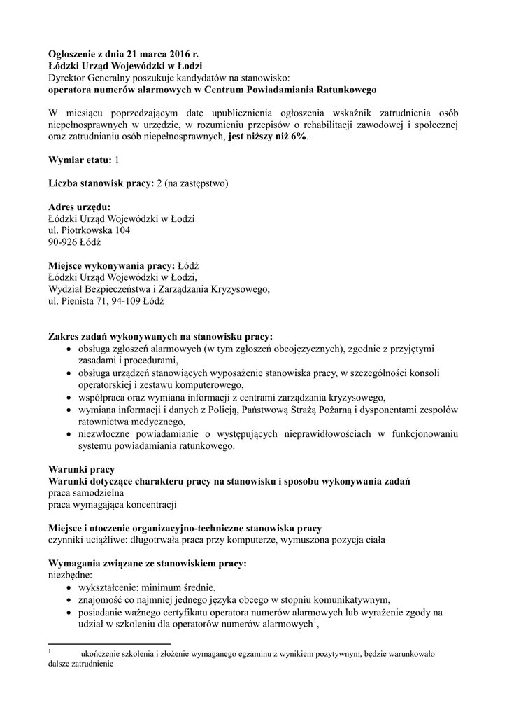 Ogłoszenie z dnia 21 marca 2016 r. Łódzki Urząd Wojewódzki w Łodzi Dyrektor Generalny poszukuje kandydatów na stanowisko: operatora numerów alarmowych w Centrum Powiadamiania Ratunkowego W miesiącu poprzedzającym datę upublicznienia ogłoszenia wskaźnik zatrudnienia osób niepełnosprawnych w urzędzie, w rozumieniu przepisów o rehabilitacji zawodowej i społecznej oraz zatrudnianiu osób niepełnosprawnych, jest niższy niż 6%. Wymiar etatu: 1 Liczba stanowisk pracy: 2 (na zastępstwo) Adres urzędu: Łódzki Urząd Wojewódzki w Łodzi ul. Piotrkowska 104 90-926 Łódź Miejsce wykonywania pracy: Łódź Łódzki Urząd Wojewódzki w Łodzi, Wydział Bezpieczeństwa i Zarządzania Kryzysowego, ul. Pienista 71, 94-109 Łódź Zakres zadań wykonywanych na stanowisku pracy: obsługa zgłoszeń alarmowych (w tym zgłoszeń obcojęzycznych), zgodnie z przyjętymi zasadami i procedurami, obsługa urządzeń stanowiących wyposażenie stanowiska pracy, w szczególności konsoli operatorskiej i zestawu komputerowego, współpraca oraz wymiana informacji z centrami zarządzania kryzysowego, wymiana informacji i danych z Policją, Państwową Strażą Pożarną i dysponentami zespołów ratownictwa medycznego, niezwłoczne powiadamianie o występujących nieprawidłowościach w funkcjonowaniu systemu powiadamiania ratunkowego. Warunki pracy Warunki dotyczące charakteru pracy na stanowisku i sposobu wykonywania zadań praca samodzielna praca wymagająca koncentracji Miejsce i otoczenie organizacyjno-techniczne stanowiska pracy czynniki uciążliwe: długotrwała praca przy komputerze, wymuszona pozycja ciała Wymagania związane ze stanowiskiem pracy: niezbędne: wykształcenie: minimum średnie, znajomość co najmniej jednego języka obcego w stopniu komunikatywnym, posiadanie ważnego certyfikatu operatora numerów alarmowych lub wyrażenie zgody na udział w szkoleniu dla operatorów numerów alarmowych1, 1 ukończenie szkolenia i złożenie wymaganego egzaminu z wynikiem pozytywnym, będzie warunkowało dalsze zatrudnienie dodatkowe: znajomość przepisów ustaw o: wojewodzie i administracji rządowej w województwie, o Państwowej Straży Pożarnej, Państwowym Ratownictwie Medycznym, Policji, zarządzaniu kryzysowym oraz systemie powiadamiania ratunkowego wraz z przepisami wydanymi na jej podstawie, umiejętność posługiwania się sprzętem teleinformatycznym, umiejętność skutecznej komunikacji i precyzyjnego przekazywania informacji, umiejętność samodzielnego podejmowania decyzji pod presją czasu, umiejętność pracy w zespole, odporność na stres, dyspozycyjność. Wymagane dokumenty i oświadczenia: życiorys i list motywacyjny, oświadczenie kandydata o wyrażeniu zgody na przetwarzanie danych osobowych do celów rekrutacji, oświadczenie kandydata o korzystaniu z pełni praw publicznych, oświadczenie kandydata o nieskazaniu prawomocnym wyrokiem za umyślne przestępstwo lub umyślne przestępstwo skarbowe, oświadczenie kandydata o posiadaniu (lub braku) orzeczonego stopnia niepełnosprawności, kopie dokumentów potwierdzających wykształcenie, kopia dokumentu potwierdzającego posiadanie polskiego obywatelstwa lub oświadczenie o posiadaniu obywatelstwa polskiego, kopia ważnego certyfikatu operatora numerów alarmowych lub pisemne oświadczenie o wyrażeniu zgody na udział w szkoleniu dla operatorów numerów alarmowych, kopie dokumentów potwierdzających znajomość języka obcego lub pisemne oświadczenie kandydata o znajomości języka obcego w stopniu komunikatywnym. Termin składania dokumentów: 30-03-2016 r. Miejsce składania dokumentów: Łódzki Urząd Wojewódzki w Łodzi Punkt Obsługi Klienta – bud. C, parter ul. Piotrkowska 104, 90-926 Łódź z dopiskiem „Oferta pracy – operator numerów alarmowych” Inne informacje: Proponowane wynagrodzenie brutto: 1.850 zł, zaś od następnego miesiąca po złożeniu wymaganego egzaminu z wynikiem pozytywnym: 2.500 zł + dodatek stażowy Przewidywany termin zatrudnienia: po 4 kwietnia 2016 r.(umowa w ramach zastępstwa nieobecnego pracownika) Pierwsza umowa o pracę zostanie zawarta na czas określony 7 miesięcy. Praca w równoważnym systemie czasu pracy. Oferta złożona po terminie lub niezawierająca wszystkich "Wymaganych dokumentów i oświadczeń" nie podlega rozpatrzeniu. W przypadku złożenia oferty drogą pocztową za datę złożenia oferty uważa się datę jej nadania w polskiej placówce pocztowej. Kandydaci spełniający wymagania formalne, którzy - po analizie ofert - zostaną zakwalifikowani do kolejnego etapu naboru, będą powiadomieni o terminie jego przeprowadzenia. Prosimy o podawanie adresów e-mail (informacja o dalszych etapach może być przesłana w formie elektronicznej). Informujemy, iż na podstawie art. 24 ust. 1 pkt 3 ustawy z dnia 29 sierpnia 1997 r. o ochronie danych osobowych (Dz.U. z 2014 r., poz. 1182, z późn. zm.) każdy kandydat ma prawo dostępu do treści swoich danych oraz ich poprawiania. Siedziba administratora danych : Łódzki Urząd Wojewódzki w Łodzi ul. Piotrkowska 104 90-926 Łódź. Oferty odrzucone zostaną komisyjnie zniszczone po upływie roku od daty ogłoszenia naboru. Dodatkowe informacje można uzyskać pod nr tel. 42 664-16-60 lub 42 664-16-51.