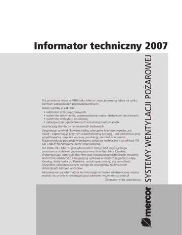 Od powstania firmy w 1988 roku Mercor zajmuje pozycję lidera na rynku biernych zabezpieczeń przeciwpożarowych. Nasze wyroby w zakresie: • oddzieleń przeciwpożarowych, • systemów oddymiania, odprowadzania ciepła i doświetleń dachowych, • systemów wentylacji pożarowej, • zabezpieczeń ogniochronnych konstrukcji budowlanych wyznaczają standardy na krajowych budowach. Dysponując wykwalifikowaną kadrą, oferujemy klientom wyroby „na miarę”, zapewniając przy tym wszechstronną obsługę – od doradztwa przy projektowaniu, poprzez wycenę, produkcję, montaż oraz serwis. Nasze produkty posiadają wymagane aprobaty techniczne i certyfikaty ITB lub CNBOP honorowane przez straż pożarną. Od 2006 roku Mercor jest właścicielem firmy Hasil, największego producenta oddzieleń przeciwpożarowych w Republice Czeskiej. Wykorzystując potencjał obu firm oraz nowoczesne technologie, możemy skutecznie wzmacniać silną pozycję rynkową w naszym regionie Europy. Katalog, który trafia do Państwa, został opracowany, aby umożliwić wszystkim zainteresowanym dostęp do szczegółów technicznych dotyczących naszych wyrobów. Aktualną wersję informatora technicznego w formie elektronicznej można znaleźć na stronie internetowej pod adresem: www.mercor.com.pl Zapraszamy do współpracy. SYSTEMY WENTYLACJI POŻAROWEJ Informator techniczny 2007 Systemy wentylacji pożarowej informator techniczny 2007 redakcja: Mercor – Zespół Działu Wentylacji projekt okładki: Jerzy Wojciech Wołodźko opracowanie graficzne i skład komputerowy: gato studio graficzne grzegorz petrycki ©2007 MERCOR Gdańsk (30.06.2007) spis treści 1. wstęp 5 2. mcr OMEGA – centrale sterujące systemami wentylacji pożarowej 9 3. mcr FID S – przeciwpożarowe klapy jednopłaszczyznowe – odcinające i oddymiające 12 4. mcr FID PRO – przeciwpożarowe klapy jednopłaszczyznowe – odcinające i oddymiające 23 5. mcr DOR – przeciwpożarowe klapy oddymiające drzwiowe 31 6. mcr WIP – przeciwpożarowe klapy żaluzjowe – odcinające 36 7. mcr FS – przeciwpożarowe klapy transferowe 43 8. mechanizmy wyzwalająco-sterujące, wyłączniki krańcowe 50 9. kratki osłonowe – maskownice 70 10. THT/CJTHT – osiowe wentylatory oddymiające 74 11. HCT/CJHCH – osiowe wentylatory nawiewno-wyciągowe 84 12. mcr PL – klapy nadciśnieniowe – upustowe 90 13. mcr VERMITEC D – samonośne przewody wentylacyjne i oddymiające 93 wstęp Obowiązujące przepisy wymagają, aby budynki były zaprojektowane i wykonane w sposób zapewniający możliwość ewakuacji ludzi w czasie pożaru z uwzględnieniem bezpieczeństwa ekip ratowniczych. Podstawowym elementem projektu, podlegającym uzgodnieniu z rzeczoznawcą do spraw zabezpieczeń przeciwpożarowych, jest prawidłowy dobór odpowiednich urządzeń przeciwpożarowych wynikający z wymagań przyjętego scenariusza rozwoju zdarzeń w czasie pożaru. Jednym z ważniejszych elementów ochrony przeciwpożarowej jest ochrona przed zadymieniem zapewniana przez mechaniczną wentylację pożarową. Na systemy wentylacji pożarowej składają się: • klapy odcinające, • klapy odcinające do systemów wentylacji pożarowej (tzw. klapy oddymiające), • klapy transferowe, • wentylatory oddymiające, • wentylatory napowietrzające, • centrale sterujące urządzeniami oddymiającymi i oddzieleniami. Poniżej prezentujemy przykładowy scenariusz rozwoju zdarzeń w czasie pożaru zrealizowany z wykorzystaniem urządzeń firmy MERCOR pozwalający na: • zabezpieczenie dróg ewakuacyjnych przed zadymieniem, • bezpieczną ewakuację ze strefy objętej pożarem, • ograniczenie ryzyka wystąpienia paniki wśród ludzi znajdujących się w pozostałych strefach pożarowych, • umożliwienie przeprowadzenia skutecznej i bezpiecznej akcji ratowniczo-gaśniczej. 1.1. scenariusz rozwoju zdarzeń w czasie pożaru w części dotyczącej wentylacji pożarowej schemat graficzny procedura urządzenia realizujące scenariusz Centrala CSP przekazuje sygnał alarmu pożarowego uruchamiającego centrale sterujące urządzeniami oddymiającymi i oddzieleniami. mcr OMEGA Odcięcie strefy objętej pożarem przez wydzielenie jej przeciwpożarowymi klapami odcinającymi. mcr OMEGA Klapy odcinające: mcr FID S mcr WIP mcr FID PRO mcr OMEGA Uruchomienie wentylatorów napowietrzających, otwarcie klap oddymiających (wentylacji pożarowej) i, po odpowiedniej zwłoce czasowej, uruchomienie wentylatorów oddymiających. Otwarcie przepustnic zabezpieczających klapy upustowe. Praca klap upustowych. Klapy oddymiające: Wentylatory: mcr DOR mcr FID S mcr FID PRO CJTHT VDB THT mcr PL Centrala sterująca urządzeniami oddymiającymi i oddzieleniami zbiera informacje i przekazuje potwierdzenia wysterowania urządzeń do systemów CSP i BMS. mcr OMEGA Bezpieczna ewakuacja ludzi ze strefy objętej pożarem. W pozostałych strefach wszystkie instalacje, w tym instalacja wentylacji i klimatyzacji, mogą działać normalnie. Nie są rozgłaszane komunikaty o zagrożeniu dla uniknięcia paniki i wystąpienia niekontrolowanej ewakuacji. W razie konieczności przeprowadzana jest ewakuacja ludzi z pozostałych stref dotychczas nieobjętych pożarem. mcr FS mcr WIP Mercor SA, ul. Grzegorza z Sanoka 2, 80-408 Gdańsk, tel.: (+48) 058 341 42 45, fax: (+48) 058 341 39 85 HCT HCH 5 wstęp 1.2. przykłady zastosowania klap odcinających, oddymiających i transferowych, klap nadciśnieniowych, wentylatorów oddymiających i napowietrzających dla zabezpieczenia przeciwpożarowego obiektów str. 36 str. 90 6 str. 43 str. 74 str. 84 str. 31 str. 12 str. 23 systemy wentylacji pożarowej – informator techniczny 2007 wstęp 1.3. tabela wstępnego doboru klap przeciwpożarowych wymiary klap minimalna grubość ściany z zabudowaną klapą miejsce wbudowania odporność ogniowa przeznaczenie typy klap mcr FID S mcr FID PRO klapy odcinające do przewodów wentylacji i klimatyzacji x x klapy oddymiają