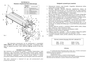 INSTRUKCJA MontaŜu i eksploatacji haka holowniczego 14 Oznaczenie zacisku wg ISO PN 1 L 2 + 3 31 4 R 5 58R 6 54 7 58L A A Kolejność czynności przy montaŜu Łączenie przewodów Kierunkowskazy lewe Tylne światła przeciwmgłowe Masa Kierunkowskazy prawe Światła pozycyjne prawe Światła hamowania Światła pozycyjne lewe 15 3 B E 16 10 D F 8 B 5 11 7 13 C 6 D Rys.1 4 7 23 9 1 2 Hak holowniczy przeznaczony jest do zamontowania w samochodzie OPEL OMEGA „B” 4 drz. produkowanego od 04.1994r., nr katalogowy E16 i słuŜy do ciągnięcia przyczep o masie całkowitej 2100 kg i nacisku na kulę max 75 kg. INFORMACJA WSTĘPNA Hak holowniczy jest skonstruowany zgodnie z zasadami bezpieczeństwa ruchu drogowego a jego niezawodność została potwierdzona licznymi testami. JednakŜe niezawodność haków holowniczych jest zaleŜna równieŜ od prawidłowego montaŜu oraz prawidłowej eksploatacji. Z tego powodu prosimy Państwa o staranne przeczytanie niniejszej instrukcji montaŜu oraz przestrzeganie właściwych wskazówek. Hak naleŜy zamontować w miejscach do tego celu przeznaczonych przez producenta samochodu. 1. Zdemontować zderzak, wyjąć dywanik z bagaŜnika, zdemontować osłonę tylnego płata wewnątrz bagaŜnika. 2. Wewnątrz bagaŜnika odszukać fabrycznie zapunktowane miejsca do mocowania haka holowniczego. W celu zorientowania się, naleŜy przyłoŜyć część haka (poz. 3) do tylnego płata i przewiercić otwory wiertłem ø10,5 mm (poz. A,B,C,D,E) w podłodze bagaŜnika i w tylnym płacie. 3. WłoŜyć część haka (poz. 3) do bagaŜnika, przyłoŜyć od zewnątrz tylnego płata kątownik (poz. 7) i skręcić śrubami M10x35mm poprzez otwory (poz. D i E). 4. WłoŜyć tulejki dystansowe (poz. 10) od spodu samochodu w istniejące otwory i skręcić wraz z podkładką (poz. 8) śrubami M10 x 130 mm (poz. 14). 5. Skręcić część haka (poz. 4 i 5) z uprzednio zamontowaną częścią poprzez otwory (poz. B) wykorzystując podkładki (poz. 11), oraz otwory (poz. C i F). 6. Skręcić część kulistą haka (poz. 1) wraz z blachą pod gniazdo (poz. 2) i jej łącznik (poz. 9), śrubami M12x90mm (poz.13) oraz M10x35mm, jak pokazano na rysunku. 7. Odszukać fabryczne nacięcia w centralnym dolnym punkcie osłony tylnego płata, wyłamać je i wtedy zamontować osłonę. 8. Dokręcić wszystkie śruby z momentem, jak pokazano w tabeli. 9. Zamontować tylny zderzak do samochodu. 10. Podłączyć przewody z gniazdka 7 – bieg. do instalacji elektrycznej zgodnie z instrukcją fabryczną samochodu (zaleca się wykonanie w ASO). 11. Uzupełnić ewentualne ubytki powłoki malarskiej haka powstałe w trakcie montaŜu. Zalecany moment skręcający dla śrub i nakrętek 8,8: M 8 25 Nm M 12 85 Nm M 10 55 Nm M 14 135 Nm UWAGA Po zamontowaniu haka holowniczego naleŜy uzyskać wpis w dowodzie rejestracyjnym pojazdu na „stacji kontroli pojazdów” właściwej dla miejsca zamieszkania. Samochód powinien być wyposaŜony w : -kierunkowskazy boczne -lusterka boczne o rozstawie, co najmniej szerokości przyczepy. Sprawdzać śruby mocujące haka holowniczego po około 1000 km przebiegu eksploatacji. Kula haka musi być utrzymana w czystości i konserwowana smarem stałym WyposaŜenie haka: PPUH AUTO-HAK S.J. Produkcja Haków Holowniczych Henryk & Zbigniew Nejman 76-200 SŁUPSK ul. Słoneczna 16K tel/fax (059) 8-414-414; 8-414-413 E-mail: [email protected] www. autohak.com.pl Hak holowniczy bez wyposaŜenia elektrycznego Klasa: A50-X Nr kat. E16 Przeznaczony do zamontowania w samochodzie: Producent: OPEL Model: OMEGA “B” Typ: 4 drz. produkowanego od 04.1994r. Dane techniczne: Wartość siły D : 10,98 kN maksymalna masa przyczepy: 2100 kg maksymalny nacisk na kulę: 75 kg Numer homologacji zgodnie z wytycznymi regulaminu EKG/ONZ 55.01: E20-55R-01 1169 KARTA GWARANCYJNA Producent udziela gwarancji niniejszą kartą gwarancyjną na okres 24 miesięcy licząc od dnia zakupu haka holowniczego do samochodu: OPEL OMEGA „B” 4 drz. produkowanego od 04.1994 r. Data produkcji .............................. Data zakupu........................................... Zakres gwarancji obejmuje wyłącznie wady jakościowe wynikające z winy producenta. Gwarancja nie obejmuje natomiast uszkodzeń zawinionych przez nabywcę, wynikających z niewłaściwego montaŜu, uŜytkowania lub konserwacji, uszkodzeń mechanicznych, normalnego zuŜycia podczas eksploatacji itp. Gwarancja udzielona na zakupiony towar nie wyłącza, nie ogranicza ani nie zawiesza uprawnień kupującego wynikających z niezgodności towaru z umową. Reklamacje naleŜy zgłaszać w punkcie sprzedaŜy, składając jednocześnie kartę gwarancyjną. Usunięcie "wady" następuje po stwierdzeniu przez punkt sprzedaŜy wspólnie z producentem słuszności złoŜonej reklamacji. Reklamacja powinna być załatwiona w ciągu 14 dni od dnia uznania reklamacji. Karta gwarancyjna jest niewaŜna jeŜeli nie jest wypełniona i podpisana. Data zgłoszenia reklamacji: ................................................................... INFORMACJA WSTĘPNA Hak holowniczy jest skonstruowany zgodnie z zasadami bezpieczeństwa ruchu drogowego. Hak holowniczy jest elementem wpływającym na bezpieczeństwo jazdy i moŜe zostać zainstalowany wyłącznie przez personel wyspecjalizowany. Niedopuszczalne jest dokonywanie jakichkolwiek zmian w konstrukcji haka. Powoduje to wygaśniecie dopuszczenia do stosowania. W przypadku obecności masy izolacyjnej lub osłony podwozia w miejscu przylegania haka, naleŜy ją usunąć. Nieosłonięte miejsca karoserii oraz wywiercone otwory naleŜy pomalować farbą antykorozyjną. Informacjami wiąŜącymi odnośnie wartości obciąŜeń są dane podawane przez producenta samochodu, względnie wartości maksymalnej masy przyczepy oraz maksymalnego nacisku na kulę, przy czym wartości parametrów haka holowniczego nie mogą być przekroczone. Wzór do obliczania wartości siły D: Maks. masa przyczepy [kg] x Maks. mas