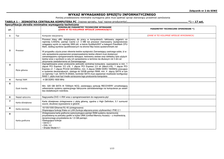 Załącznik nr 2 do SIWZ WYKAZ WYMAGANEGO SPRZĘTU INFORMATYCZNEGO Poniżej przedstawiono minimalne wymagania jakie musi spełniać sprzęt stanowiący przedmiot zamówienia TABELA 1 - JEDNOSTKA CENTRALNA KOMPUTERA PC (nazwa sprzętu, typ/ nazwa producenta)...................................................................... *) – 17 szt. Specyfikacja określa minimalne wymagania techniczne MINIMALNE PARAMETRY TECHNICZNE WYMAGANE (DANE W TEJ KOLUMNIE WPISUJE ZAMAWIAJĄCY) LP. 1 Typ (DANE W TEJ KOLUMNIE WPISUJE WYKONAWCA) Komputer stacjonarny Procesor klasy x86, dedykowany do pracy w komputerach, taktowany zegarem co najmniej 3,40GHz, pamięć Cache L3 3 MB lub procesor równoważny wydajnościowo osiągający wynik co najmniej 3900 pkt. w teście SysMark2007 w kategorii PassMark CPU Mark, według wyników opublikowanych na stronie http://www.cpubenchmark.net 2 Procesor 3 Płyta główna 4 Pamięć RAM 5 6 7 8 W przypadku użycia przez oferenta testów wydajności Zamawiający zastrzega sobie, iż w celu sprawdzenia poprawności przeprowadzenia testów oferent musi dostarczyć zamawiającemu oprogramowanie testujące, testowany zestaw oraz dokładny opis użytych testów wraz z wynikami w celu ich sprawdzenia w terminie nie dłuższym niż 3 dni od otrzymania zawiadomienia od Zamawiającego. Zaprojektowana przez producenta jednostki centralnej komputera, wyposażona w min. 1 złącze PCI Express 3.0 x16, 1 złącze PCI Express 2.0 x4 (Mech.x16), 1 złącze PCI Express x1, 1 złącze PCI(32 bit/33MHz), min. 4 złącza DIMM DDR3 1600MHz pracujące w systemie dwukanałowym, obsługa do 32GB pamięci RAM, min. 4 złączy SATA w tym co najmniej 1 szt. SATA III (6Gbit), kontroler SATA musi zapewniać możliwość konfiguracji RAID 1, płyta musi być trwale oznaczona logo producenta komputera 4 GB DDR3 1600 MHz Dysk twardy Min. 320 GB SATA III 7200rpm NCQ, zawierający partycję RECOVERY umożliwiającą odtworzenie systemu operacyjnego fabrycznie zainstalowanego na komputerze po awarii bez dodatkowych nośników. Napęd optyczny Nagrywarka DVD +/-RW wraz z oprogramowaniem do nagrywania płyt Karta dźwiękowa Karta dźwiękowa zintegrowana z płytą główną, zgodna z High Definition, 5.1 surround sound, obudowa wyposażona w głośnik Karta sieciowa 9 Karta graficzna PARAMETRY TECHNICZNE OFEROWANE *) 10/100/1000 Ethernet RJ 45 (zintegrowana) Wspierająca funkcję Wake on LAN (funkcja włączana przez użytkownika) i PXE 2.1 Zintegrowana karta graficzna wykorzystująca pamięć RAM systemu dynamicznie przydzielaną na potrzeby grafiki w trybie UMA (Unified Memory Access) – z możliwością dynamicznego przydzielenia do 1,5 GB pamięci. Obsługująca funkcje: • DX10.1 • OGL 3.0 • Shader Model 4.1 1/13 Załącznik nr 2 do SIWZ MINIMALNE PARAMETRY TECHNICZNE WYMAGANE (DANE W TEJ KOLUMNIE WPISUJE ZAMAWIAJĄCY) LP. 10 Porty I/O Obudowa/Zasilacz 13 Audio: line-in 1 szt. Audio: line-in / microphone 1szt. Audio: line-out 1szt. Przód obudowy audio: microphone 1szt. Przód obudowy audio: headphone 1szt. Porty USB: o Z przodu obudowy min. 2 szt. USB o Z tyłu obudowy min 4 szt. USB DVI lub / i VGA 1szt. Ethernet (RJ-45) 1szt. Moduł konstrukcji obudowy w jednostce centralnej komputera powinien pozwalać na demontaż kart rozszerzeń i napędów optycznych i dysków twardych bez konieczności użycia narzędzi (wyklucza się użycia wkrętów i śrub oraz śrub motylkowych); Obudowa w jednostce centralnej musi być otwierana bez konieczności użycia narzędzi (wyklucza się użycie standardowych wkrętów, śrub motylkowych) Obudowa musi umożliwiać zastosowanie zabezpieczenia fizycznego w postaci linki metalowej (złącze blokady Kensington) oraz być wyposażona w zamknięcie chroniące przed nieautoryzowanym dostępem Zasilacz o mocy min. 250W Active PFC i sprawności co najmniej 86% przy 50% obciążeniu Suma wymiarów obudowy (wysokość + szerokość + głębokość mierzona po krawędziach zewnętrznych) nie więcej niż 990mm Klawiatura w układzie polski programisty – trwale oznaczona logo producenta jednostki centralnej 11 12 PARAMETRY TECHNICZNE OFEROWANE *) Klawiatura Mysz 14 System operacyjny 15 Oprogramowanie dodatkowe Mysz optyczna USB z rolką (scroll) – trwale oznaczona logo producenta jednostki centralnej Microsoft Windows 7 Professional PL, zainstalowany System operacyjny niewymagający aktywacji za pomocą telefonu lub Internetu w firmie Microsoft. Dołączony nośnik z oprogramowaniem, sterownikami dla systemów Windows 7, Płyty Recovery umożliwiające instalacje systemu zarówno w wersji 32 bitowej jak i 64 bitowej. Dodatkowe w pełni funkcjonalne oraz nieodpłatne licencyjnie oprogramowanie producenta sprzętu pozwalające na: Diagnostykę usterek typu hardware z poziomu DOS, W pełni automatyczną instalację sterowników urządzeń opartą o automatyczną detekcję posiadanego sprzętu Zarządzanie sprzętem IT oraz inwentaryzację posiadanego zainstalowanymi podzespołami czy oprogramowaniem sprzętu 2/13 wraz z Załącznik nr 2 do SIWZ MINIMALNE PARAMETRY TECHNICZNE WYMAGANE (DANE W TEJ KOLUMNIE WPISUJE ZAMAWIAJĄCY) LP. PARAMETRY TECHNICZNE OFEROWANE *) Zintegrowany z płytą główną dedykowany układ sprzętowy służący do tworzenia i zarządzania wygenerowanymi przez komputer kluczami szyfrowania. Zabezpieczenie to musi posiadać możliwość szyfrowania poufnych dokumentów przechowywanych na dysku twardym przy użyciu klucza sprzętowego. 16 Zdalne zarządzanie/ Bezpieczeństwo Zintegrowana sprzętowa technologia umożliwiająca zdalny dostęp do komputerów podłączonych do sieci LAN niezależnie od stanu włączenia lub wyłączenia komputera oraz niezależnie od stanu czy obecności systemu operacyjnego. Zintegrowana sprzętowa technologia zarządzania i monitorowania komputerem na poziomie sprzętowym, musi realizować następujące wymogi: monitorowanie stanu komponentów komputera - CPU, Pamięć, HDD wersje BIOS płyty głównej, zdalna konfi