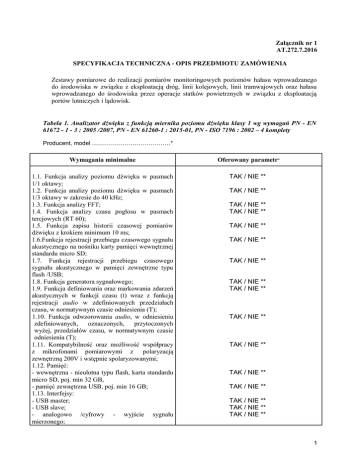 Załącznik nr 1 AT.272.7.2016 SPECYFIKACJA TECHNICZNA - OPIS PRZEDMIOTU ZAMÓWIENIA Zestawy pomiarowe do realizacji pomiarów monitoringowych poziomów hałasu wprowadzanego do środowiska w związku z eksploatacją dróg, linii kolejowych, linii tramwajowych oraz hałasu wprowadzanego do środowiska przez operacje statków powietrznych w związku z eksploatacją portów lotniczych i lądowisk. Tabela 1. Analizator dźwięku z funkcją miernika poziomu dźwięku klasy 1 wg wymagań PN - EN 61672 - 1 - 3 : 2005 /2007, PN - EN 61260-1 : 2015-01, PN - ISO 7196 : 2002 – 4 komplety Producent, model …………………………………* Wymagania minimalne Oferowany parametr* 1.1. Funkcja analizy poziomu dźwięku w pasmach 1/1 oktawy; 1.2. Funkcja analizy poziomu dźwięku w pasmach 1/3 oktawy w zakresie do 40 kHz; 1.3. Funkcja analizy FFT; 1.4. Funkcja analizy czasu pogłosu w pasmach tercjowych (RT 60); 1.5. Funkcja zapisu historii czasowej pomiarów dźwięku z krokiem minimum 10 ms; 1.6.Funkcja rejestracji przebiegu czasowego sygnału akustycznego na nośniku karty pamięci wewnętrznej standardu micro SD; 1.7. Funkcja rejestracji przebiegu czasowego sygnału akustycznego w pamięci zewnętrzne typu flash /USB; 1.8. Funkcja generatora sygnałowego; 1.9. Funkcja definiowania oraz markowania zdarzeń akustycznych w funkcji czasu (t) wraz z funkcją rejestracji audio w zdefiniowanych przedziałach czasu, w normatywnym czasie odniesienia (T); 1.10. Funkcja odwzorowania audio, w odniesieniu zdefiniowanych, oznaczonych, przytoczonych wyżej, przedziałów czasu, w normatywnym czasie odniesienia (T); 1.11. Kompatybilność oraz możliwość współpracy z mikrofonami pomiarowymi z polaryzacją zewnętrzną 200V i wstępnie spolaryzowanymi; 1.12. Pamięć: - wewnętrzna - nieulotna typu flash, karta standardu micro SD, poj. min 32 GB, - pamięć zewnętrzna USB, poj. min 16 GB; 1.13. Interfejsy: - USB master; - USB slave; - analogowo /cyfrowy - wyjście sygnału mierzonego; TAK / NIE ** TAK / NIE ** TAK / NIE ** TAK / NIE ** TAK / NIE ** TAK / NIE ** TAK / NIE ** TAK / NIE ** TAK / NIE ** TAK / NIE ** TAK / NIE ** TAK / NIE ** TAK / NIE ** TAK / NIE ** TAK / NIE ** TAK / NIE ** 1 Wymagania minimalne Oferowany parametr* 1.14. Warunki środowiskowe pracy: - Temperatura: co najmniej od -10 0C do +50 0C; - Wilgotność: do 90% wilgotności względnej RH (bez kondensacji); 1.15. Gwarancja: nie mniej niż 24 miesiące; 1.16. Rękojmia. TAK / NIE ** TAK / NIE ** …………………. TAK / NIE ** Tabela 2. Wyposażenie, oprzyrządowanie, oprogramowanie dla analizatora dźwięku – 4 komplety. Wymagania minimalne 2.1. Mikrofon prepolaryzowany 1/2" do pomiarów w zakresie słyszalnym (10 Hz - 20 kHz); 2.2. Przedwzmacniacz mikrofonowy 1/2", umożliwiający dołączenie do analizatora mikrofonu z polaryzacją zewnętrzną 200 V oraz wstępnie spolaryzowanego; 2.3. Osłona przeciwwietrzna na mikrofon 1/2"; 2.4. Przewód USB do komunikacji z komputerem PC; 2.5. Przewód sygnałowy wyjścia sygnału mierzonego; 2.6. Akumulatory serii AA, komplet, wraz z ładowarką akumulatorową: - funkcja wykrywania pełnego naładowania i zabezpieczenia przed przeładowaniem; - liczba ładowanych akumulatorów: min. 4; 2.7. Zasilacz sieciowy; 2.8. Karta pamięci wewn., poj. min. 32 GB; 2.9. Pamięć zewn. typu flash /USB, poj. min. 16 GB; 2.10. Oprogramowanie komputerowe na PC do transmisji, wizualizacji oraz archiwizacji zbiorów danych pomiarowych dźwięku, a także wstępnej ich analizy i oceny, w myśl obowiązujących krajowych wymagań administracyjno - prawnych oraz krajowych wymagań normatywnych, w przedmiotowej dziedzinie badań dźwięku, w środowisku; 2.11. Możliwość opcjonalna rozszerzenia wyżej wymienionego do poziomu i zakresu umożliwiających podjęcie oraz realizację specjalistycznej, zaawansowanej, analizy i oceny dźwięku w środowisku, w tym, co najmniej: analizy dźwięku oraz wyznaczenia, obowiązujących literą prawa oraz krajowymi aktami normatywnymi, wielkości i wskaźników oceny dźwięku w środowisku; - analizy i oceny widma dźwięku w środowisku; - analizy i oceny statystycznej dźwięku (L5 - L95), dB, w środowisku; - analizy i oceny sygnału audio, w funkcji czasu, oraz akcesoria dedykowane Oferowany parametr* Producent, model ………………………………… TAK / NIE ** TAK / NIE ** TAK / NIE ** TAK / NIE ** TAK / NIE ** TAK / NIE ** TAK / NIE ** TAK / NIE ** Producent, nazwa programu …………………………… TAK / NIE ** 2 Wymagania minimalne w czasie odniesienia (T), w środowisku; - wzajemnej superpozycji projektów wyżej wymienionych; 2.12. Możliwość opcjonalna rozszerzenia wyżej wymienionego do modułu dedykowanego dla procesu komunikacji zdalnej z przedmiotowymi jednostkami analizatorów dźwięku, w czasie rzeczywistym; 2.13. Fabryczna walizka techniczna, wodoodporna, dedykowana dla analizatora dźwięku wraz z akumulatorem zasilającym (12V DC, poj. min. 30 Ah), ładowarką sieciową do akumulatora oraz kablem mikrofonowym ze złączem wodoodpornym, długości min. 5 m; 2.14. Kabel mikrofonowy, długości min. 10 m; 2.15. Osłona wszechpogodowa dedykowana do przedwzmacniacza oraz mikrofonu pomiarowego przedmiotowego toru pomiarowego dźwięku; 2.16. Statyw mikrofonowy, teleskopowy, wysokości 4,0 m wraz z ramieniem przedłużającym do wysokości łącznej statywu 4,5 m, a także odciągami linowymi, kompletem akcesoriów oraz pokrowcem transportowym; 2.17. Osłona przeciwwietrzna do pomiaru hałasu turbin wiatrowych, zgodnie z wymaganiami normy PN - EN 61400 - 11 : 2013 - 07 lub równoważnej (w niniejszym przypadku: wyłącznie 2 komplety); 2.18. Skrzynia techniczna na wyposażenie, na kółkach, z akumulatorem zasilającym (12V DC, poj. min. 30 Ah) oraz ładowarką sieciową do akumulatora; 2.19. Wzajemna kompatybilność elementów wyżej wymienionych; 2.20. Kalibrator akustyczny 1/2": Klasy 1 wg wymagań PN - EN 60942 : 2005 lub równo
