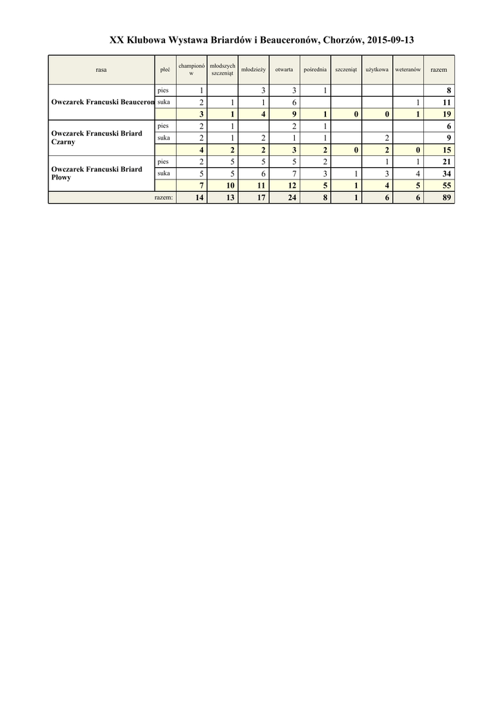 XX Klubowa Wystawa Briardów i Beauceronów, Chorzów, 2015-09-13 rasa płeć pies Owczarek Francuski Beauceron suka pies Owczarek Francuski Briard Czarny suka pies Owczarek Francuski Briard Płowy suka razem: championó młodszych w szczeniąt 1 2 3 2 2 4 2 5 7 14 1 1 1 1 2 5 5 10 13 młodzieży 3 1 4 2 2 5 6 11 17 otwarta 3 6 9 2 1 3 5 7 12 24 pośrednia szczeniąt użytkowa weteranów 1 1 1 1 2 2 3 5 8 0 0 1 1 1 0 1 1 2 2 1 3 4 6 0 1 4 5 6 razem 8 11 19 6 9 15 21 34 55 89 breed pies suka pies Berger de Beauce total sex suka total 27 43 70 8 11 19 89 27 43 70 8 11 19 89