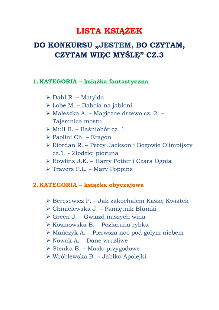 LISTA KSIĄŻEK DO KONKURSU „JESTEM, BO CZYTAM, CZYTAM WIĘC MYŚLĘ” CZ.3 1. KATEGORIA – książka fantastyczna Dahl R. – Matylda Lobe M. – Babcia na jabłoni Maleszka A. – Magiczne drzewo cz. 2. – Tajemnica mostu Mull B. – Baśniobór cz. 1 Paolini Ch. – Eragon Riordan R. – Percy Jackson i Bogowie Olimpijscy cz.1. - Złodziej pioruna Rowlins J.K. – Harry Potter i Czara Ognia Travers P.L. – Mary Poppins 2. KATEGORIA – książka obyczajowa Beręsewicz P. – Jak zakochałem Kaśkę Kwiatek Chmielewska J. – Pamiętnik Blumki Green J. – Gwiazd naszych wina Kosmowska B. – Pozłacana rybka Mańczyk A. – Pierwsza noc pod gołym niebem Nowak A. – Dane wrażliwe Stenka B. – Masło przygodowe Wróblewska B. – Jabłko Apolejki 3. KATEGORIA – książka przygodowa lub podróżnicza Niziurski E. – Niewiarygodne przygody Marka Piegusa Pałasz M. – Wszystko zaczyna się od marzeń Sikorska-Celejewska A. – Wakacyjny koncert Sikorski Cz. – Wakacje w Różyczkowie Stevenson R.L. – Wyspa Skarbów Strękowska-Zaremba M. – Bery, gangster i góra kłopotów Wierzbicki Ł. – Dziadek i niedźwiadek
