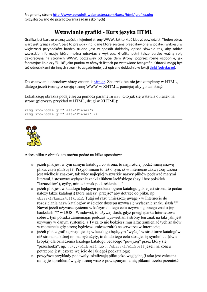Fragmenty strony http://www.poradnik-webmastera.com/kursy/html/ grafika.php (przystosowano do przygotowania zadań szkolnych) Wstawianie grafiki - Kurs języka HTML Grafika jest bardzo ważną częścią niejednej strony WWW. Jak to ktoś kiedyś powiedział, "Jeden obraz wart jest tysiąca słów". Jest to prawda - np. dane które zostaną przedstawione w postaci wykresu w większości przypadków bardzo trudno jest w sposób dokładny opisać słownie tak, aby oddać wszystkie informacje które można odczytać z wykresu. Grafika pełni także bardzo ważną rolę dekoracyjną na stronach WWW, począwszy od bycia tłem strony, poprzez różne ozdobniki, jak fantazyjne linie czy "kulki" jako punktu w różnych listach po wstawione fotografie. Obrazki mogą być też odnośnikami do innych stron - to zagadnienie jest opisane dokładnie w lekcji Linki (odsyłacze). Do wstawiania obrazków słuŜy znacznik <img>. Znacznik ten nie jest zamykany w HTML, dlatego jeŜeli tworzysz swoją stronę WWW w XHTML, pamiętaj aby go zamknąć. Lokalizację obrazka podaje się za pomocą parametru src. Oto jak się wstawia obrazek na stronę (pierwszy przykład w HTML, drugi w XHTML): <img src="odie.gif" alt="Piesek"> <img src="odie.gif" alt="Piesek" /> Adres pliku z obrazkiem moŜna podać na kilka sposobów: • • • • jeŜeli plik jest w tym samym katalogu co strona, to najprościej podać samą nazwę pliku, czyli plik.gif. Przypominam tu teŜ o tym, iŜ w Internecie zazwyczaj waŜna jest wielkość znaków, tak więc najlepiej wszystkie nazwy plików podawać małymi literami, i stosować wyłącznie znaki alfabetu łacińskiego (czyli bez polskich "krzaczków"), cyfry, minus i znak podkreślenia "_" jeŜeli plik jest w katalogu będącym podkatalogiem katalogu gdzie jest strona, to podać naleŜy takŜe katalog(i) które naleŜy "przejść" aby dotrzeć do pliku, np. obrazki/kasia/plik.gif. Tutaj od razu umieszczę uwagę - w Internecie do rozdzielania nazw katalogów w ścieŜce dostępu uŜywa się wyłącznie znaku slash "/". Nawet jeŜeli uŜywasz systemu w którym do tego celu uŜywa się innego znaku (np. backslash "\" w DOS i Windows), to uŜywaj slash, gdyŜ przeglądarka Internetowa sobie z tym poradzi zamieniając podczas wyświetlania strony ten znak na taki jaki jest uŜywany w danym systemie, a Ty za to nie będziesz musiał(a) zamieniać tych znaków w momencie gdy stronę będziesz umieszczał(a) na serwerze w Internecie; jeŜeli plik z grafiką znajduje się w katalogu będącym "wyŜej" w strukturze katalogów niŜ strona na której on ma być uŜyty, to do do tego celu stosuje się symbol .. (dwie kropki) dla oznaczenia kaŜdego katalogu będącego "powyŜej" przez który się "przechodzi", np. ../../plik.gif, lub ../obrazki/plik.gif jeŜeli na końcu potrzebne jest jeszcze wejście do jakiegoś podkatalogu; powyŜsze przykłady podawały lokalizację pliku jako względną (i taka jest zalecana mniej jest problemów gdy stronę wraz z powiązanymi z nią plikami trzeba przenieść Fragmenty strony http://www.poradnik-webmastera.com/kursy/html/ grafika.php (przystosowano do przygotowania zadań szkolnych) • do innego katalogu). Niekiedy jednak konieczne moŜe być podanie pełnej ścieŜki dostępu do pliku względem katalogu głównego serwera (tzw. ścieŜka bezwzględna na serwerze). ŚcieŜkę taką naleŜy rozpocząć od znaku "/", i następnie podać wszystkie katalogi które naleŜy "przejść" aby dotrzeć do pliku, np. /pliki/grafika/plik.gif. Uwaga: jeŜeli posiadasz konto na serwerze, gdzie adresem strony głównej Twojego serwisu jest np. www.serwer.pl/~tomek/, to na początku ścieŜki musisz umieścić /~tomek/, np. /~tomek/pliki/grafika/plik.gif; adres moŜna w końcu podać takŜe jako bezwzględny w Internecie, podając przed ścieŜką takŜe adres serwera poprzedzony oznaczeniem protokołu (zwykle http://), np. http://www.serwer.com.pl/grafika/plik.gif. Tu od razu teŜ uprzedzę, Ŝe jeŜeli w ten sposób chcesz wykorzystać obrazek znajdujący się w serwisie którego nie jesteś właścicielem, powinieneś(aś) poprosić najpierw o zgodę właściciela tego serwisu, gdyŜ w innym przypadku moŜesz mieć problemy gdyŜ naruszysz prawa autorskie, lub narazisz właściciela serwisu na dodatkowe koszta, gdy posiadane przez niego konto na serwerze płaci w zaleŜności od ilości przesłanych danych (czyli w zaleŜności od tego ile danych odwiedzający ściągną do siebie). Parametry dla wstawionego obrazka Dla obrazka wstawionego na stronę WWW moŜna zdefiniować wiele parametrów: • szerokość - za pomocą parametru width, i wysokość - za pomocą parametru height: <img src="odie.gif" width="72" height="84" alt="Piesek"> MoŜna podać tylko jeden parametr, ale nie jest to zalecane - gdy podana jest zarówno wysokość, jak i szerokość, to wtedy podczas wczytywania strony przeglądarka moŜe od razu zarezerwować odpowiednią ilość miejsca na wyświetlenie obrazka. JeŜeli tego się nie zrobi, to w miarę jak kolejne obrazki się będą wczytywać, przeglądarka będzie zmuszona do zmiany pozycji innych elementów strony w zaleŜności od rozmiarów obrazka, co powoduje iŜ niemoŜliwe staje się przeglądanie strony w momencie gdy ona się wczytuje, gdyŜ co chwilę tekst się przesuwa w inne miejsce. Za pomocą podanych parametrów moŜna takŜe przeskalować obrazek, podając nowy rozmiar w pikselach lub w procentach szerokości ekranu (lub elementu blokowego w którym obrazek się znajduje). JeŜeli poda się tylko jeden rozmiar, to przeglądarka dobierze drugi tak aby zachować proporcje obrazka: <img src="odie.gif" width="50%" alt="Piesek"><br /> <img src="odie.gif" height="168" alt="Piesek"> <img src="odie.gif" width="144" alt="Piesek"> Fragmenty strony http://www.poradnik-webmastera.com/kursy/html/ grafika.php (przystosowano do przygotowania zadań szkolnych) Podając obydwa parametry, moŜna te proporcje zniekształcić: <img src="odie.g