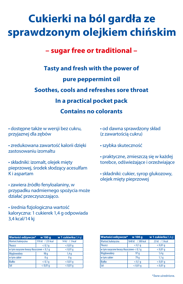 Cukierki na ból gardła ze sprawdzonym olejkiem chińskim – sugar free or traditional – Tasty and fresh with the power of pure peppermint oil Soothes, cools and refreshes sore throat In a practical pocket pack Contains no colorants • dostępne także w wersji bez cukru, przyjaznej dla zębów • od dawna sprawdzony skład (z zawartością cukru) • zredukowana zawartość kalorii dzięki zastosowaniu izomaltu • szybka skuteczność • składniki: izomalt, olejek mięty pieprzowej, środek słodzący acesulfam K i aspartam • zawiera źródło fenyloalaniny, w przypadku nadmiernego spożycia może działać przeczyszczająco. • praktyczne, zmieszczą się w każdej torebce, odświeżające i orzeźwiające • składniki: cukier, syrop glukozowy, olejek mięty pieprzowej • średnia fizjologiczna wartość kaloryczna: 1 cukierek 1,4 g odpowiada 3,4 kcal/14 kj Wartości odżywcze* w 100 g 976 kJ / 235 kcal Wartość kaloryczna Tłuszcz < 0,1 g w tym nasycone kwasy tłuszczowe < 0,1 g Węglowodory 98 g w tym cukier 0g Białko < 0,1 g Sól < 0,01 g w 1 cukierku (1,4 g) 14 kJ / 3 kcal < 0,01 g < 0,01 g 1,4 g 0g < 0,01 g < 0,01 g Wartości odżywcze* w 100 g 1648 kJ / 388 kcal Wartość kaloryczna Tłuszcz < 0,1 g w tym nasycone kwasy tłuszczowe < 0,1 g Węglowodory 97 g w tym cukier 79 g Białko < 0,1 g Sól < 0,01 g w 1 cukierku (1,4 g) 23 kJ / 5 kcal < 0,01 g < 0,01 g 1,4 g 1,1 g < 0,01 g < 0,01 g *Dane uśrednione.