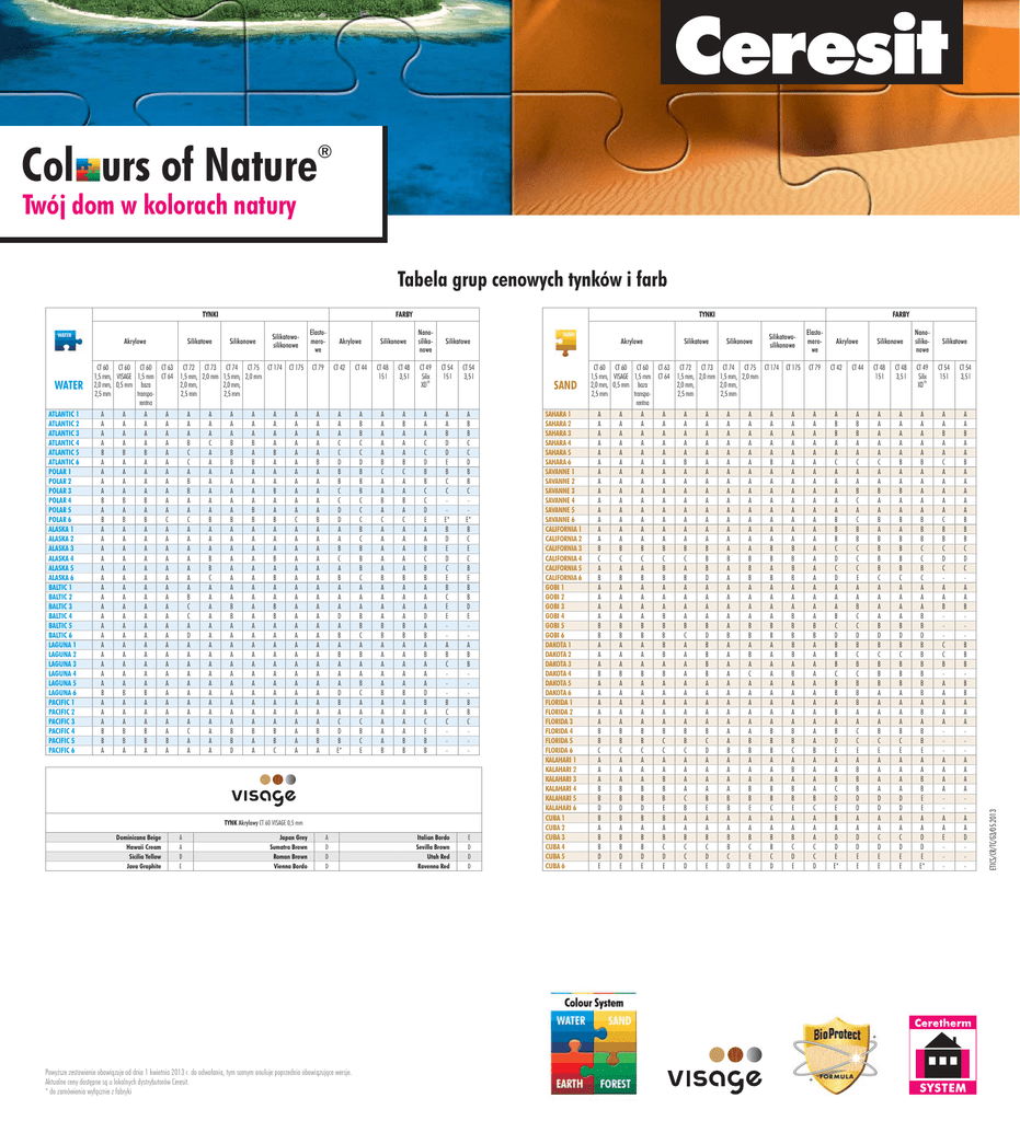 ® Col urs of Nature Twój dom w kolorach natury Tabela grup cenowych tynków i farb Akrylowe WATER ATLANTIC 1 ATLANTIC 2 ATLANTIC 3 ATLANTIC 4 ATLANTIC 5 ATLANTIC 6 POLAR 1 POLAR 2 POLAR 3 POLAR 4 POLAR 5 POLAR 6 ALASKA 1 ALASKA 2 ALASKA 3 ALASKA 4 ALASKA 5 ALASKA 6 BALTIC 1 BALTIC 2 BALTIC 3 BALTIC 4 BALTIC 5 BALTIC 6 LAGUNA 1 LAGUNA 2 LAGUNA 3 LAGUNA 4 LAGUNA 5 LAGUNA 6 PACIFIC 1 PACIFIC 2 PACIFIC 3 PACIFIC 4 PACIFIC 5 PACIFIC 6 Silikatowe FARBY Silikonowe Silikatowosilikonowe CT 60 CT 60 CT 60 CT 63 CT 72 CT 73 CT 74 CT 75 CT 174 CT 175 1,5 mm, VISAGE 1,5 mm CT 64 1,5 mm, 2,0 mm 1,5 mm, 2,0 mm 2,0 mm, 2,0 mm, 0,5 mm baza 2,0 mm, transpa2,5 mm 2,5 mm 2,5 mm rentna A A A A B A A A A B A B A A A A A A A A A A A A A A A A A B A A A B B A A A A A B A A A A B A B A A A A A A A A A A A A A A A A A B A A A B B A A A A A B A A A A B A B A A A A A A A A A A A A A A A A A B A A A B B A A A A A A A A A A A A C A A A A A A A A A A A A A A A A A A A A A A B A A A A B C C A B B A A C A A A A A A A B C C A D A A A A A A A A A C A A A A A C A A A A A A A B A A A B B C A A A A A A A A A A A A A A A A A A A A A B B B A A A A A B A A A A A A A A B B A A A A A A A A A A A B B D A A A B A B A A A A B B A A A A A A A A A A A A A A A A A A A A A B A A A A A A B A A A B A A B A A A B A B A A B B A A A A A A A A A A A B B C A A A A A A A A A A A C A A A A A A A A A A A A A A A A A A A A A A A A Elastomerowe CT 79 Akrylowe CT 42 A A A A A B A A A A A B A A A A A A A A A A A A A A A A A A A A A B B A A A A C C D B B C C D D A A B C A B A A A D A B A B A A A D B A C D B E* CT 44 A B B C C D B B B C C C B C B B B C A A A B B C A B A A B C A A C B C E Silikonowe TYNKI Nanosilikonowe Silikatowe CT 48 15 l CT 48 3,5 l CT 49 Silix ® XD CT 54 15 l CT 54 3,5 l A A A A A B C A A B A C A A A A A B A A A A B B A A A A A B A A A A A B A B A A A B C A A B A C A A A A A B A A A A B B A A A A A B A A A A B B A A A C C D B B C C D E A A B C B B A A A D A B A B A A A D B A C E B B A A B D D E B C C E* B D E D C E B C E E A B C B C C - A B B C C D B B C E* B C E C B E B B D E A B B B B C - Italian Bordo Sevilla Brown Utah Red Ravenna Red E D D D TYNK Akrylowy CT 60 VISAGE 0,5 mm Dominicana Beige Hawaii Cream Sicilia Yellow Java Graphite A A D E Japan Grey Sumatra Brown Roman Brown Vienna Bordo A D D D Powyższe zestawienie obowiązuje od dnia 1 kwietnia 2013 r. do odwołania, tym samym anuluje poprzednio obowiązujące wersje. Aktualne ceny dostępne są u lokalnych dystrybutorów Ceresit. * do zamówienia wyłącznie z fabryki Akrylowe SAND SAHARA 1 SAHARA 2 SAHARA 3 SAHARA 4 SAHARA 5 SAHARA 6 SAVANNE 1 SAVANNE 2 SAVANNE 3 SAVANNE 4 SAVANNE 5 SAVANNE 6 CALIFORNIA 1 CALIFORNIA 2 CALIFORNIA 3 CALIFORNIA 4 CALIFORNIA 5 CALIFORNIA 6 GOBI 1 GOBI 2 GOBI 3 GOBI 4 GOBI 5 GOBI 6 DAKOTA 1 DAKOTA 2 DAKOTA 3 DAKOTA 4 DAKOTA 5 DAKOTA 6 FLORIDA 1 FLORIDA 2 FLORIDA 3 FLORIDA 4 FLORIDA 5 FLORIDA 6 KALAHARI 1 KALAHARI 2 KALAHARI 3 KALAHARI 4 KALAHARI 5 KALAHARI 6 CUBA 1 CUBA 2 CUBA 3 CUBA 4 CUBA 5 CUBA 6 Silikatowe FARBY Silikonowe Silikatowosilikonowe CT 60 CT 60 CT 60 CT 63 CT 72 CT 73 CT 74 CT 75 CT 174 CT 175 1,5 mm, VISAGE 1,5 mm CT 64 1,5 mm, 2,0 mm 1,5 mm, 2,0 mm 2,0 mm, 2,0 mm, 0,5 mm baza 2,0 mm, transpa2,5 mm 2,5 mm 2,5 mm rentna A A A A A A A A A A A A A A B C A B A A A A B B A A A B A A A A A B B C A A A B B D B A B B D E A A A A A A A A A A A A A A B C A B A A A A B B A A A B A A A A A B B C A A A B B D B A B B D E A A A A A A A A A A A A A A B C A B A A A A B B A A A B A A A A A B B C A A A B B D B A B B D E A A A A A A A A A A A A A A B C B B A A A B B B B B A B A A A A A B C C A A B B B E B A B C D E A A A A A B A A A A A A A A B C A B A A A A B C A A A A A A A A A B B C A A A A C B A A B C C D A A A A A A A A A A A A A A B B B D A A A A B D B B B B A A A A A B C D A A A A B E A A B C D E A A A A A A A A A A A A A A A B A A A A A A A B A A A A A A A A A A A B A A A A B B A A B B C D A A A A A A A A A A A A A A A B B B A A A A B B A B A C A A A A A A B B A A A B B E A A B C E E A A A A A B A A A A A A A A B B A B A A A A B B A A A A A A A A A B B B A A A B B C A A B B C D A A A A A A A A A A A A A A B B B B A A A B B B B B A B A A A A A B B C A B A B B E A A B C D E Elastomerowe Akrylowe Silikonowe Nanosilikonowe Silikatowe CT 79 CT 42 CT 44 CT 48 15 l CT 48 3,5 l CT 49 Silix ® XD CT 54 15 l CT 54 3,5 l A A A A A A A A A A A A A A A A A A A A A A B B A A A A A A A A A A A B A A A A B C A A A C C D A B B A A C A A A A A B B B C D C D A A A B C D B B B C B B A B A B D E A A B C D E B A D D E E* A B B A A C A A B C A C B B C C C E A A B C C D B C B C B B B A A C C E A B B B D D A A D D E E A A A A A C A A B A A B A B B B B C A A A A B D B C B B B A A A A B C E A A A A D D A A C D E E A A A A A B A A B A A B A B B B B C A A A A B D B C B B B A A A A B C E A A A A D D A A C D E E A A A A A B A A A A A B B B C C B C A A A B B D B B B B B B A B A B B E A A B B E E A A D D E E* A A B A A C A A A A A C B B C D C A A B C C B A A A A A A A A A A A E - A A B A A B A A A A A B B B C D C A A B B B B B B A A A A A A A A A D - ETICS/CR/TC/G3/05.2013 TYNKI ® Col urs of Nature Twój dom w kolorach natury Tabela grup cenowych tynków i farb Akrylowe EARTH ANDALUSIA 1 ANDALUSIA 2 ANDALUSIA 3 ANDALUSIA 4 ANDALUSIA 5 ANDALUSIA 6 COLORADO 1 COLORADO 2 COLORADO 3 COLORADO 4 COLORADO 5 COLORADO 6 TEXAS 1 TEXAS 2 TEXAS 3 TEXAS 4 TEXAS 5 TEXAS 6 AFRICA 1 AFRICA 2 AFRICA 3 AFRICA 4 AFRICA 5 AFRICA 6 NEVADA 1 NEVADA 2 NEVADA 3 NEVADA 4 NEVADA 5 NEVADA 6 MADEIRA 1 MADEIRA 2 MADEIRA 3 MADEIRA 4 MADEIRA 5 MADEIRA 6 COLUMBIA 1 COLUMBIA 2 COLUMBIA 3 COLUMBIA 4 COLUMBIA 5 COLUMBIA 6 ARIZONA 1 ARIZONA 2 ARIZONA 3 ARIZONA 4 ARIZONA 5 ARIZONA 6 FUJI 1 FUJI 2 FUJI 3 FUJI 4 FUJI 5 FUJI 6 INDIANA 1 INDIANA 2 INDIANA 3 INDIANA 4 INDIANA 5 INDIANA 6 KASHMIR 1 KASHMIR 2 KASHMIR 3 KASHMIR 4 KASHMIR 5 KASHMIR 6 PROVENCE 1 PROVENCE 2 PROVENCE 3 PROVENCE 4 PROVENCE 5 PROVENCE 6 Silikatowe FARBY Silikonowe Silikatowosilikonowe CT 60 CT 60 CT 60 CT 63 CT 72 CT 73 CT 74 CT 75 