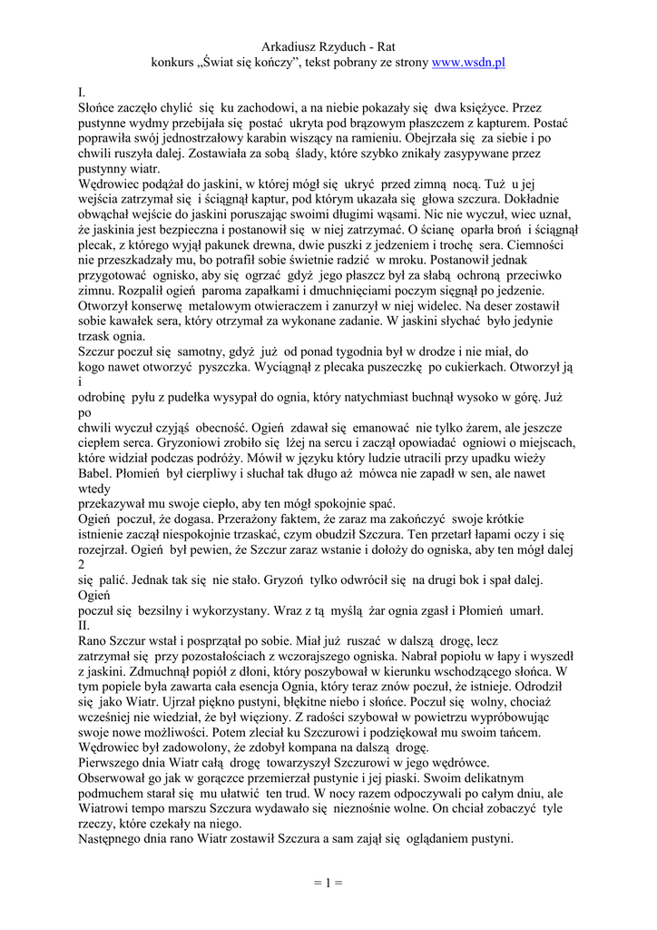 Arkadiusz Rzyduch - Rat konkurs „Świat się kończy”, tekst pobrany ze strony www.wsdn.pl I. Słońce zaczęło chylić się ku zachodowi, a na niebie pokazały się dwa księŜyce. Przez pustynne wydmy przebijała się postać ukryta pod brązowym płaszczem z kapturem. Postać poprawiła swój jednostrzałowy karabin wiszący na ramieniu. Obejrzała się za siebie i po chwili ruszyła dalej. Zostawiała za sobą ślady, które szybko znikały zasypywane przez pustynny wiatr. Wędrowiec podąŜał do jaskini, w której mógł się ukryć przed zimną nocą. TuŜ u jej wejścia zatrzymał się i ściągnął kaptur, pod którym ukazała się głowa szczura. Dokładnie obwąchał wejście do jaskini poruszając swoimi długimi wąsami. Nic nie wyczuł, wiec uznał, Ŝe jaskinia jest bezpieczna i postanowił się w niej zatrzymać. O ścianę oparła broń i ściągnął plecak, z którego wyjął pakunek drewna, dwie puszki z jedzeniem i trochę sera. Ciemności nie przeszkadzały mu, bo potrafił sobie świetnie radzić w mroku. Postanowił jednak przygotować ognisko, aby się ogrzać gdyŜ jego płaszcz był za słabą ochroną przeciwko zimnu. Rozpalił ogień paroma zapałkami i dmuchnięciami poczym sięgnął po jedzenie. Otworzył konserwę metalowym otwieraczem i zanurzył w niej widelec. Na deser zostawił sobie kawałek sera, który otrzymał za wykonane zadanie. W jaskini słychać było jedynie trzask ognia. Szczur poczuł się samotny, gdyŜ juŜ od ponad tygodnia był w drodze i nie miał, do kogo nawet otworzyć pyszczka. Wyciągnął z plecaka puszeczkę po cukierkach. Otworzył ją i odrobinę pyłu z pudełka wysypał do ognia, który natychmiast buchnął wysoko w górę. JuŜ po chwili wyczuł czyjąś obecność. Ogień zdawał się emanować nie tylko Ŝarem, ale jeszcze ciepłem serca. Gryzoniowi zrobiło się lŜej na sercu i zaczął opowiadać ogniowi o miejscach, które widział podczas podróŜy. Mówił w języku który ludzie utracili przy upadku wieŜy Babel. Płomień był cierpliwy i słuchał tak długo aŜ mówca nie zapadł w sen, ale nawet wtedy przekazywał mu swoje ciepło, aby ten mógł spokojnie spać. Ogień poczuł, Ŝe dogasa. PrzeraŜony faktem, Ŝe zaraz ma zakończyć swoje krótkie istnienie zaczął niespokojnie trzaskać, czym obudził Szczura. Ten przetarł łapami oczy i się rozejrzał. Ogień był pewien, Ŝe Szczur zaraz wstanie i dołoŜy do ogniska, aby ten mógł dalej 2 się palić. Jednak tak się nie stało. Gryzoń tylko odwrócił się na drugi bok i spał dalej. Ogień poczuł się bezsilny i wykorzystany. Wraz z tą myślą Ŝar ognia zgasł i Płomień umarł. II. Rano Szczur wstał i posprzątał po sobie. Miał juŜ ruszać w dalszą drogę, lecz zatrzymał się przy pozostałościach z wczorajszego ogniska. Nabrał popiołu w łapy i wyszedł z jaskini. Zdmuchnął popiół z dłoni, który poszybował w kierunku wschodzącego słońca. W tym popiele była zawarta cała esencja Ognia, który teraz znów poczuł, Ŝe istnieje. Odrodził się jako Wiatr. Ujrzał piękno pustyni, błękitne niebo i słońce. Poczuł się wolny, chociaŜ wcześniej nie wiedział, Ŝe był więziony. Z radości szybował w powietrzu wypróbowując swoje nowe moŜliwości. Potem zleciał ku Szczurowi i podziękował mu swoim tańcem. Wędrowiec był zadowolony, Ŝe zdobył kompana na dalszą drogę. Pierwszego dnia Wiatr całą drogę towarzyszył Szczurowi w jego wędrówce. Obserwował go jak w gorączce przemierzał pustynie i jej piaski. Swoim delikatnym podmuchem starał się mu ułatwić ten trud. W nocy razem odpoczywali po całym dniu, ale Wiatrowi tempo marszu Szczura wydawało się nieznośnie wolne. On chciał zobaczyć tyle rzeczy, które czekały na niego. Następnego dnia rano Wiatr zostawił Szczura a sam zajął się oglądaniem pustyni. =1= Arkadiusz Rzyduch - Rat konkurs „Świat się kończy”, tekst pobrany ze strony www.wsdn.pl Lecąc na zachód znalazł opuszczone miasto glinianych domów. Większość z nich była zaniedbana i pozostawiona pustyni. Wiatr dobrze się bawił wlatując do pozostałości domów i oglądając zniszczone sprzęty codziennego uŜytku porzucone przez ludzi. W jednej ze spiŜarni, w której zostało trochę zapasów zobaczył mysz szukającą poŜywienia. Zajęta była robieniem dziury w worku z ziarnem. Kiedy tylko dostała się do jego wnętrza zaczęła łapczywie napełniać sobie brzuch zdobytym jedzeniem. Po chwili wyczuła czyjąś obecności i szybko skryła się w dziurze ściany. Mysz przypomniała Wiatrowi, o Szczurze, który w tym czasie samotnie przemierzał pustynię. Szybko wyleciał z domu i poleciał na wschód, gdzie znalazł przyjaciela rozpalającego ognisko na noc. Podmuchem pomógł mu rozniecić ogień i ułoŜył się na piasku. Potem zaczął opowiadać swojemu towarzyszowi wszystko, co widział tego dnia, a Szczur cierpliwie słuchał aŜ zasnął ze zmęczenia. Następnego dnia Wiatr poleciał na południe, gdzie znalazł wyspę na morzu piasku. Podziwiał piękno zielonej oazy oglądając rośliny znajdujące się w niej i wdychając ich zapachy. Oglądał jak woda mieni się w promieniach słońca, gdy muskał ją powiewem i bujał liśćmi palm. Wieczorem do oazy przybył samotny wielbłąd. Zanurzył mordę w wodzie i zaczął pić. Robił to naprawdę długo, a wiatr tym czasem przyglądał się garbowi i jego odbiciu w wodzie. Potem zwierzę zaczęło skubać rośliny w oazie. Gdy skończył to ułoŜył się, zaryczał donośnie i poszedł spać. Zachodzące słońce przypomniało Wiatrowi, Ŝe musi wrócić. Znalazł Szczura podobnie jak poprzedniego dnia przy ognisku jedzącego posiłek z puszki. Tak jak poprzedniego dnia podzielił się z nim opowieścią o tym, co widział. Trzeciego dnia Wiatr poleciał na wschód w tym samym kierunku, w którym szedł jego kompan tylko znacznie go wyprzedził dzięki swej szybkości. Trafił na pustynny szlak, któ