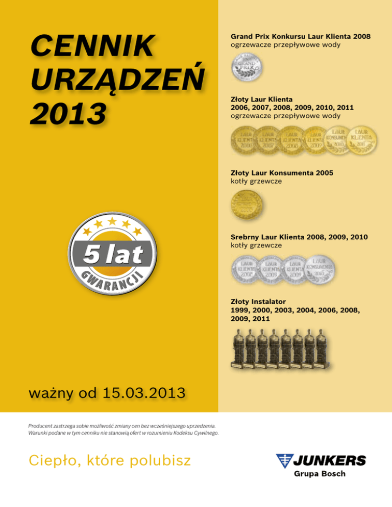 CENNIK URZĄDZEŃ 2013 Grand Prix Konkursu Laur Klienta 2008 ogrzewacze przepływowe wody Złoty Laur Klienta 2006, 2007, 2008, 2009, 2010, 2011 ogrzewacze przepływowe wody Złoty Laur Konsumenta 2005 kotły grzewcze Srebrny Laur Klienta 2008, 2009, 2010 kotły grzewcze Złoty Instalator 1999, 2000, 2003, 2004, 2006, 2008, 2009, 2011 ważny od 15.03.2013 Producent zastrzega sobie możliwość zmiany cen bez wcześniejszego uprzedzenia. Warunki podane w tym cenniku nie stanowią ofert w rozumieniu Kodeksu Cywilnego. Ciepło, które polubisz Regiony Sprzedaży Cennik 15.03.2013 Tomasz Splisgardt Marcin Brud tel. 0 602/417 156 tel. 0 604/421 450 Ariel Walaszczyk tel. 0 608/667 104 POMORSKIE WARMIŃSKO -MAZURSKIE Wojciech Mróz ZACHODNIOPOMORSKIE KUJAWSKO -POMORSKIE Paweł Adamowicz PODLASKIE tel. 0 604/960 021 tel. 0 602/417 192 WIELKOPOLSKIE MAZOWIECKIE LUBUSKIE ŁÓDZKIE Michał Gajewski Arkadiusz Sikora LUBELSKIE DOLNOŚLĄSKIE tel. 0 604/477 670 ŚWIĘTOKRZYSKIE OPOLSKIE ŚLĄSKIE tel. 0 602/417 161 MAŁOPOLSKIE Marcin Makowski tel. 0 602/417 189 Jarosław Galant tel. 0 696/955 582 PODKARPACKIE Jacek Dunikowski Waldemar Gniady tel. 0 606/783 848 tel. 0 606/402 423 Centra Szkoleniowe Obsługa w biurze: Justyna Czajkowska Dominika Kaleta Wioletta Łebek tel. 22/715 46 15 fax 22/715 46 96 tel. 22/715 46 13 fax 22/715 46 96 tel. 22/715 46 16 fax 22/715 46 96 Centrum Szkoleniowe Poznań ul. ks. Jakuba Wujka 15/17 61-581 Poznań tel.: (22) 715 46 23 fax: (22) 715 46 92 Centrum Szkoleniowe Warszawa Robert Bosch Sp. z o.o. ul. Jutrzenki 105 02-231 Warszawa tel.: (22) 715 46 19 fax: (22) 715 46 96 www.szkolenia-junkers.pl [email protected] Spis treści Cennik 15.03.2013 SPECJALNA PAKIETOWA OFERTA CENOWA 1 POMPA CIEPŁA DO CIEPŁEJ WODY UŻYTKOWEJ 5 PODGRZEWACZE C.W.U. DUŻEJ MOCY 6 GAZOWE PODGRZEWACZE WODY –PRZEPŁYWOWE z zamkniętą komorą spalania –PRZEPŁYWOWE z otwartą komorą spalania –POJEMNOŚCIOWE 8 9 11 PODGRZEWACZE C.W.U. DUŻEJ MOCY GAZOWE KOTŁY KONWENCJONALNE WISZĄCE –CERACLASS –CERACLASS –CERACLASS –CERACLASS z otwartą komorą spalania z zamkniętą komorą spalania EXCELLENCE z otwartą komorą spalania EXCELLENCE z zamkniętą komorą spalania 12 14 17 20 GAZOWE KOTŁY KONDENSACYJNE WISZĄCE –CERAPUR SMART –CERAPUR ACU/CERAPUR ACU smart –CERAPUR COMFORT –CERAPURMAXX 24 29 33 42 GAZOWE KOTŁY KONDENSACYJNE STOJĄCE –CERAPUR MODUL i CERAPUR MODUL SOLAR ze zintegrowanym zasobnikiem warstwowym –SUPRAPUR KASKADY KOTŁÓW KONDENSACYJNYCH 47 51 55 SCHEMATY –do pompy ciepła SUPRAECO –zestawów kominowych do kotłów z zamkniętą komorą spalania oraz podgrzewaczy wody CELSIUS, CELSIUS PLUS –do kotłów CERACLASS ZS/ZW...AE, CERACLASS EXCELLENCE-3 MFA –zestawów kominowych do kotłów kondensacyjnych typu CERAPUR SMART,CERAPUR ACU, CERAPUR COMFORT, CERAPUR MODUL –zestawów kominowych do kotłów kondensacyjnych typu CERAPURMAXX –zestawów kominowych do stojących kotłów kondensacyjnych SUPRAPUR 63 65 68 89 100 107 INDEKS PRZEWODÓW POWIETRZNO-SPALINOWYCH DO KOTŁÓW CERACLASS 115 REGULATORY POKOJOWE I POGODOWE DO KOTŁÓW Z PANELEM BOSCH 119 CERAPUR ACU SMART Specjalna pakietowa oferta cenowa WiSzĄce kotły konWencjonaLne (jednofunkcyjne) + zaSoBnik c.W.u. SpecjaLna oFerta Cennik 15.03.2013 1 pakiety: kocioł + zaSoBnik c.W.u. otwarta komora spalania (ke lub mFk) Numer katalogowy Zawartość pakietu 8 734 100 096 Ceraclass zS 14-2 dV ke (8-14 kW)*/**/***/**** 8 734 100 097 Ceraclass Excellence zSc 24-3 mFk (7-24 kW) F01L2THCE5 Stojący zasobnik c.w.u. kocioł St 120-5z (cylindryczny) St 120-2 e Ceraclass Excellence zSc 24-3 mFk (7-24 kW) (prostopadłościenny) VAT Cena pakietu Oszczędność % PLN (netto) PLN (netto) 23 4 848,89 700,00 23 5 808,89 700,00 23 6 727,59 800,00 ceraclass pakiety: kocioł + zaSoBnik c.W.u. zamknięta komora spalania (ae lub mFa) Numer katalogowy Zawartość pakietu 8 734 100 098 Ceraclass zS 14-2 dV ae(10-14 kW)*/**/***/**** 8 734 100 099 Ceraclass Excellence zSc 21-3 mFa (6-21 kW) F01L2THCE2 * ** *** **** ***** Stojący zasobnik c.w.u. kocioł St 120-5z (cylindryczny) St 160-2 e Ceraclass Excellence zSc 21-3 mFa (6-21 kW) (prostopadłościenny) VAT Cena pakietu Oszczędność % PLN (netto) PLN (netto) 23 5 548,89 700,00 23 6 778,89 700,00 23 7 697,59 800,00 ceraclass excellence na gaz ziemny GZ50, dla gazów GZ41,5; GZ35 lub gazu płynnego należy zamówić zestaw przezbrojeniowy (patrz: wyposażenie dodatkowe kotła) z wbudowanym zaworem trójdrogowym do podłączenia zasobnika c.w.u. płyta montażowa z zaworami odcinającymi w komplecie z kotłem nastawa fabryczna mocy na c.o. 14,0 kW. Możliwość zmiany do wartości 23,6 kW dla ∆t=30o nastawa fabryczna mocy na c.o. 14,0 kW. Możliwość zmiany do wartości 21,0 kW dla ∆t=30o WiSzĄce kotły kondenSacyjne (dwufunkcyjne) + automatyka poGodoWa 2 St 120-2 e St 160-2 e pakiety: kocioł + automatyka poGodoWa kondensacyjny z zamknietą komorą spalania Numer katalogowy Zawartość pakietu kocioł 8 734 100 030 Cerapur Smart zWB 28-3c (7-22/27 kW)*/*** 8 734 100 031 Cerapur Comfort zWBr 35-3a (9-35/35 W)**/*** F01L2THCS6 F01L2THCC5 Cerapur Smart zWB 28-3c (7-22/27 kW)*/*** regulator pogodowy FW 120 (1 obieg c.o.)***** FW 200 + moduł ipm 2 Cerapur Comfort zWBr 35-3a (9-35/35 W)**/*** (2 obiegi c.o.)***** VAT % Cena pakietu PLN (netto) Oszczędność PLN (netto) 23 7 351,50 500,00 23 9 938,89 700,00 23 8 449,20 600,00 23 11 036,59 800,00 cerapur Smart * na gaz ziemny GZ50, dla gazów GZ41,5; GZ35 lub gazu płynnego należy zamówić zestaw przezbrojeniowy (patrz: wyposażenie dodatkowe kotła) na gaz ziemny GZ50, dla gazu GZ41,5 regulacji dokonuje serwis, dla gazu płynnego należy zamówić zestaw przezbrojeniowy (patrz: wyposażenie dodatkowe kotła) *** płyta montażowa z zaworami odcinającymi w komplecie z kotłem ***** czujnik temperatury zewnętrznej w komplecie ** FW 120 FW 200 1 Specjalna pakietowa oferta cenowa SpecjaLna oFerta Cennik 15.03.2013 WiSzĄ