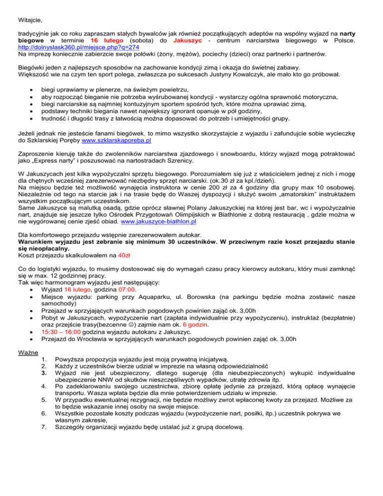Witajcie, tradycyjnie jak co roku zapraszam stałych bywalców jak również początkujących adeptów na wspólny wyjazd na narty biegowe w terminie 16 lutego (sobota) do Jakuszyc - centrum narciarstwa biegowego w Polsce. http://dolnyslask360.pl/miejsce.php?q=274 Na imprezę koniecznie zabierzcie swoje połówki (żony, mężów), pociechy (dzieci) oraz partnerki i partnerów. Biegówki jeden z najlepszych sposobów na zachowanie kondycji zimą i okazja do świetnej zabawy. Większość wie na czym ten sport polega, zwłaszcza po sukcesach Justyny Kowalczyk, ale mało kto go próbował. biegi uprawiamy w plenerze, na świeżym powietrzu, aby rozpocząć bieganie nie potrzeba wyśrubowanej kondycji - wystarczy ogólna sprawność motoryczna, biegi narciarskie są najmniej kontuzyjnym sportem spośród tych, które można uprawiać zimą, podstawy techniki biegania nawet największy ignorant opanuje w pół godziny, trudność i długość trasy z łatwością można dopasować do potrzeb i umiejętności grupy. Jeżeli jednak nie jesteście fanami biegówek, to mimo wszystko skorzystajcie z wyjazdu i zafundujcie sobie wycieczkę do Szklarskiej Poręby www.szklarskaporeba.pl Zaproszenie kieruję także do zwolenników narciarstwa zjazdowego i snowboardu, którzy wyjazd mogą potraktować jako „Express narty” i poszusować na nartostradach Szrenicy. W Jakuszycach jest kilka wypożyczalni sprzętu biegowego. Porozumiałem się już z właścicielem jednej z nich i mogę dla chętnych wcześniej zarezerwować niezbędny sprzęt narciarski. (ok.30 zł za kpl./dzień). Na miejscu będzie też możliwość wynajęcia instruktora w cenie 200 zł za 4 godziny dla grupy max 10 osobowej. Niezależnie od tego na starcie jak i na trasie będę do Waszej dyspozycji i służyć swoim „amatorskim” instruktażem wszystkim początkującym uczestnikom. Same Jakuszyce są malutką osadą, gdzie oprócz sławnej Polany Jakuszyckiej na której jest bar, wc i wypożyczalnie nart, znajduje się jeszcze tylko Ośrodek Przygotowań Olimpijskich w Biathlonie z dobrą restauracją , gdzie można w nie wygórowanej cenie zjeść obiad. www.jakuszyce-biathlon.pl Dla komfortowego przejazdu wstępnie zarezerwowałem autokar. Warunkiem wyjazdu jest zebranie się minimum 30 uczestników. W przeciwnym razie koszt przejazdu stanie się nieopłacalny. Koszt przejazdu skalkulowałem na 40zł Co do logistyki wyjazdu, to musimy dostosować się do wymagań czasu pracy kierowcy autokaru, który musi zamknąć się w max. 12 godzinnej pracy. Tak więc harmonogram wyjazdu jest następujący: Wyjazd 16 lutego, godzina 07:00. Miejsce wyjazdu: parking przy Aquaparku, ul. Borowska (na parkingu będzie można zostawić nasze samochody) Przejazd w sprzyjających warunkach pogodowych powinien zająć ok. 3,00h Pobyt w Jakuszycach, wypożyczenie nart (zapłata indywidualnie przy wypożyczeniu), instruktaż (bezpłatnie) oraz przejście trasy(bezcenne ) zajmie nam ok. 6 godzin. 15:30 – 16:00 godzina wyjazdu autokaru z Jakuszyc. Przejazd do Wrocławia w sprzyjających warunkach pogodowych powinien zająć ok. 3,00h Ważne 1. 2. 3. 4. 5. 6. 7. Powyższa propozycja wyjazdu jest moją prywatną inicjatywą. Każdy z uczestników bierze udział w imprezie na własną odpowiedzialność Wyjazd nie jest ubezpieczony, dlatego sugeruję (dla nieubezpieczonych) wykupić indywidualne ubezpieczenie NNW od skutków nieszczęśliwych wypadków, utratę zdrowia itp. Po zadeklarowaniu swojego uczestnictwa, zbiorę opłatę jedynie za przejazd, którą opłacę wynajęcie transportu. Wasza wpłata będzie dla mnie potwierdzeniem udziału w imprezie. W przypadku ewentualnej rezygnacji, nie będzie możliwy zwrot wpłaconej kwoty za przejazd. Możliwe za to będzie wskazanie innej osoby na swoje miejsce. Wszystkie pozostałe koszty podczas wyjazdu (wypożyczenie nart, posiłki, itp.) uczestnik pokrywa we własnym zakresie, Szczegóły organizacji wyjazdu będę ustalać już z grupą docelową. Podsumowując, jeżeli jesteś zainteresowana/ny wyjazdem, to proszę o zgłoszenia na mój adres e-mail [email protected] do piątku 25 stycznia z dodatkową informacją (o poniższe dane), potrzebne do kontaktu oraz do ewentualnego wypożyczenia nart biegowych. Imię i Nazwisko nr tel. komórkowego adres e-mail wzrost W przypadku jakichkolwiek pytań, dzwońcie, piszcie, jestem do Waszej dyspozycji. Pozdrawiam Mariusz Tel. 695 71 22 00 nr buta