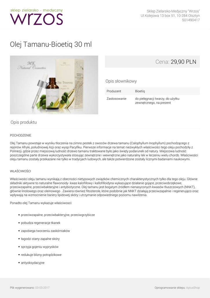 Sklep Zielarsko-Medyczny "Wrzos" Ul.Kolejowa 13 box 51, 10-284 Olsztyn 501490417 Olej Tamanu-Bioetiq 30 ml Cena: 29,90 PLN Opis słownikowy Producent Bioetiq Zastosowanie do pielęgnacji twarzy, do użytku zewnętrznego, na prezent Opis produktu POCHODZENIE Olej Tamanu powstaje w wyniku tłoczenia na zimno pestek z owoców drzewa tamanu (Calophyllum Inophyllum) pochodzącego z rejonów Afryki, południowej Azji oraz wysp Pacyfiku. Pierwsze informacje na temat niezwykłych właściwości tego oleju pochodziły z Polinezji, gdzie przez miejscową ludność drzewo tamanu traktowane było jako święty podarunek od natury. Miejscowa ludność poszczególne parte drzewa wykorzystywała stosując zewnętrzne i wewnętrzne jako naturalny lek w leczeniu wielu chorób. Właściwości oleju tamanu zostały przekazane nie tylko w tradycjach ludowych, ale także potwierdzone zostały licznymi badaniami naukowymi. WŁAŚCIWOŚCI Właściwości oleju tamanu wynikają z obecności nietypowych związków chemicznych charakterystycznych tylko dla tego oleju. Główne składniki aktywne to naturalne flawonoidy- kwas kalofillowy i kallofilloidyna wykazujące działanie gojące, przeciwobrzękowe, przeciwzapalne, przeciwbakteryjne i antybiotyczne. Olej tamanu jest bogatym żródłem nienasyconych kwasów tłuszczowych (NNKT), głównie linolowego oraz oleinowego . Zawiera również fitosterole, które podobnie jak NNKT działają przeciwzapalnie i regenerująco oraz wpływają na wzmocnienie bariery lipidowej skóry i utrzymanie odpowiedniego poziomu nawilżenia. Ponadto olej Tamanu wykazuje właściwosci: przeciwzapalne, przeciwbakteryjne, przeciwgrzybicze pobudza regeneracje tkanek zapobiega tworzeniu zaskórniaków łagodzi stany zapalne skóry sprzyja gojeniu wyprysków redukuje blizny potrądzikowe antyoksydacyjne Plik wygenerowano: 03-03-2017 Oprogramowanie sklepu: AptusShop Sklep Zielarsko-Medyczny "Wrzos" Ul.Kolejowa 13 box 51, 10-284 Olsztyn 501490417 ZASTOSOWANIE Olej Tamanu zalecany jest w szczególności do pielęgnacji skóry tłustej, trądzikowej, mieszanej, dojrzałej, zniszczonej, z problemami skórnymi. Zaleca się stosować punktowo w stanie nie rozcieńczonym na zmiany chorobowe skóry, wypryski, obrzęki, blizny. W pozostałych przypadkach można stosować oleju tamanu w rozcieńczeniu do 50 % z innymi olejami. SKŁADNIKI/ INGREDIENTS: Calophyllum Inophyllum Seed Oil Producent Bioetiq Plik wygenerowano: 03-03-2017 Powered by TCPDF (www.tcpdf.org) Oprogramowanie sklepu: AptusShop