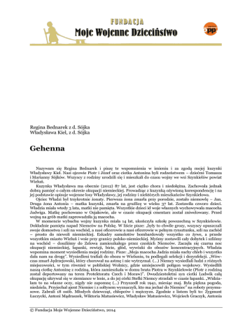 Regina Bednarek z d. Sójka Władysława Kiel, z d. Sójka Gehenna Nazywam się Regina Bednarek i piszę te wspomnienia w imieniu i za zgodą mojej kuzynki Władysławy Kieł. Nasi ojcowie Piotr i Józef oraz ciotka Antonina byli rodzeństwem – dziećmi Tomasza i Marianny Sójków. Wszyscy z rodziny urodzili się i mieszkali do czasu wojny we wsi Szynkielów powiat Wieluń. Kuzynka Władysława ma obecnie (2012) 87 lat, jest ciężko chora i niedołężna. Zachowała jednak dobrą pamięć o całym okresie okupacji niemieckiej. Prowadząc z kuzynką ożywioną korespondencję i na jej podstawie opisuje wojenne losy Władysławy, jej rodziny i niektórych mieszkańców Szynkielowa. Ojciec Władzi był trzykrotnie żonaty. Pierwsza żona zmarła przy porodzie, zostało niemowlę – Jan. Druga żona Antonia – matka kuzynki, zmarła na gruźlicę w wieku 37 lat. Zostawiła czworo dzieci. Władzia miała wtedy 3 lata, matki nie pamięta. Wszystkie dzieci id woje własnych wychowywała macocha Jadwiga. Matkę pochowano w Osjakowie, ale w czasie okupacji cmentarz został zniwelowany. Przed wojną na grób matki zaprowadziła ją macocha. W momencie wybuchu wojny kuzynka miała 14 lat, ukończyła szkołę powszechną w Szynkielowie. Dokładnie pamięta napad Niemców na Polskę. W liście pisze: „były to chwile grozy, wszyscy opuszczali swoje domostwa i szli na wschód, a nasi oficerowie a nasi oficerowie w pełnym rynsztunku, szli na zachód – prosto do niewoli niemieckiej. Eskadry samolotów bombardowały wszystko co żywe, a przede wszystkim miasto Wieluń i wsie przy granicy polsko-niemieckiej. Myśmy zostawili cały dobytek i szliśmy na wschód – doszliśmy do Zelowa zamieszkałego przez czeskich Niemców. Zaczęła się czarna noc okupacji niemieckiej, łapanki, rewizji, bicie, głód, wywózki do obozów koncentracyjnych. Władzia wspomina moment wysiedlenia mojej rodziny. Pisze: „Moja macocha Jadzia miała suchy chleb i wszystko dała nam na drogę”. Wysiedleni trafiali do obozu w Wieluniu, tu podlegali selekcji i dezynfekcji. „Wówczas zmarł Jędrzejowski, który chorował na astmę i nie wytrzymał. (…) Niemcy wysiedlali ludzi z różnych miejscowości, w tym również w pobliskiej Wolnicy, gdzie umiejscowili poligon wojskowy. Wysiedlili naszą ciotkę Antoninę z rodziną, która zamieszkała w domu brata Piotra w Szynkielowie (Piotr z rodziną został deportowany na teren Protektoratu Czech i Moraw)”. Dwudziestoletni syn ciotki Ludwik całą okupację ukrywał się w ziemiance w lesie, a do jej córki Stefki Niemcy strzelali w czasie łapanki. „Widziałam to na własne oczy, nigdy nie zapomnę (…) Przyszedł rok 1941, miesiąc maj. Była piękna pogoda, niedziela. Przyjechał ajent Niemiec i z sołtysem wyznaczyli, kto ma jechać do Niemiec” na roboty przymusowe. Zabrali 18 osób. Młodych dziewcząt, chłopców i mężczyzn. Zgodnie z listem byli to: Zygmunt Łuczycki, Antoni Mądraszek, Wiktoria Matusiewicz, Władysław Matusiewicz, Wojciech Graczyk, Antonia © Fundacja Moje Wojenne Dzieciństwo, 2014 Regina Bednarek, Władysława Kiel, Gehenna 2 Jastrząbek, Franciszek Graczyk, Helena Maciejewska, Kuliczka, Weronika Kolanek, Genowefa Woźniak, Władysław Sójka, Stefan Pachołek, Wróblewski, Stanisław Nowak, Marysia Grzela, Kazia Kopytek. Ulokowali ich w ogrodzonym baraku na 40 osób. Wyposażenie stanowiły: „ławki – zwykłe dechy, łóżka – prycze piętrowe, sienniki ze słomy, razem z poduszką i dwoma kocami, na środku kanonka. Za umywalnię służyły miski, ubikacja za barakiem. (…) Na pierwszą kolację dano nam ziemniaki polane „zozą” z przypalonej mąki”. Podróż odbywała się w wagonach towarowych. Adres majątku, do którego ich zawieziono: Sophienhof, poczta Grabowhöfe, Kreis Waren Müritz, Mecklenburg Schwerin. Majątek ziemski wraz z lasami obejmował 6000 hektarów. Oprócz Polaków w majątku pracowali: Rosjanie – 35 osób (najgorzej traktowani), Łotysze – 10 osób, Włosi – 20 osób (najlepiej traktowani), Polacy – 30 osób, Francuzi. „Podobnie jak my, wszyscy mieszkali w ogrodzonych barakach”. Warunki higieniczne były straszliwe. „Pluskwy i wszy nie do zniesienia – tak nas żarły. W każdą wolną chwilę wynosiliśmy na dwór prycze i paliliśmy pluskwy w szparach. Z powodu braku opału nocą kradliśmy brykiet, bo było bardzo zimno. Kradliśmy nocą ziemniaki z pola, tarliśmy i smażyliśmy na blasze kanonki smotruchy . Byliśmy ciągle głodni i głodni. Prawie zawsze dawano nam do jedzenia ziemniaki na barszczu i kościach. Kiedyś mieliśmy na obiad brukiew, w której było mnóstwo mięsa. Dziś wiem, co to było za mięso. Wiem jak smakuje mięso ludzkie”. Pracowali bez przerwy również w niedzielę i święta. W tych koszmarnych czasach starali się wzajemnie wspierać i sobie pomagać. Były wzajemne sympatie, a nawet miłości. „Ja w styczniu 1942 roku urodziłam córkę Irenę. Jej ojciec był dużo starszy. Miał 25, a jak niecałe 16. Pochodził również z Szynkielowa. Mieliśmy się pobrać, ale Niemcy odmówili, ślubu, ponieważ podejrzewali, że pochodzę z żydostwa, więc zażądali papierów”. Władysława takich papierów nie miała. Była czarnowłosą, drobną dziewczyną, prawie jeszcze dzieckiem. Temu mężczyźnie urodziła również drugą córkę – Jadwigę, która zmarła na dyzenterię mając 17 miesięcy. Po wojnie drogi tych młodych ludzi się rozeszły. Władzia sama wychowała i wykształciła córkę Irenę. Spośród Polaków pracujących w tym majątku „w 1942 zamordowani zostali: Józiu Kurowski, Franek Graczyk i Stanisław Szymański.” Zima 1942 roku była śnieżna i bardzo mroźna. Sarny zamarzały na polach nie mogąc dokopać się do oziminy. Taką zamarzniętą sarnę zabrali z pola Józiu, Franek i Stanisław. Sprawili ją, a skórę schowali w drewutni. Następnego dnia żandarm sprawdzał jak pracuje Polak w drewutni i znalazł