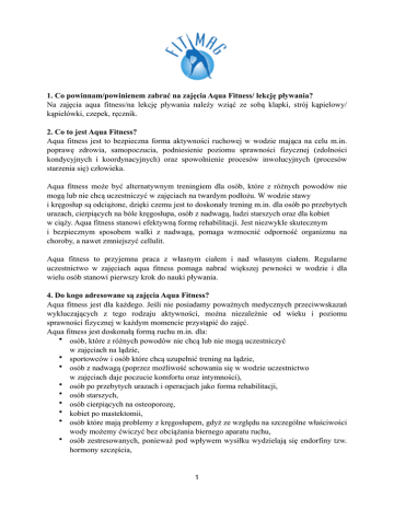 ! 1. Co powinnam/powinienem zabrać na zajęcia Aqua Fitness/ lekcję pływania? Na zajęcia aqua fitness/na lekcję pływania należy wziąć ze sobą klapki, strój kąpielowy/ kąpielówki, czepek, ręcznik. 2. Co to jest Aqua Fitness? Aqua fitness jest to bezpieczna forma aktywności ruchowej w wodzie mająca na celu m.in. poprawę zdrowia, samopoczucia, podniesienie poziomu sprawności fizycznej (zdolności kondycyjnych i koordynacyjnych) oraz spowolnienie procesów inwolucyjnych (procesów starzenia się) człowieka. Aqua fitness może być alternatywnym treningiem dla osób, które z różnych powodów nie mogą lub nie chcą uczestniczyć w zajęciach na twardym podłożu. W wodzie stawy i kręgosłup są odciążone, dzięki czemu jest to doskonały trening m.in. dla osób po przebytych urazach, cierpiących na bóle kręgosłupa, osób z nadwagą, ludzi starszych oraz dla kobiet w ciąży. Aqua fitness stanowi efektywną formę rehabilitacji. Jest niezwykle skutecznym i bezpiecznym sposobem walki z nadwagą, pomaga wzmocnić odporność organizmu na choroby, a nawet zmniejszyć cellulit. Aqua fitness to przyjemna praca z własnym ciałem i nad własnym ciałem. Regularne uczestnictwo w zajęciach aqua fitness pomaga nabrać większej pewności w wodzie i dla wielu osób stanowi pierwszy krok do nauki pływania. 4. Do kogo adresowane są zajęcia Aqua Fitness? Aqua fitness jest dla każdego. Jeśli nie posiadamy poważnych medycznych przeciwwskazań wykluczających z tego rodzaju aktywności, można niezależnie od wieku i poziomu sprawności fizycznej w każdym momencie przystąpić do zajęć. Aqua fitness jest doskonałą formą ruchu m.in. dla: • osób, które z różnych powodów nie chcą lub nie mogą uczestniczyć w zajęciach na lądzie, • sportowców i osób które chcą uzupełnić trening na lądzie, • osób z nadwagą (poprzez możliwość schowania się w wodzie uczestnictwo w zajęciach daje poczucie komfortu oraz intymności), • osób po przebytych urazach i operacjach jako forma rehabilitacji, • osób starszych, • osób cierpiących na osteoporozę, • kobiet po mastektomii, • osób które mają problemy z kręgosłupem, gdyż ze względu na szczególne właściwości wody możemy ćwiczyć bez obciążania biernego aparatu ruchu, • osób zestresowanych, ponieważ pod wpływem wysiłku wydzielają się endorfiny tzw. hormony szczęścia, 1 • kobiet w ciąży, ćwiczenia w wodzie pomogą m.in. utrzymać formę w trakcie ciąży, ułatwić sam poród oraz szybciej powrócić do formy po porodzie, dodatkowo woda pozwala na wykonywanie wszystkich ćwiczeń bez obciążania stawów, • osób które chcą zadbać o swoje zdrowie i samopoczucie, • osób które nie potrafią pływać, a chciałyby uczestniczyć w zajęciach w wodzie, • osób szukających ciekawej formy rekreacji ruchowej, • odważnych mężczyzn, którzy chcieliby złamać stereotyp, że aqua fitness to forma ruchu skierowana głównie do kobiet. Uwaga: Przed przystąpieniem do ćwiczeń zalecamy konsultację lekarską. 4. Jakie są korzyści z uczestnictwa w zajęciach Aqua Fitness ? Aqua fitness doskonale wpływa na poprawienie zdolności kondycyjnych i koordynacyjnych organizmu. Dzięki właściwościom wody, ćwiczenia które wydają się łatwe do wykonania na lądzie, w wodzie zmuszają do większego wysiłku. Jednocześnie podczas ćwiczeń w wodzie stawy są odciążone, a odczuwalny ciężar ciała w stosunku do masy rzeczywistej jest znacznie mniejszy. Dzięki uczestnictwu w zajęciach aqua fitness można liczyć m.in. na: • wysmuklenie sylwetki, • poprawę wyglądu skóry (jej ujędrnienie), • wzmocnienie układu sercowo - naczyniowego i układu oddechowego, • wzmocnienie mięśni, • poprawę wytrzymałości, gibkości i koordynacji ruchowej, • poprawę nastroju, • oswojenie się z wodą, • zwiększenie świadomości ciała, Warto podkreślić, że tylko poprzez regularne uczestnictwo w zajęciach można na co dzień cieszyć się wypracowanymi efektami, a tym samym lepszym zdrowiem, samopoczuciem i sprawnością fizyczną. Dlatego tak ważna jest systematyczność. 5. Ilu lekcji potrzebuję aby nauczyć się pływać? Trudno jest jednoznacznie, bez rozmowy i pierwszej lekcji pływania odpowiedzieć na to pytanie. Tempo nauki pływania jest uzależniona od wielu czynników m.in. od motywacji własnej, indywidualnego potencjału motorycznego, systematyczności w zajęciach, a także od wcześniejszych doświadczeń z wodą. Nauka pływania jest procesem, który w zależności od tego jakie są oczekiwania ucznia może się wydłużyć lub skrócić. 6. Dla kogo prowadzone są lekcje pływania? Lekcje pływania prowadzimy dla dzieci, młodzieży i dorosłych. Do każdej osoby podchodzimy w sposób indywidualny, dobieramy tak ćwiczenia, by nauczać skutecznie, jednocześnie pamiętając o komforcie psychicznym naszych „uczniów”. 2 3