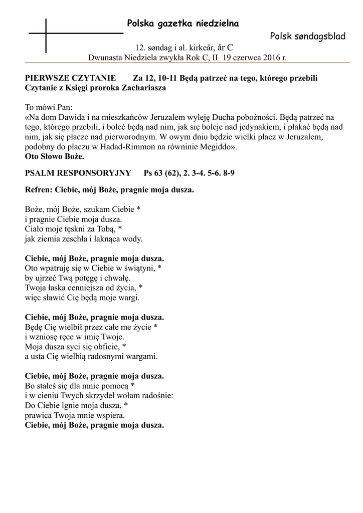 Polska gazetka niedzielna Polsk søndagsblad 12. søndag i al. kirkeår, år C Dwunasta Niedziela zwykła Rok C, II 19 czerwca 2016 r. PIERWSZE CZYTANIE Za 12, 10-11 Będą patrzeć na tego, którego przebili Czytanie z Księgi proroka Zachariasza To mówi Pan: «Na dom Dawida i na mieszkańców Jeruzalem wyleję Ducha pobożności. Będą patrzeć na tego, którego przebili, i boleć będą nad nim, jak się boleje nad jedynakiem, i płakać będą nad nim, jak się płacze nad pierworodnym. W owym dniu będzie wielki płacz w Jeruzalem, podobny do płaczu w Hadad-Rimmon na równinie Megiddo». Oto Słowo Boże. PSALM RESPONSORYJNY Ps 63 (62), 2. 3-4. 5-6. 8-9 Refren: Ciebie, mój Boże, pragnie moja dusza. Boże, mój Boże, szukam Ciebie * i pragnie Ciebie moja dusza. Ciało moje tęskni za Tobą, * jak ziemia zeschła i łaknąca wody. Ciebie, mój Boże, pragnie moja dusza. Oto wpatruję się w Ciebie w świątyni, * by ujrzeć Twą potęgę i chwałę. Twoja łaska cenniejsza od życia, * więc sławić Cię będą moje wargi. Ciebie, mój Boże, pragnie moja dusza. Będę Cię wielbił przez całe me życie * i wzniosę ręce w imię Twoje. Moja dusza syci się obficie, * a usta Cię wielbią radosnymi wargami. Ciebie, mój Boże, pragnie moja dusza. Bo stałeś się dla mnie pomocą * i w cieniu Twych skrzydeł wołam radośnie: Do Ciebie lgnie moja dusza, * prawica Twoja mnie wspiera. Ciebie, mój Boże, pragnie moja dusza. DRUGIE CZYTANIE Ga 3, 26-29 Wiara w Chrystusa znosi podziały między ludźmi Czytanie z Listu świętego Pawła Apostoła do Galatów Bracia: Wszyscy dzięki wierze jesteście synami Bożymi w Chrystusie Jezusie. Bo wy wszyscy, którzy zostaliście ochrzczeni w Chrystusie, przyoblekliście się w Chrystusa. Nie ma już żyda ani poganina, nie ma już niewolnika ani człowieka wolnego, nie ma już mężczyzny ani kobiety, wszyscy bowiem jesteście kimś jednym w Chrystusie Jezusie. Jeżeli zaś należycie do Chrystusa, to jesteście też potomstwem Abrahama i zgodnie z obietnicą dziedzicami. Oto słowo Boże. ŚPIEW PRZED EWANGELIĄ Łk 9, 23 Alleluja, Alleluja, Alleluja Jeśli kto chce iść za Mną, niech się zaprze samego siebie, niech weźmie krzyż swój i niech Mnie naśladuje. Alleluja, Alleluja, Alleluja EWANGELIA Łk 9,18-24 Wyznanie wiary w Chrystusa i zapowiedź męki, Słowa Ewangelii według świętego Łukasza Gdy Jezus modlił się na osobności, a byli z Nim uczniowie, zwrócił się do nich z zapytaniem: «Za kogo uważają Mnie tłumy?» Oni odpowiedzieli: «Za Jana Chrzciciela; inni za Eliasza; jeszcze inni mówią, że któryś z dawnych proroków zmartwychwstał». Zapytał ich: «A wy za kogo Mnie uważacie?» Piotr odpowiedział: «Za Mesjasza Bożego». Wtedy surowo im przykazał i napomniał ich, żeby nikomu o tym nie mówili. I dodał: «Syn Człowieczy musi wiele wycierpieć: będzie odrzucony przez starszych, arcykapłanów i uczonych w Piśmie; będzie zabity, a trzeciego dnia zmartwychwstanie». Potem mówił do wszystkich: «Jeśli kto chce iść za Mną, niech się zaprze samego siebie, niech co dnia weźmie swój krzyż i niech Mnie naśladuje. Bo kto chce zachować swoje życie, straci je, a kto straci swe życie z mego powodu, ten je zachowa». Oto słowo Pańskie. Zapraszamy na parafialną stronę internetową: http://fredrikstad.katolsk.no 26 czerwca o godz 13.oo w Sarpsborgu zostanie odprawiona PONTYFIKALNA Msza sw w "Ruinparken"(Borgarsyssel Museum) Wszyscy sa zaproszeni. Msze sw,. W Fredrikstad o godz 10.oo, 13.oo i 16.oo WYPADNA. Pozostanie tylko Msza sw wieczorna godz. 18.oo.