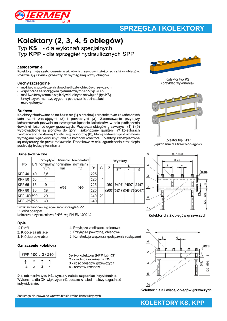 WROCŁAW SPRZĘGŁA I KOLEKTORY Kolektory (2, 3, 4, 5 obiegów) Typ KS - dla wykonań specjalnych Typ KPP - dla sprzęgieł hydraulicznych SPP Zastosowanie Kolektory mają zastosowanie w układach grzewczych złożonych z kilku obiegów. Rozdzielają czynnik grzewczy do wymaganej liczby obiegów. Kolektor typ KS (przykład wykonania) Cechy szczególne - możliwość przyłączenia dowolnej liczby obiegów grzewczych współpraca ze sprzęgłem hydraulicznym SPP (typ KPP) możliwość wykonania wg indywidualnych rozwiązań (typ KS) łatwy i szybki montaż, wygodne podłączenie do instalacji małe gabaryty Budowa Kolektory zbudowane są na bazie rur (1) o przekroju prostokątnym zakończonych kołnierzami zasilającymi (2) i powrotnymi (3). Zastosowanie przyłączy kołnierzowych pozwala na szeregowe łączenie kolektorów, w celu podłączenia dowolnej ilości obiegów grzewczych. Przyłącza obiegów grzewczych (4) i (5) wyprowadzone są pionowo do góry i zakończone gwintem. W kolektorach zastosowano nastawną konstrukcję wsporczą (6), której zadaniem jest ustalenie wymaganej wysokości usytuowania króćców kolektora. Kolektory zabezpieczone są antykorozyjnie przez malowanie. Dodatkowo w celu ograniczenia strat ciepła posiadają izolację termiczną. Kolektor typ KPP (wykonanie dla trzech obiegów) Dane techniczne Przepływ Ciśnienie Temperatura DN nominalny nominalne nominalna 3 B* m /h bar C O 3xZ Wymiary G KPP 40 40 3,5 KPP 50 50 4 KPP 65 65 9 KPP 80 80 13 KPP 100 100 20 340 2” KPP 125 125 30 340 Z 3** L 4 4 G Z 5 opcja 225 2 110 225 250 1497 1997 2497 225 (200) (1247) (1647) (2047) 3 DN 6/10 B 225 ½ ” 420 - 570 Typ 997(847) 5 6 * rozstaw króćców wg wymiarów sprzęgła SPP ** liczba obiegów Kołnierze przyłączeniowe PN16, wg PN-EN 1092-1 1 Kolektor dla 2 obiegów grzewczych Opis 4. Przyłącze zasilające, obiegowe 5. Przyłącze powrotne, obiegowe 6. Konstrukcja wsporcza (połączenie rozłączne) 1. Profil 2. Króćce zasilające 3. Krócice powrotne 5 L Z G 4 Oznaczenie kolektora 2 3 4 Dla kolektorów typu KS, wymiary należy uzgadniać indywidualnie. Wykonania dla DN większych niż podane w tabeli, należy uzgadniać indywidualnie. B 3 420 - 570 1 2 1- typ kolektora (KPP lub KS) 2 - średnica nominalna DN 3 - ilość obiegów grzewczych 4 - rozstaw króćców DN KPP 100 / 3 / 250 opcja 6 1 Kolektor dla 3 i więcej obiegów grzewczych Zastrzega się prawo do wprowadzenia zmian konstrukcyjnych KOLEKTORY KS, KPP