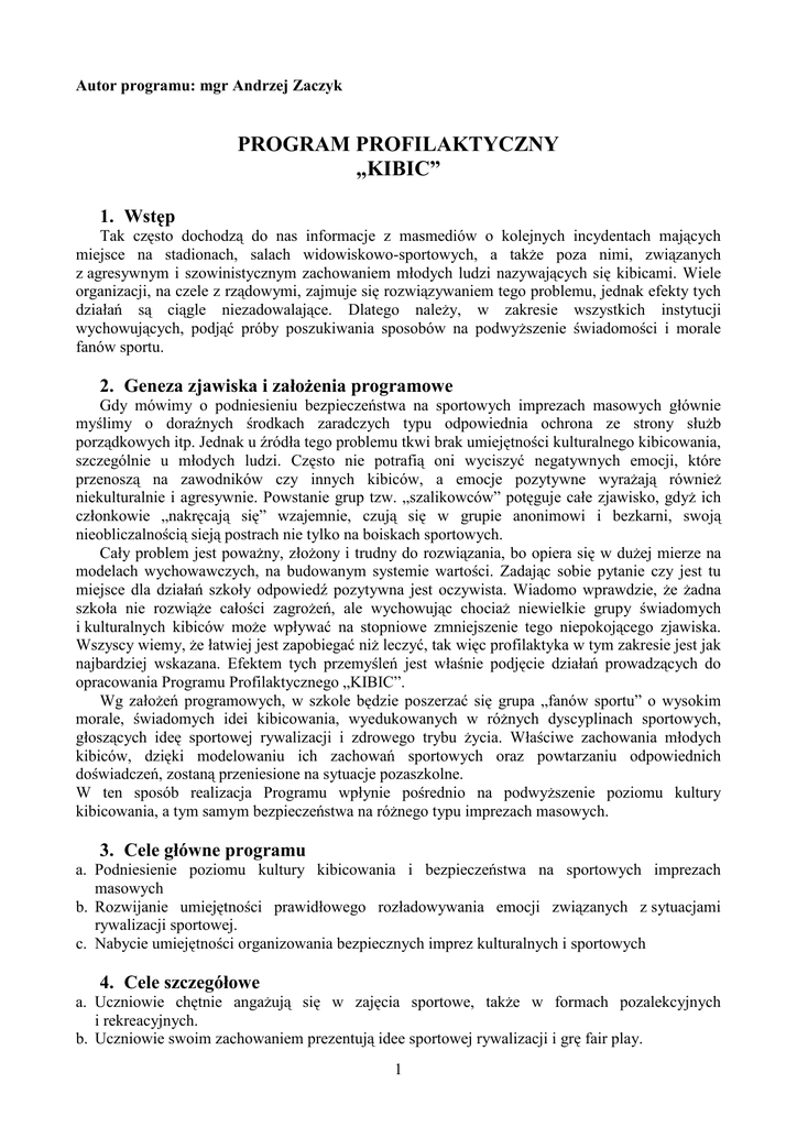 Autor programu: mgr Andrzej Zaczyk PROGRAM PROFILAKTYCZNY „KIBIC” 1. Wstęp Tak często dochodzą do nas informacje z masmediów o kolejnych incydentach mających miejsce na stadionach, salach widowiskowo-sportowych, a także poza nimi, związanych z agresywnym i szowinistycznym zachowaniem młodych ludzi nazywających się kibicami. Wiele organizacji, na czele z rządowymi, zajmuje się rozwiązywaniem tego problemu, jednak efekty tych działań są ciągle niezadowalające. Dlatego należy, w zakresie wszystkich instytucji wychowujących, podjąć próby poszukiwania sposobów na podwyższenie świadomości i morale fanów sportu. 2. Geneza zjawiska i założenia programowe Gdy mówimy o podniesieniu bezpieczeństwa na sportowych imprezach masowych głównie myślimy o doraźnych środkach zaradczych typu odpowiednia ochrona ze strony służb porządkowych itp. Jednak u źródła tego problemu tkwi brak umiejętności kulturalnego kibicowania, szczególnie u młodych ludzi. Często nie potrafią oni wyciszyć negatywnych emocji, które przenoszą na zawodników czy innych kibiców, a emocje pozytywne wyrażają również niekulturalnie i agresywnie. Powstanie grup tzw. „szalikowców” potęguje całe zjawisko, gdyż ich członkowie „nakręcają się” wzajemnie, czują się w grupie anonimowi i bezkarni, swoją nieobliczalnością sieją postrach nie tylko na boiskach sportowych. Cały problem jest poważny, złożony i trudny do rozwiązania, bo opiera się w dużej mierze na modelach wychowawczych, na budowanym systemie wartości. Zadając sobie pytanie czy jest tu miejsce dla działań szkoły odpowiedź pozytywna jest oczywista. Wiadomo wprawdzie, że żadna szkoła nie rozwiąże całości zagrożeń, ale wychowując chociaż niewielkie grupy świadomych i kulturalnych kibiców może wpływać na stopniowe zmniejszenie tego niepokojącego zjawiska. Wszyscy wiemy, że łatwiej jest zapobiegać niż leczyć, tak więc profilaktyka w tym zakresie jest jak najbardziej wskazana. Efektem tych przemyśleń jest właśnie podjęcie działań prowadzących do opracowania Programu Profilaktycznego „KIBIC”. Wg założeń programowych, w szkole będzie poszerzać się grupa „fanów sportu” o wysokim morale, świadomych idei kibicowania, wyedukowanych w różnych dyscyplinach sportowych, głoszących ideę sportowej rywalizacji i zdrowego trybu życia. Właściwe zachowania młodych kibiców, dzięki modelowaniu ich zachowań sportowych oraz powtarzaniu odpowiednich doświadczeń, zostaną przeniesione na sytuacje pozaszkolne. W ten sposób realizacja Programu wpłynie pośrednio na podwyższenie poziomu kultury kibicowania, a tym samym bezpieczeństwa na różnego typu imprezach masowych. 3. Cele główne programu a. Podniesienie poziomu kultury kibicowania i bezpieczeństwa na sportowych imprezach masowych b. Rozwijanie umiejętności prawidłowego rozładowywania emocji związanych z sytuacjami rywalizacji sportowej. c. Nabycie umiejętności organizowania bezpiecznych imprez kulturalnych i sportowych 4. Cele szczegółowe a. Uczniowie chętnie angażują się w zajęcia sportowe, także w formach pozalekcyjnych i rekreacyjnych. b. Uczniowie swoim zachowaniem prezentują idee sportowej rywalizacji i grę fair play. 1 c. Uczniowie potrafią właściwie wyrażać werbalnie i niewerbalnie emocje towarzyszące udziałowi w imprezach sportowych. d. Uczniowie kreatywnie wpływają na życie kulturalno-sportowe szkoły (organizacja i prowadzenie konkursów, debat, prowadzenie strony internetowej, organizacja zawodów wewnątrzszkolnych itp.) 5. Koordynacja Programu mgr Andrzej Zaczyk 6. Realizatorzy Programu Nauczyciele wychowania fizycznego Zespołu Szkół Integracyjnych nr 1 im. R. Oszka w Katowicach 7. Osoby współpracujące w realizacji Programu Wychowawcy klas, psycholog i pedagog szkolny 8. Wspomaganie środowiskowe Szkolny Związek Sportowy UKS w ZSI nr 1 GKS Katowice Ruch Chorzów Policja ŚPP „Dzieci Tysiąclecia – Integracja” 9. Adresaci programu a. Uczniowie klas 4-6 Szkoły Podstawowej nr 58 z Oddziałami Integracyjnymi w Zespole Szkół Integracyjnych nr 1 w Katowicach b. Uczniowie Gimnazjum Integracyjnego nr 36 w Zespole Szkół Integracyjnych nr 1 w Katowicach 10.Czas realizacji programu II półrocze roku szkolnego 2008/2009, rok szkolny 2009/2010 2 11. Zadania programowe (edukacyjno-wychowawcze): Lp. Zadanie programowe Formy realizacji 1. Rozwijanie 1. Prezentowanie zachowań kibiców z wykorzystaniem urządzeń multimedialnych – analiza zachowań. umiejętności radzenia sobie z emocjami 2. Lekcje wychowawcze dotyczące zagadnień kibicowania, tolerancji oraz fair play. podczas rozgrywek sportowych (jako 3. Prowadzenie z uczniami zajęć edukacyjnych o tematyce sportowej uczestnik oraz jako podczas których uczniowie nabędą i doskonalić będą umiejętności sportowej rywalizacji i gry fair play. kibic) 4. Spotkania z piłkarzami i trenerami. 5. spotkania z policjantami – zapoznanie uczniów z konsekwencjami prawnymi związanymi z naruszeniem ładu i porządku publicznego na terenie obiektu sportowego. 6. Udział w szkolnych rozgrywkach sportowych - upowszechnianie zasad sportowej rywalizacji i gry fair play. 7. Kibicowanie w meczach mistrzowskich gier zespołowych – trening zachowań. 2. Nabycie lub rozwój 1. Budowanie planu działań w zakresie organizacji imprez sportowych umiejętności z określeniem rozdziału zadań wg predyspozycji i kompetencji organizatorskich oraz uczniów. pracy w zespole 2. Współudział w organizacji imprez kulturalno – sportowych: - Dzień Sportu Szkolnego. - Zawody koszykówki w ramach programu „Basketmania”. - Mistrzostw szkoły w różnych dyscyplinach sportowych. - Rozgrywek sportowych pomiędzy reprezentacją uczniów i nauczycieli. 3. Prowadzenie ćwiczeń praktycznych w zakresie budowania zespołu – więzi zespołowe, korzystanie z zasobów członków grupy. 3. Doskonalenie form 1. Doskonalenie fo