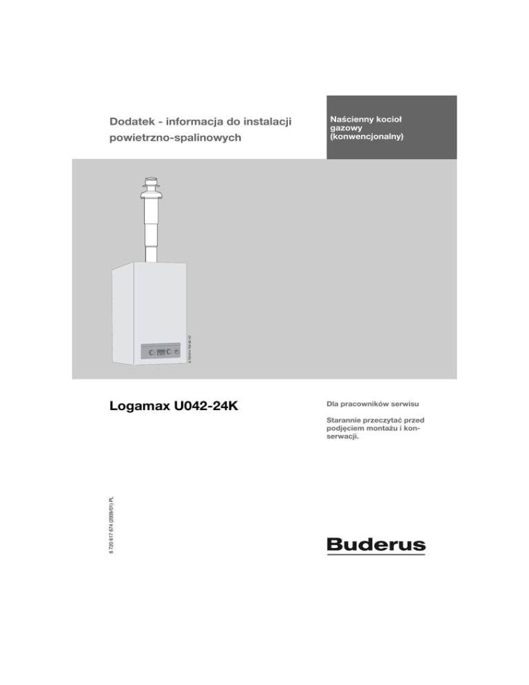 Dodatek - informacja do instalacji reset 6 720 614 742-00.1O powietrzno-spalinowych Naścienny kocioł gazowy (konwencjonalny) Logamax U042-24K Dla pracowników serwisu 6 720 617 674 (2009/01) PL Starannie przeczytać przed podjęciem montażu i konserwacji. Spis treści Spis treści 1 Wskazówki dotyczące bezpieczeństwa i objaśnienie symboli . . . . . . . . . . . . . . . . . . . .3 1.1 Objaśnienie symboli . . . . . . . . . . . . . . . . . 3 1.2 Wskazówki dotyczące bezpieczeństwa . 3 2 Zastosowanie . . . . . . . . . . . . . . . . . . . . . . . . . . 4 2.1 Informacje ogólne . . . . . . . . . . . . . . . . . . 4 2.2 Gazowy kocioł naścienny . . . . . . . . . . . . 4 2.3 Wskazówki dotyczące montażu . . . . . . . 4 2.4 Zestawienie elementów dodatkowych instalacji powietrzno-spalinowej . . . . . . . .4 2.5 Klasyfikacja rozwiązań systemu powietrzno-spalinowego według CEN . . .5 3 Poziomy system powietrzno-spalinowy . . . . 3.1 Wymiary montażowe . . . . . . . . . . . . . . . . 3.2 Dobór przesłony dławiącej . . . . . . . . . . . 3.3 Przykład montażu . . . . . . . . . . . . . . . . . . 4 Pionowy system powietrzno-spalinowy . . . . 9 4.1 Wymiary montażowe . . . . . . . . . . . . . . . . 9 4.2 Dobór pzresłony dławiącej . . . . . . . . . . 10 4.3 Przykłady montażu . . . . . . . . . . . . . . . . 11 5 System rozdzielczy . . . . . . . . . . . . . . . . . . . . 5.1 Wymiary montażowe . . . . . . . . . . . . . . . 5.2 Dobór przesłony dławiącej . . . . . . . . . . 5.3 Przykłady montażu . . . . . . . . . . . . . . . . 2 6 6 7 8 12 12 14 16 Logamax U042-24K - Zastrzega się prawo do zmian spowodowanych ulepszeniami technicznymi! Wskazówki dotyczące bezpieczeństwa i objaśnienie symboli 1 1 Wskazówki dotyczące bezpieczeństwa i objaśnienie symboli 1.1 Objaśnienie symboli Informacje ostrzegawcze Wskazówki ostrzegawcze oznaczone są w tekście trójkątem ostrzegawczym i przedstawione są na szarym tle. W przypadku niebezpieczeństw związanych z prądem elektrycznym znak wykrzyknika w trójkącie ostrzegawczym zastąpiony jest symbolem błyskawicy. Słowa ostrzegawcze na początku wskazówki ostrzegawczej oznaczają rodzaj i ciężar gatunkowy zagrożenia, jeżeli nie wykonane zostaną działania do zapobieżenia zagrożeniu. • WSKAZÓWKA oznacza, że mogą występować szkody materialne. • UWAGA oznacza, że może dojść do lekkich (do średniociężkich) obrażeń u ludzi. • OSTRZEŻENIE oznacza, że mogą wystąpić ciężkie obrażenia u ludzi. • NIEBEZPIECZEŃSTWO oznacza, że może dojść do zagrażających życiu obrażeń u ludzi. 1.2 Wskazówki dotyczące bezpieczeństwa Tylko przestrzeganie treści zawartych w instrukcji montażu zapewnia prawidłowe działanie. Zastrzega się możliwość wprowadzenia zmian. Montaż może wykonać tylko uprawniony instalator. W trakcie montażu kotła należy stosować się do odpowiedniej instrukcji montażu. Niebezpieczeństwo w razie stwierdzenia zapachu spalin B Wyłączyć urządzenie. B Otworzyć okna i drzwi. B Powiadomić uprawnioną firmę instalacyjną. Ustawienie, przebudowa B Urządzenie może być montowane lub przebudowywane tylko przez uprawnioną firmę instalacyjną. B Nie dokonywać jakichkolwiek zmian elementów odprowadzenia spalin. Ważne informacje Ważne informacje nie zawierające zagrożeń dla ludzi lub rzeczy oznaczone są symbolem znajdującym się obok. Ograniczone są one liniami powyżej i poniżej tekstu. Inne symbole Symbol Znaczenie B Krok czynności Æ Odsyłacz do innych miejsc w dokumencie lub innych dokumentów. • Wyliczanie/wpis na liście – Wyliczenie/wpis na liście (2 płaszczyzna) Tab. 1 Logamax U042-24K - Zastrzega się prawo do zmian spowodowanych ulepszeniami technicznymi! 3 2 Zastosowanie 2 Zastosowanie 2.1 Informacje ogólne Przed montażem kotła i instalacji powietrznospalinowej należy uzyskać zgodę właściwego urzędu budowlanego oraz kominiarza. Elementy dodatkowe instalacji powietrzno-spalinowej są składnikiem dopuszczenia CE. Z tego powodu należy stosować wyłącznie oryginalne dodatkowe elementy instalacji spalinowej. Temperatura powierzchni rury doprowadzającej powietrze do spalania dla rur koncentrycznych jest niższa niż 85 °C. Zgodnie z niemieckimi zasadami technicznymi dla instalacji gazowych (TRGI) 1986 lub zasadami technicznymi dla gazu płynnego (TRF) 1988 nie są wymagane minimalne odstępy rur spalinowych od palnych materiałów konstrukcyjnych. Przepisy poszczególnych krajów związkowych (dotyczące palenisk, przepisy budowlane) mogą się jednak różnić i wymagać minimalnych odstępów od palnych materiałów konstrukcyjnych. Temperatura powierzchni rury odprowadzającej spaliny przy systemie rozdzielczym krótszym niż 3 m może przekroczyć 85 °C. W tym przypadku oddzielić rurę spalinową przy pomocy odpowiednich środków (np. wełna mineralna) od palnych materiałów konstrukcyjnych. 2.2 PRZESTROGA: Niska sprawność i problemy z działaniem w razie użycia nieodpowiedniej przesłony dławiącej (kryzy). B Stosować tylko przesłony dławiące o właściwej średnicy Gazowy kocioł naścienny Gazowy kocioł naścienny Nr identyfikacyjny produktu U042-24K CE-0085 BS0124 Tab. 2 Wymienione naścienne kotły gazowe zostały przetestowane i dopuszczone zgodnie z dyrektywami dotyczącymi urządzeń gazowych WE (90/396/EWG, 92/42/EWG, 2006/95/WE, 2004/108/WE) oraz EN483. 2.3 • Spaliny są odprowadzane w sposób zależny od powietrza w pomieszczeniu typ B22, B32 lub w sposób niezależny od powietrza w pomieszczeniu typ C12, C32, C42, C52 lub C82. • Instalację powietrzno-spalinową można wykonać jako system rur koncentrycznych (rura w rurze) Ø 60/100 mm lub jako system rozdzielczy z rurami pojedynczymi (system równoległy) Ø 80 mm. • W przypadku przyłącza z rozdzielonymi rurami typu C52 wylot spalin i wlot powietrza do spalania nie powinny być umieszczone na przeciwległych stronach budynku. • W przypadku przy
