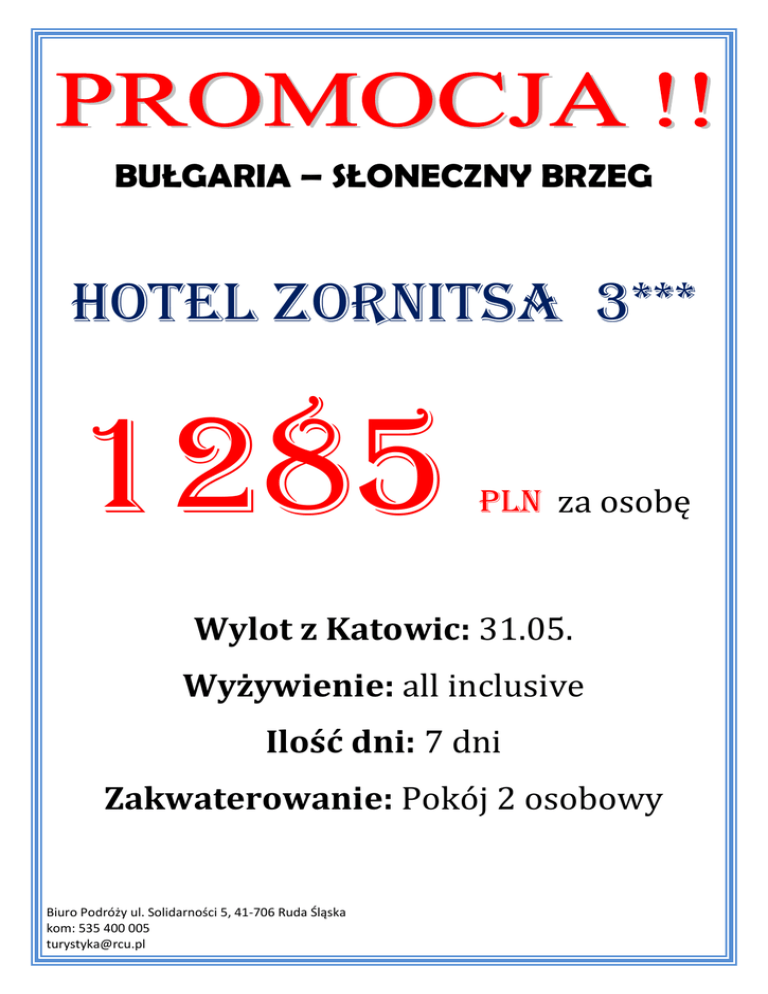BUŁGARIA – SŁONECZNY BRZEG Hotel ZORNITSA 3*** 1285 pln za osobę Wylot z Katowic: 31.05. Wyżywienie: all inclusive Ilość dni: 7 dni Zakwaterowanie: Pokój 2 osobowy Biuro Podróży ul. Solidarności 5, 41-706 Ruda Śląska kom: 535 400 005 [email protected]