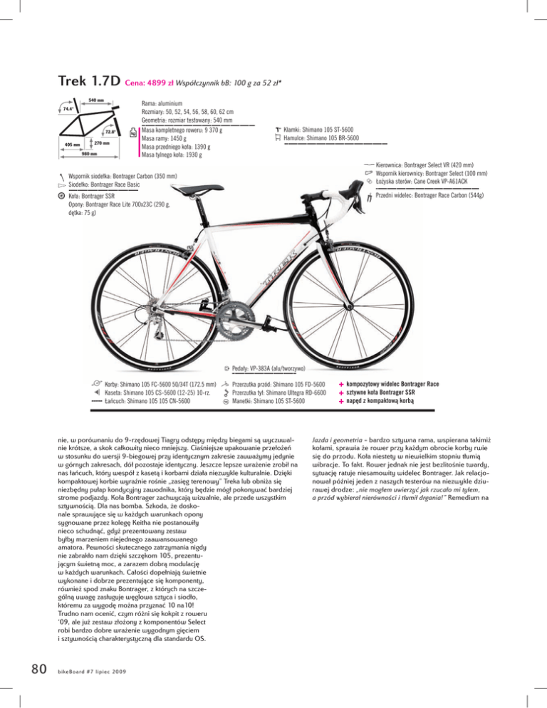 Trek 1.7D Cena: 4899 zł Współczynnik bB: 100 g za 52 zł* 540 mm Rama: aluminium Rozmiary: 50, 52, 54, 56, 58, 60, 62 cm Geometria: rozmiar testowany: 540 mm 74.4° 72.8° 405 mm 270 mm 980 mm Masa kompletnego roweru: 9 370 g Masa ramy: 1450 g Masa przedniego koła: 1390 g Masa tylnego koła: 1930 g Klamki: Shimano 105 ST-5600 Hamulce: Shimano 105 BR-5600 Kierownica: Bontrager Select VR (420 mm) Wspornik kierownicy: Bontrager Select (100 mm) Łożyska sterów: Cane Creek VP-A61ACK Wspornik siodełka: Bontrager Carbon (350 mm) Siodełko: Bontrager Race Basic Przedni widelec: Bontrager Race Carbon (544g) Koła: Bontrager SSR Opony: Bontrager Race Lite 700x23C (290 g, dętka: 75 g) Pedały: VP-383A (alu/tworzywo) Korby: Shimano 105 FC-5600 50/34T (172.5 mm) Kaseta: Shimano 105 CS-5600 (12-25) 10-rz. Łańcuch: Shimano 105 105 CN-5600 Przerzutka przód: Shimano 105 FD-5600 Przerzutka tył: Shimano Ultegra RD-6600 Manetki: Shimano 105 ST-5600 kompozytowy widelec Bontrager Race sztywne koła Bontrager SSR napęd z kompaktową korbą nie, w porównaniu do 9-rzędowej Tiagry odstępy między biegami są wyczuwalJazda i geometria - bardzo sztywna rama, wspierana takimiż nie krótsze, a skok całkowity nieco mniejszy. Ciaśniejsze upakowanie przełożeń kołami, sprawia że rower przy każdym obrocie korby rwie w stosunku do wersji 9-biegowej przy identycznym zakresie zauważymy jedynie się do przodu. Koła niestety w niewielkim stopniu tłumią w górnych zakresach, dół pozostaje identyczny. Jeszcze lepsze wrażenie zrobił na wibracje. To fakt. Rower jednak nie jest bezlitośnie twardy, nas łańcuch, który wespół z kasetą i korbami działa niezwykle kulturalnie. Dzięki sytuację ratuje niesamowity widelec Bontrager. Jak relacjokompaktowej korbie wyraźnie rośnie „zasięg terenowy” Treka lub obniża się nował później jeden z naszych testerów na niezwykle dziuniezbędny pułap kondycyjny zawodnika, który będzie mógł pokonywać bardziej rawej drodze: „nie mogłem uwierzyć jak rzucało mi tyłem, strome podjazdy. Koła Bontrager zachwycają wizualnie, ale przede wszystkim a przód wybierał nierówności i tłumił drgania!” Remedium na sztywnością. Dla nas bomba. Szkoda, że doskonale sprawujące się w każdych warunkach opony sygnowane przez kolegę Keitha nie postanowiły nieco schudnąć, gdyż prezentowany zestaw byłby marzeniem niejednego zaawansowanego Na zjeździe rozgrywamy speedway. Jest tak ślisko, że albo się prowadzi, amatora. Pewności skutecznego zatrzymania nigdy albo się jedzie z jedną nogą odpiętą. W pierwszy zakręt wchodzę trochę nie zabrakło nam dzięki szczękom 105, prezentuza szeroko i na wyjściu po zielonej bandzie wykorzystują to zawodnicy jącym świetną moc, a zarazem dobrą modulację krzyczący Marma Polskie Folie [dla nieznających tematu - klub żużlowy w każdych warunkach. Całości dopełniają świetnie z Rzeszowa - przyp. red.] w kaskach czerwonym i czarnym - tak swoje wykonane i dobrze prezentujące się komponenty, zmagania z cyklem maratonów Cyklokarpaty.pl opisuje nasz człowiek, również spod znaku Bontrager, z których na szczeMaciek Dziedzic z Sikorski bikeBoard Team. Na stronie internetowej www. gólną uwagę zasługuje węglowa sztyca i siodło, bikeBoard.pl możecie przeczytać więcej autorskich relacji i obejrzeć zdjęktóremu za wygodę można przyznać 10 na10! cia z innych cykli, na których się pojawiamy. A gdzie można nas spotkać? Trudno nam ocenić, czym różni się kokpit z roweru Cykle Mazovia MTB Marathon, Powerade MTB Marathon, Świętokrzyska ‘09, ale już zestaw złożony z komponentów Select Liga Rowerowa, Eska Fujifilm Bike Maraton i wspomniane wyżej Cyklorobi bardzo dobre wrażenie wygodnym gięciem karpaty. Na www.bikeBoard.pl znajdziecie nasze relacje i komentarze i sztywnością charakterystyczną dla standardu OS. z krajowych zawodów. (woj) 80 bi ke Bo ar d # 7 l i pi e c 2009