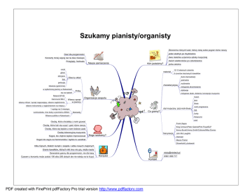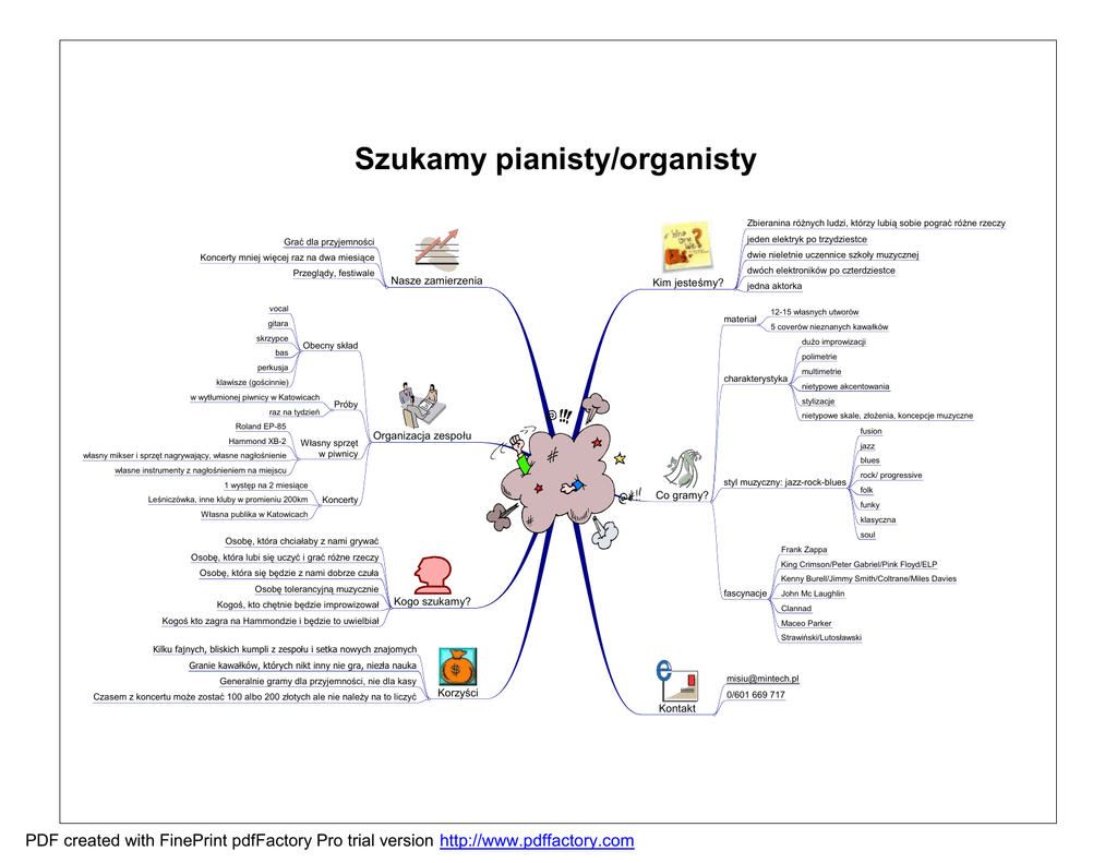 Szukamy pianisty/organisty Zbieranina różnych ludzi, którzy lubią sobie pograć różne rzeczy jeden elektryk po trzydziestce Grać dla przyjemności dwie nieletnie uczennice szkoły muzycznej Koncerty mniej więcej raz na dwa miesiące Przeglądy, festiwale dwóch elektroników po czterdziestce Nasze zamierzenia Kim jesteśmy? jedna aktorka vocal materiał gitara skrzypce bas 12-15 własnych utworów 5 coverów nieznanych kawałków dużo improwizacji Obecny skład polimetrie perkusja charakterystyka klawisze (gościnnie) w wytłumionej piwnicy w Katowicach raz na tydzień multimetrie nietypowe akcentowania stylizacje Próby nietypowe skale, złożenia, koncepcje muzyczne Roland EP-85 Hammond XB-2 własny mikser i sprzęt nagrywający, własne nagłośnienie Własny sprzęt w piwnicy fusion Organizacja zespołu jazz blues własne instrumenty z nagłośnieniem na miejscu styl muzyczny: jazz-rock-blues 1 występ na 2 miesiące Leśniczówka, inne kluby w promieniu 200km Co gramy? Koncerty folk funky Własna publika w Katowicach klasyczna soul Osobę, która chciałaby z nami grywać Frank Zappa Osobę, która lubi się uczyć i grać różne rzeczy King Crimson/Peter Gabriel/Pink Floyd/ELP Osobę, która się będzie z nami dobrze czuła Kenny Burell/Jimmy Smith/Coltrane/Miles Davies Osobę tolerancyjną muzycznie Kogoś, kto chętnie będzie improwizował rock/ progressive fascynacje Kogo szukamy? John Mc Laughlin Clannad Kogoś kto zagra na Hammondzie i będzie to uwielbiał Maceo Parker Strawiński/Lutosławski Kilku fajnych, bliskich kumpli z zespołu i setka nowych znajomych Granie kawałków, których nikt inny nie gra, niezła nauka [email protected] Generalnie gramy dla przyjemności, nie dla kasy Czasem z koncertu może zostać 100 albo 200 złotych ale nie należy na to liczyć Korzyści 0/601 669 717 Kontakt PDF created with FinePrint pdfFactory Pro trial version http://www.pdffactory.com