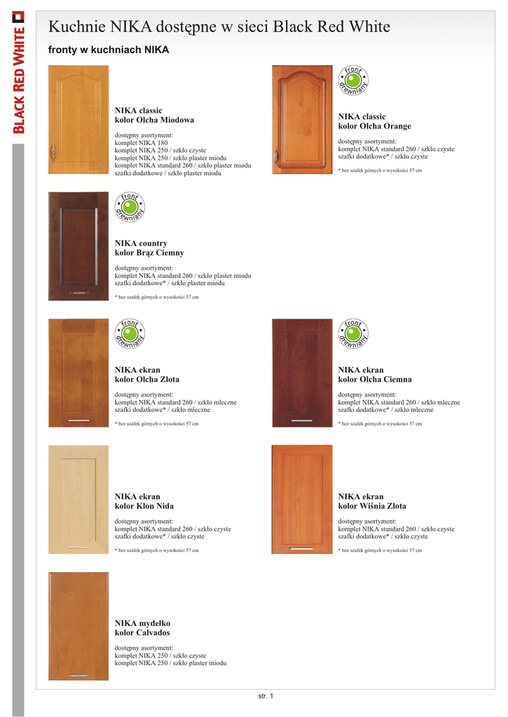 Kuchnie NIKA dostêpne w sieci Black Red White fronty w kuchniach NIKA NIKA classic kolor Olcha Miodowa NIKA classic kolor Olcha Orange dostêpny asortyment: komplet NIKA 180 komplet NIKA 250 / szk³o czyste komplet NIKA 250 / szk³o plaster miodu komplet NIKA standard 260 / szk³o plaster miodu szafki dodatkowe / szk³o plaster miodu dostêpny asortyment: komplet NIKA standard 260 / szk³o czyste szafki dodatkowe* / szk³o czyste * bez szafek górnych o wysokoœci 57 cm NIKA country kolor Br¹z Ciemny dostêpny asortyment: komplet NIKA standard 260 / szk³o plaster miodu szafki dodatkowe* / szk³o plaster miodu * bez szafek górnych o wysokoœci 57 cm NIKA ekran kolor Olcha Z³ota NIKA ekran kolor Olcha Ciemna dostêpny asortyment: komplet NIKA standard 260 / szk³o mleczne szafki dodatkowe* / szk³o mleczne dostêpny asortyment: komplet NIKA standard 260 / szk³o mleczne szafki dodatkowe* / szk³o mleczne * bez szafek górnych o wysokoœci 57 cm * bez szafek górnych o wysokoœci 57 cm NIKA ekran kolor Klon Nida NIKA ekran kolor Wiœnia Z³ota dostêpny asortyment: komplet NIKA standard 260 / szk³o czyste szafki dodatkowe* / szk³o czyste dostêpny asortyment: komplet NIKA standard 260 / szk³o czyste szafki dodatkowe* / szk³o czyste * bez szafek górnych o wysokoœci 57 cm * bez szafek górnych o wysokoœci 57 cm NIKA myde³ko kolor Calvados dostêpny asortyment: komplet NIKA 250 / szk³o czyste komplet NIKA 250 / szk³o plaster miodu str. 1 Kuchnie NIKA dostêpne w sieci Black Red White fronty w kuchniach NIKA NIKA ramka kolor Jab³oñ Ciemna NIKA ramka A kolor Sosna Antyczna dostêpny asortyment: komplet NIKA 180 komplet NIKA 250 / szk³o z³ote listewki komplet NIKA standard 260 / szk³o z³ote listewki szafki dodatkowe / szk³o z³ote listewki dostêpny asortyment: komplet NIKA standard 260 / szk³o z³ote listewki szafki dodatkowe* / szk³o z³ote listewki NIKA rubia kolor Brzoza Jasna NIKA portal kolor Czereœnia Antyczna dostêpny asortyment: komplet NIKA fantazja 260 / szk³o z³ote listewki szafki dodatkowe* / szk³o z³ote listewki dostêpny asortyment: komplet NIKA standard 260 / szk³o plaster miodu szafki dodatkowe / szk³o plaster miodu * bez szafek górnych o wysokoœci 57 cm * bez szafek górnych o wysokoœci 57 cm NIKA soft kolor Techno dostêpny asortyment: komplet NIKA 250 / szk³o czyste komplet NIKA 250 / szk³o plaster miodu komplet NIKA standard 260 / szk³o plaster miodu szafki dodatkowe / szk³o plaster miodu NIKA tafla kolor Wanilia NIKA tafla kolor Olcha San dostêpny asortyment: komplet NIKA 250 / szk³o imitacja aluramki komplet NIKA standard 260 / szk³o imitacja aluramki szafki dodatkowe / szk³o imitacja aluramki dostêpny asortyment: komplet NIKA 250 / szk³o imitacja aluramki komplet NIKA standard 260 / szk³o imitacja aluramki szafki dodatkowe / szk³o imitacja aluramki NIKA tafla lakier kolor Wenge NIKA tafla lakier kolor Wiœnia Z³ota dostêpny asortyment: komplet NIKA standard 260 / szk³o mleczne (ramka al.) szafki dodatkowe* / szk³o mleczne (ramka al.) dostêpny asortyment: komplet NIKA standard 260 / szk³o mleczne (ramka al.) szafki dodatkowe* / szk³o mleczne (ramka al.) * bez szafek górnych o wysokoœci 57 cm * bez szafek górnych o wysokoœci 57 cm str. 2 Kuchnie NIKA dostêpne w sieci Black Red White komplety i szafki dodatkowe w kuchniach NIKA 1800 mm 2500 mm 400 mm 800 mm 400 mm 500 mm 800 mm 716 mm 573 mm - komplet NIKA 180 + okap >50< cm (NIKA_180 GO50) - komplet NIKA 180 + okap >60< cm (NIKA_180 GO60) blat #28 mm miejsce na kuchenkê wolnostoj¹c¹ 800 mm 400 mm 500 mm 400 mm 800 mm 2600 mm 400 mm blat #28 mm blat #28 mm 800 mm 400 mm 800 mm 600 mm 2600 mm 800 mm 600 mm 800 mm 400 mm 800 mm blat #28 mm blat #28 mm 800 mm 400 mm 600 mm 716 mm 716 mm 800 mm blat #28 mm 820 mm + blat 820 mm + blat blat #28 mm 600 mm opcje zakupu: - komplet NIKA 180 blat #28 mm 800 mm blat #28 mm 820 mm + blat 820 mm + blat blat #28 mm NKGNZ-30/72 NKG-15/72 NKG-30/72-P 800 mm NKG-40/72-P 600 mm NKG-50/72-P NKG-40/57-P NKGO-50/40-O NKDNZL-30/82 NKD-15/82 NKD-30/82-P NKD-40/82-P NKG-60/72-L/P NKG-80/72-L/P NKG-80/72-LV/PV NKG-60/57-L/P NKG-80/57-L/P NKG-80/57-LV/PV 800 mm NKGC-80/72-L/P 600 mm NKGNWU-60/72-P NKGO-60/40-O NKD-60/82-L/P NKD-80/82-L/P NKDK-80/82-L/P NKDNW-90/82-P/P w kuchniach NIKA tafla fronty witryn s¹ w ca³oœci szklane (imitacja aluramki) NKD1S30/82-P/S NKD4S40/82-S/3S NKD1S50/82-P/S NKDP-60/82-K str. 3 w kuchniach NIKA tafla lakier witryny wykonane s¹ z ramki aluminiowej, dostêpne tylko w szafkach górnych o wys. 72 cm