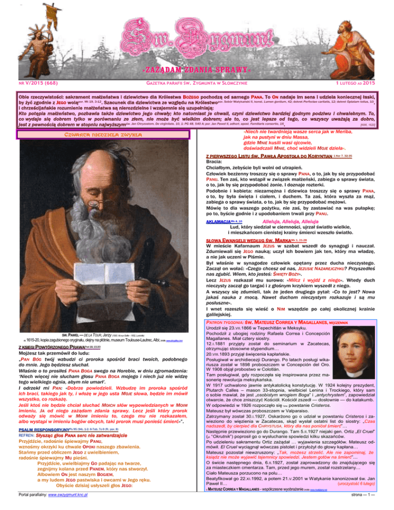 »ZAŻĄDAM NR V/2015 (668) ZDANIA SPRAWY« GAZETKA PARAFII ŚW. ZYGMUNTA W SŁOMCZYNIE 1 LUTEGO AD 2015 Obie rzeczywistości: sakrament małżeństwa i dziewictwo dla Królestwa BOŻEGO pochodzą od samego PANA. To ON nadaje im sens i udziela koniecznej łaski, by żyć zgodnie z JEGO woląpor. Mt 19, 3-12. Szacunek dla dziewictwa ze względu na Królestwopor. Sobór Watykański II, konst. Lumen gentium, 42; dekret Perfectae caritatis, 12; dekret Optatam totius, 10. i chrześcijańskie rozumienie małżeństwa są nierozdzielne i wzajemnie się uzupełniają: Kto potępia małżeństwo, pozbawia także dziewictwo jego chwały; kto natomiast je chwali, czyni dziewictwo bardziej godnym podziwu i chwalebnym. To, co wydaje się dobrem tylko w porównaniu ze złem, nie może być wielkim dobrem; ale to, co jest lepsze od tego, co wszyscy uważają za dobro, jest z pewnością dobrem w stopniu najwyższymśw. Jan Chryzostom, De virginilate, 10, 1: PG 48, 540 A; por. Jan Paweł II, adhort. apost. Familiaris consortio, 16. [KKK, 1620] »Niech nie twardnieją wasze serca jak w Meriba, CZWARTA NIEDZIELA ZWYKŁA jak na pustyni w dniu Massa, gdzie MNIE kusili wasi ojcowie, doświadczali MNIE, choć widzieli MOJE dzieła«. Z PIERWSZEGO LISTU ŚW. PAWŁA APOSTOŁA DO KORYNTIAN 1 Kor 7, 32-35 Bracia: Chciałbym, żebyście byli wolni od utrapień. Człowiek bezżenny troszczy się o sprawy PANA, o to, jak by się przypodobać PANU. Ten zaś, kto wstąpił w związek małżeński, zabiega o sprawy świata, o to, jak by się przypodobać żonie. I doznaje rozterki. Podobnie i kobieta: niezamężna i dziewica troszczy się o sprawy PANA, o to, by była święta i ciałem, i duchem. Ta zaś, która wyszła za mąż, zabiega o sprawy świata, o to, jak by się przypodobać mężowi. Mówię to dla waszego pożytku, nie zaś, by zastawiać na was pułapkę; po to, byście godnie i z upodobaniem trwali przy PANU. Alleluja, Alleluja, Alleluja Lud, który siedział w ciemności, ujrzał światło wielkie, i mieszkańcom cienistej krainy śmierci wzeszło światło. AKLAMACJAMk 4, 16 SŁOWA EWANGELII WEDŁUG ŚW. MARKAMk 1, 21-28 W mieście Kafarnaum JEZUS w szabat wszedł do synagogi i nauczał. Zdumiewali się JEGO nauką; uczył ich bowiem jak ten, który ma władzę, a nie jak uczeni w Piśmie. Był właśnie w synagodze człowiek opętany przez ducha nieczystego. Zaczął on wołać: «Czego chcesz od nas, JEZUSIE NAZAREJCZYKU? Przyszedłeś nas zgubić. Wiem, kto jesteś: ŚWIĘTY BOŻY». Lecz JEZUS rozkazał mu surowo: »Milcz i wyjdź z niego«. Wtedy duch nieczysty zaczął go targać i z głośnym krzykiem wyszedł z niego. A wszyscy się zdumieli, tak że jeden drugiego pytał: «Co to jest? Nowa jakaś nauka z mocą. Nawet duchom nieczystym rozkazuje i są mu posłuszne». I wnet rozeszła się wieść o NIM wszędzie po całej okolicznej krainie galilejskiej. PATRON TYGODNIA: ŚW. MATEUSZ CORREA Y MAGALLANES, MĘCZENNIK SW. PAWEL — DE LA TOUR, Jerzy (1593, Vic-sur-Seille – 1652, Lunéville) ok. 1615-20, kopia zagubionego oryginału, olejny na płótnie, museum Toulouse-Lautrec, Albi; źródło: www.abcgallery.com Z KSIĘGI POWTÓRZONEGO PRAWAPwt 18, 15-20 Mojżesz tak przemówił do ludu: „PAN BÓG twój wzbudzi ci proroka spośród braci twoich, podobnego do mnie. Jego będziesz słuchał. Właśnie o to prosiłeś PANA BOGA swego na Horebie, w dniu zgromadzenia: ‘Niech więcej nie słucham głosu PANA BOGA mojego i niech już nie widzę tego wielkiego ognia, abym nie umarł’. I odrzekł mi PAN: «Dobrze powiedzieli. Wzbudzę im proroka spośród ich braci, takiego jak ty, i włożę w jego usta MOJE słowa, będzie im mówił wszystko, co rozkażę. Jeśli ktoś nie będzie chciał słuchać MOICH słów wypowiedzianych w MOIM imieniu, JA od niego zażądam zdania sprawy. Lecz jeśli który prorok odważy się mówić w MOIM imieniu to, czego mu nie rozkazałem, albo wystąpi w imieniu bogów obcych, taki prorok musi ponieść śmierć»”. PSALM RESPONSORYJNYPs 95 (94), 1-2. 6-7ab. 7c-9 (R.: por. 8) Słysząc głos PANA serc nie zatwardzajcie Przyjdźcie, radośnie śpiewajmy PANU, wznośmy okrzyki ku chwale OPOKI naszego zbawienia. Stańmy przed obliczem JEGO z uwielbieniem, radośnie śpiewajmy MU pieśni. Przyjdźcie, uwielbiajmy GO padając na twarze, zegnijmy kolana przed PANEM, który nas stworzył. Albowiem ON jest naszym BOGIEM, a my ludem JEGO pastwiska i owcami w Jego ręku. Obyście dzisiaj usłyszeli głos JEGO: REFREN: Portal parafialny: www.swzygmunt.knc.pl Urodził się 23.VII.1866 w Tepechitlán w Meksyku. Pochodził z ubogiej rodziny Rafaela Correa i Concepción Magallanes. Miał cztery siostry. 12.I.1881 przyjęty został do seminarium w Zacatecas, otrzymując stosowne stypendium… 20.VIII.1893 przyjął święcenia kapłańskie. Posługiwał w archidiecezji Durango. Po latach posługi wikariusza został w 1898 proboszczem w Concepción del Oro. W 1908 objął probostwo w Colotlán. Tam posługiwał, gdy rozpoczęła się inspirowana przez masonerię rewolucja meksykańska. W 1917 uchwalono jawnie antykatolicką konstytucję. W 1924 kolejny prezydent, Plutarch Calles – mason 33-stopnia, wielbiciel Lenina i Trockiego, który sam o sobie mawiał, że jest „osobistym wrogiem Boga” i „antychrystem”, zapowiedział otwarcie, że chce zniszczyć Kościół. Kościół zszedł — dosłownie — do katakumb. W odpowiedzi w 1926 rozpoczęło się tzw. powstanie Cristeros. Mateusz był wówczas proboszczem w Valparaiso. Zatrzymany został 30.I.1927. Oskarżono go o udział w powstaniu Cristeros i zawieziono do więzienia w Zacatecas, skąd wysłał ostatni list do siostry: „Czas nadszedł, by cierpieć dla CHRYSTUSA, który dla nas poniósł śmierć”… Następnie przewieziono go do Durango. Tam 5.II.1927 niejaki gen. Ortiz „El Cruel” (pl. “Okrutnik”) poprosił go o wysłuchanie spowiedzi kilku skazańców. Po udzieleniu sakramentu Ortiz zażądał 