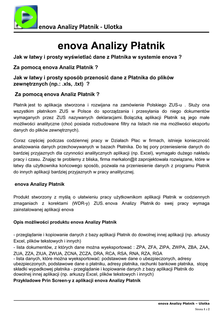 enova Analizy Płatnik - Ulotka enova Analizy Płatnik Jak w łatwy i prosty wyświetlać dane z Płatnika w systemie enova ? Za pomocą enova Analiz Płatnik ? Jak w łatwy i prosty sposób przenosić dane z Płatnika do plików zewnętrznych (np.: .xls, .txt) ? Za pomocą enova Analiz Płatnik ? Płatnik jest to aplikacja stworzona i rozwijana na zamówienie Polskiego ZUS-u . Służy ona wszystkim płatnikom ZUS w Polsce do sporządzania i przesyłania do niego dokumentów wymaganych przez ZUS nazywanych deklaracjami. Bolączką aplikacji Płatnik są jego małe możliwości analityczne (choć posiada rozbudowane filtry na listach nie ma możliwości eksportu danych do plików zewnętrznych). Coraz częściej podczas codziennej pracy w Działach Płac w firmach, istnieje konieczność analizowania danych przechowywanych w bazach Płatnika. Do tej pory przeniesienie danych do bardziej przyjaznych dla czynności analitycznych aplikacji (np. Excel), wymagało dużego nakładu pracy i czasu. Znając te problemy z bliska, firma merkalon@it zaprojektowała rozwiązane, które w łatwy dla użytkownika końcowego sposób, pozwala na przeniesienie danych z programu Płatnik do innych aplikacji bardziej przyjaznych w pracy analitycznej. enova Analizy Płatnik Produkt stworzony z myślą o ułatwieniu pracy użytkownikom aplikacji Płatnik w codziennych zmaganiach z korektami (WDR-y) ZUS. enova Analizy Płatnik do swej pracy wymaga zainstalowanej aplikacji enova Opis możliwości produktu enova Analizy Płatnik - przeglądanie i kopiowanie danych z bazy aplikacji Płatnik do dowolnej innej aplikacji (np. arkuszy Excel, plików tekstowych i innych) - lista dokumentów, z których dane można wyeksportować : ZPA, ZFA, ZIPA, ZWPA, ZBA, ZAA, ZUA, ZZA, ZIUA, ZWUA, ZCNA, ZCZA, DRA, RCA, RSA, RNA, RZA, RGA - lista danych, które można wyeksportować: podstawowe dane o ubezpieczonych, adresy ubezpieczonych, podstawowe dane o płatniku, adresy płatnika, rachunki bankowe płatnika, stopę składki wypadkowej płatnika - przeglądanie i kopiowanie danych z bazy aplikacji Płatnik do dowolnej innej aplikacji (np. arkuszy Excel, plików tekstowych i innych) Przykładowe Prin Screen-y z aplikacji enova Analizy Płatnik enova Analizy Płatnik – Ulotka Strona 1 z 2 enova Analizy Płatnik - Ulotka enova Analizy Płatnik – Ulotka Strona 2 z 2
