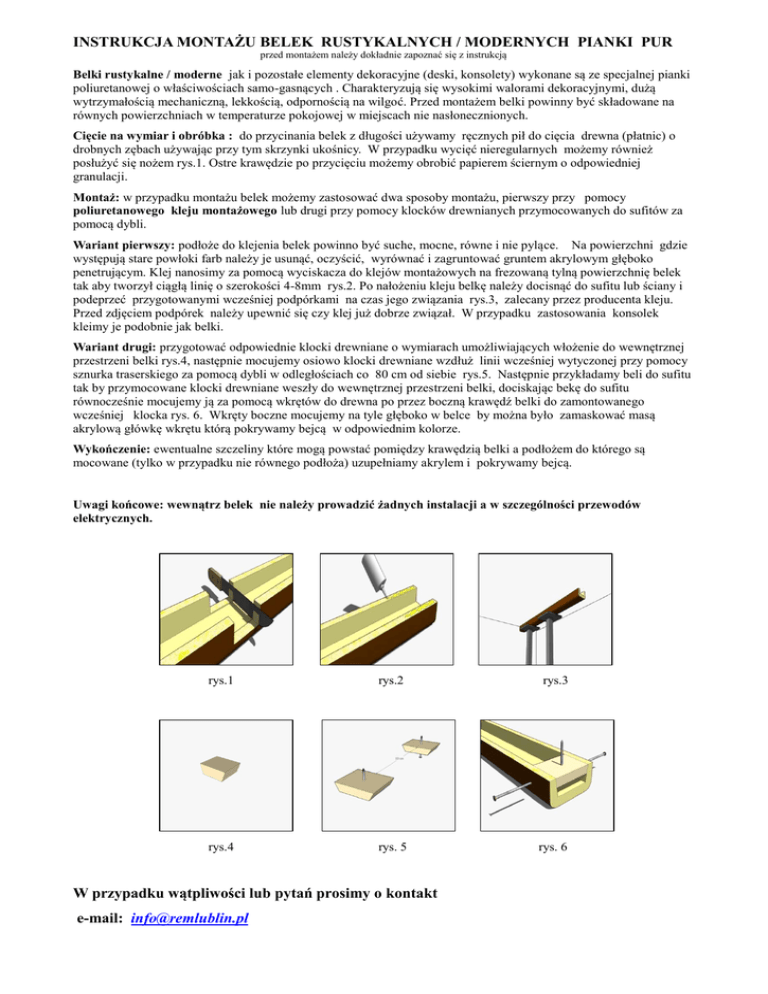 INSTRUKCJA MONTAŻU BELEK RUSTYKALNYCH / MODERNYCH PIANKI PUR przed montażem należy dokładnie zapoznać się z instrukcją Belki rustykalne / moderne jak i pozostałe elementy dekoracyjne (deski, konsolety) wykonane są ze specjalnej pianki poliuretanowej o właściwościach samo-gasnących . Charakteryzują się wysokimi walorami dekoracyjnymi, dużą wytrzymałością mechaniczną, lekkością, odpornością na wilgoć. Przed montażem belki powinny być składowane na równych powierzchniach w temperaturze pokojowej w miejscach nie nasłonecznionych. Cięcie na wymiar i obróbka : do przycinania belek z długości używamy ręcznych pił do cięcia drewna (płatnic) o drobnych zębach używając przy tym skrzynki ukośnicy. W przypadku wycięć nieregularnych możemy również posłużyć się nożem rys.1. Ostre krawędzie po przycięciu możemy obrobić papierem ściernym o odpowiedniej granulacji. Montaż: w przypadku montażu belek możemy zastosować dwa sposoby montażu, pierwszy przy pomocy poliuretanowego kleju montażowego lub drugi przy pomocy klocków drewnianych przymocowanych do sufitów za pomocą dybli. Wariant pierwszy: podłoże do klejenia belek powinno być suche, mocne, równe i nie pylące. Na powierzchni gdzie występują stare powłoki farb należy je usunąć, oczyścić, wyrównać i zagruntować gruntem akrylowym głęboko penetrującym. Klej nanosimy za pomocą wyciskacza do klejów montażowych na frezowaną tylną powierzchnię belek tak aby tworzył ciągłą linię o szerokości 4-8mm rys.2. Po nałożeniu kleju belkę należy docisnąć do sufitu lub ściany i podeprzeć przygotowanymi wcześniej podpórkami na czas jego związania rys.3, zalecany przez producenta kleju. Przed zdjęciem podpórek należy upewnić się czy klej już dobrze związał. W przypadku zastosowania konsolek kleimy je podobnie jak belki. Wariant drugi: przygotować odpowiednie klocki drewniane o wymiarach umożliwiających włożenie do wewnętrznej przestrzeni belki rys.4, następnie mocujemy osiowo klocki drewniane wzdłuż linii wcześniej wytyczonej przy pomocy sznurka traserskiego za pomocą dybli w odległościach co 80 cm od siebie rys.5. Następnie przykładamy beli do sufitu tak by przymocowane klocki drewniane weszły do wewnętrznej przestrzeni belki, dociskając bekę do sufitu równocześnie mocujemy ją za pomocą wkrętów do drewna po przez boczną krawędź belki do zamontowanego wcześniej klocka rys. 6. Wkręty boczne mocujemy na tyle głęboko w belce by można było zamaskować masą akrylową główkę wkrętu którą pokrywamy bejcą w odpowiednim kolorze. Wykończenie: ewentualne szczeliny które mogą powstać pomiędzy krawędzią belki a podłożem do którego są mocowane (tylko w przypadku nie równego podłoża) uzupełniamy akrylem i pokrywamy bejcą. Uwagi końcowe: wewnątrz belek nie należy prowadzić żadnych instalacji a w szczególności przewodów elektrycznych. rys.1 rys.2 rys.3 rys.4 rys. 5 rys. 6 W przypadku wątpliwości lub pytań prosimy o kontakt e-mail: [email protected]