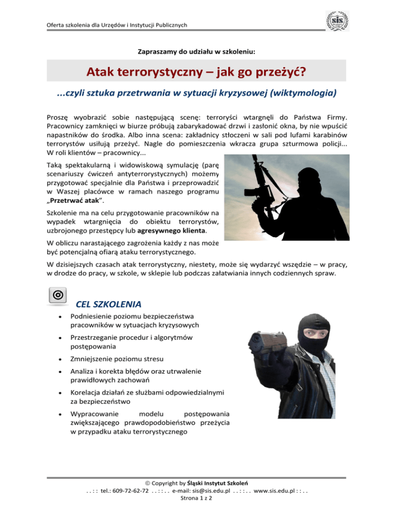 Oferta szkolenia dla Urzędów i Instytucji Publicznych Zapraszamy do udziału w szkoleniu: Atak terrorystyczny – jak go przeżyć? ...czyli sztuka przetrwania w sytuacji kryzysowej (wiktymologia) Proszę wyobrazić sobie następującą scenę: terroryści wtargnęli do Państwa Firmy. Pracownicy zamknięci w biurze próbują zabarykadować drzwi i zasłonić okna, by nie wpuścić napastników do środka. Albo inna scena: zakładnicy stłoczeni w sali pod lufami karabinów terrorystów usiłują przeżyć. Nagle do pomieszczenia wkracza grupa szturmowa policji... W roli klientów – pracownicy... Taką spektakularną i widowiskową symulację (parę scenariuszy ćwiczeń antyterrorystycznych) możemy przygotować specjalnie dla Państwa i przeprowadzić w Waszej placówce w ramach naszego programu „Przetrwać atak”. Szkolenie ma na celu przygotowanie pracowników na wypadek wtargnięcia do obiektu terrorystów, uzbrojonego przestępcy lub agresywnego klienta. W obliczu narastającego zagrożenia każdy z nas może być potencjalną ofiarą ataku terrorystycznego. W dzisiejszych czasach atak terrorystyczny, niestety, może się wydarzyć wszędzie – w pracy, w drodze do pracy, w szkole, w sklepie lub podczas załatwiania innych codziennych spraw. CEL SZKOLENIA Podniesienie poziomu bezpieczeństwa pracowników w sytuacjach kryzysowych Przestrzeganie procedur i algorytmów postępowania Zmniejszenie poziomu stresu Analiza i korekta błędów oraz utrwalenie prawidłowych zachowań Korelacja działań ze służbami odpowiedzialnymi za bezpieczeństwo Wypracowanie modelu postępowania zwiększającego prawdopodobieństwo przeżycia w przypadku ataku terrorystycznego Copyright by Śląski Instytut Szkoleń . . : : tel.: 609-72-62-72 . . : : . . e-mail: [email protected] . . : : . . www.sis.edu.pl : : . . Strona 1 z 2 Oferta szkolenia dla Urzędów i Instytucji Publicznych PROGRAM SZKOLENIA 1. Terroryzm (teoria), współczesne zagrożenia, najczęściej stosowana broń terrorystów. 2. Postępowanie w przypadku zagrożenia ze strony osoby agresywnej w obiekcie. 3. Materiał wybuchowy, podejrzany pakunek – model postępowania (powiadomienie służb, ewakacja). 4. Aktywny strzelec, czyli uzbrojona w broń palną agresywna osoba. 5. Sytuacja zakładnicza. atak terrorystów (zachowanie wobec sprawców, jak przeżyć?) szturm jednostek specjalnych (zachowanie indywidualne, zachowanie zespołu) KADRA PROWADZĄCA – INSTRUKTORZY Posiadają wieloletnie doświadczenie w szkoleniu Policjantów, Strażników Miejskich oraz Służb Ochrony Brali udział w wielu szkoleniach warsztatowych związanych z taktyką i techniką interwencji, walką wręcz, systemami samoobrony, posługiwaniu się bronią palną oraz środkami przymusu bezpośredniego Posiadają szereg uprawnień instruktorskich (państwowych, resortowych oraz wydanych przez odrębne organizacje) związanych z przedmiotową działalnością szkoleniową Ich doświadczenie wynika bezpośrednio ze szkoleń dla policjantów i przebytej służby: odziały antyterrorystyczne, wydziały kryminalne, prewencji oraz logistyki. PROPONOWANE CZAS I MIEJSCE Miejsce: Państwa Placówka (Urząd, Instytucja) Czas trwania szkolenia: około 4 godziny Prosimy o kontakt w celu uzgodnienia szczegółów: telefon: 609-72-62-72 e-mail: [email protected] Wartość szkolenia: Organizacja szkolenia wiąże się z inwestycją 2300 zł. Copyright by Śląski Instytut Szkoleń . . : : tel.: 609-72-62-72 . . : : . . e-mail: [email protected] . . : : . . www.sis.edu.pl : : . . Strona 2 z 2