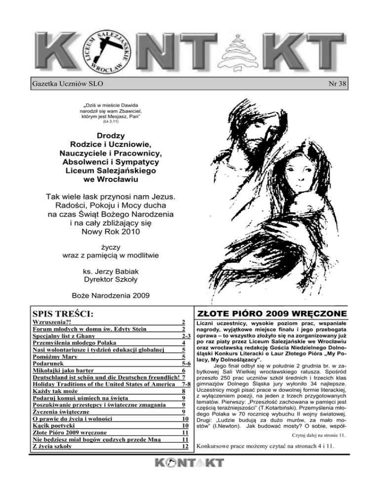 Gazetka Uczniów SLO Nr 38 „Dziś w mieście Dawida narodził się wam Zbawiciel, którym jest Mesjasz, Pan” (Łk 2,11) Drodzy Rodzice i Uczniowie, Nauczyciele i Pracownicy, Absolwenci i Sympatycy Liceum Salezjańskiego we Wrocławiu Tak wiele łask przynosi nam Jezus. Radości, Pokoju i Mocy ducha na czas Świąt Bożego Narodzenia i na cały zbliżający się Nowy Rok 2010 życzy wraz z pamięcią w modlitwie ks. Jerzy Babiak Dyrektor Szkoły Boże Narodzenia 2009 SPIS TREŚCI: Wzruszenia?! Forum młodych w domu św. Edyty Stein Specjalny list z Ghany Przemyślenia młodego Polaka Nasi wolontariusze i tydzień edukacji globalnej Pomóżmy Mary Podarunek Mikołajki jako barter Deutschland ist schön und die Deutschen freundlich! Holiday Traditions of the United States of America Każdy tak może Podaruj komuś uśmiech na święta Poszukiwanie przestępcy i świąteczne zmagania Życzenia świąteczne O prawie do życia i wolności Kącik poetycki Złote Pióro 2009 wręczone Nie będziesz miał bogów cudzych przede Mną Z życia szkoły ZŁOTE PIÓRO 2009 WRĘCZONE 2 2 2-3 4 5 5 5-6 6 7 7-8 8 9 9 9 10 10 11 11 12 Liczni uczestnicy, wysokie poziom prac, wspaniałe nagrody, wyjątkowe miejsce finału i jego przebogata oprawa – to wszystko złożyło się na zorganizowany już po raz piaty przez Liceum Salezjańskie we Wrocławiu oraz wrocławską redakcję Gościa Niedzielnego Dolnośląski Konkurs Literacki o Laur Złotego Pióra „My Polacy, My Dolnoślązacy”. Jego finał odbył się w południe 2 grudnia br. w zabytkowej Sali Wielkiej wrocławskiego ratusza. Spośród przeszło 250 prac uczniów szkół średnich i trzecich klas gimnazjów Dolnego Śląska jury wyłoniło 34 najlepsze. Uczestnicy mogli pisać prace w dowolnej formie literackiej, z wyłączeniem poezji, na jeden z trzech przygotowanych tematów. Pierwszy: „Przeszłość zachowana w pamięci jest częścią teraźniejszości” (T.Kotarbiński). Przemyślenia młodego Polaka w 70 rocznicę wybuchu II wojny światowej. Drugi: „Ludzie budują za dużo murów, za mało mostów” (I.Newton). Jak budować mosty? O sobie, współCzytaj dalej na stronie 11. Konkursowe prace możemy czytać na stronach 4 i 11. WZRUSZENIA !? „W każdą Wigilię, także wieczorem, dawało się nagle słyszeć za drzwiami kolędę W żłobie leży, któż pobieży, której ojciec z widocznym rozrzewnieniem słuchał (...). Byli to przyjaciele i znajomi, którzy zawsze z miłą występowali niespodzianką. Wieczór często kończył się (...) tańcami i polonezem, w którym ojciec występował zawsze, powtarzając, że to jedyny taniec piękny, poważny, dla każdego stosowny…” – tak pisała po latach, wspominając dzieciństwo, starsza córka Adama Mickiewicza, Marynia. Rozrzewniony Mickiewicz. Sercem przejęty Ojczyzny losem i głęboko obecny w jej tradycji. Bo nie mogło być inaczej. Zgodnie z ojców zwyczajem musiały być kolędy, biały obrus, sianko i opłatek do składania życzeń oraz Msza Pasterska w samym środku nocy. I choć wolnej Polski wtedy nie było, to była wolność. Wolność w Tym, który przyniósł ją światu i ludziom. Wolność w Jezusie. Ileż nadziei wtedy było. To ona dawała siły i ufność na lepsze dni. Jak Gwiazda Betlejemska promieniowała w najciemniejszych zakamarkach życia. Wigilijny Mickiewicz ze łzą w oku, bliski Boga i Ojczyzny. A ty jak przeżyjesz te dni ? Bliski …. ks. Jerzy Babiak dyrektor szkoły FORUM MŁODYCH W DOMU ŚW. EDYTY STEIN W dniu 9 października br. odbyły się warsztaty w Domu św. Edyty Stein z okazji 20-lecia założonego tam Towarzystwa im. Edyty Stein. Całość rozpoczęła się Mszą św. o godzinie 9.00 w kościele św. Michała Archanioła we Wrocławiu. Po mszy udaliśmy się do Domu św. Edyty Stein. Po krótkim przywitaniu przez organizatorów, a jednocześnie prowadzących poszczególne warsztaty, zostaliśmy rozdzieleni, według własnych deklaracji, do odpowiednich grup, a były wśród nich: fotograficzna, wokalno-muzyczna, plastyczna i dziennikarska. Następnie jako wstęp odbyła się zabawa integracyjna. Wreszcie każdy prowadzący oprowadził swoją grupę po Domu św. Edyty Stein i opowiedział o jej życiu. Potem rozpoczęły się właściwe warsztaty. Ja byłam w grupie fotograficznej. Zeszliśmy razem na dół, gdzie nasz instruktor, pan Rafał Solski, miał swoją pracownię. Na początku opowiadał nam o sobie, następnie zapytał, czego oczekujemy od tych warsztatów i odpowiedział na nasze pytania. Wreszcie wydał nam polecenie: mogliśmy zrobić tylko 3 zdjęcia, które opowiadałyby jakąś historię. Mieliśmy na to czas do przerwy i cały dom do dyspozycji. Przerwą okazał się bardzo miły poczęstunek: kanapki, coś słodkiego, soki, kawa i herbata. Po posiłku ze wszystkich zdjęć zrobiliśmy prezentację multi- medialną, którą przedstawiliśmy na końcu spotkania. Wtedy też rezultaty swojej pracy odkryły przed nami pozostałe grup y: wok alnomuzyczna zaśpiewała, dziennikarska puściła wywiad, który przeprowadziła z przechodniami na temat: "Czy każdy może zostać świętym?", a grupa plastyczna przedstawiła swoje kolaże. Podziękowaliśmy sobie nawzajem i mogliśmy rozejść się do domów. Na samym końcu każdy, kto chciał, mógł zostać na drugim poczęstunku. W sumie z tych warsztatów bardzo dużo wyniosłam i wiem, że warto było tam pójść. Agata Matras kl. II b SPECJALNY LIST DO NAS Z GHANY Drodzy Wolontariusze ! To już prawie 5 miesięcy temu wyjechałam z Salezjańskiego Wolontariatu Misyjnego do Ghany. Na początku trudno się było przyzwyczaić do zupełnie nowej rzeczywistości, ale teraz już czuję się jak u siebie w domu. Wiem, że obecnie większość z Was przygotowuje się do wyjazdu na Syberię. Byłam tam dwukrotnie i to właśnie tam zrodziła się chęć wyjazdu rocznego. Życzę Wam, żebyście też poczuli, że gdzieś możecie być potrzebni i możecie oddać cząstkę s