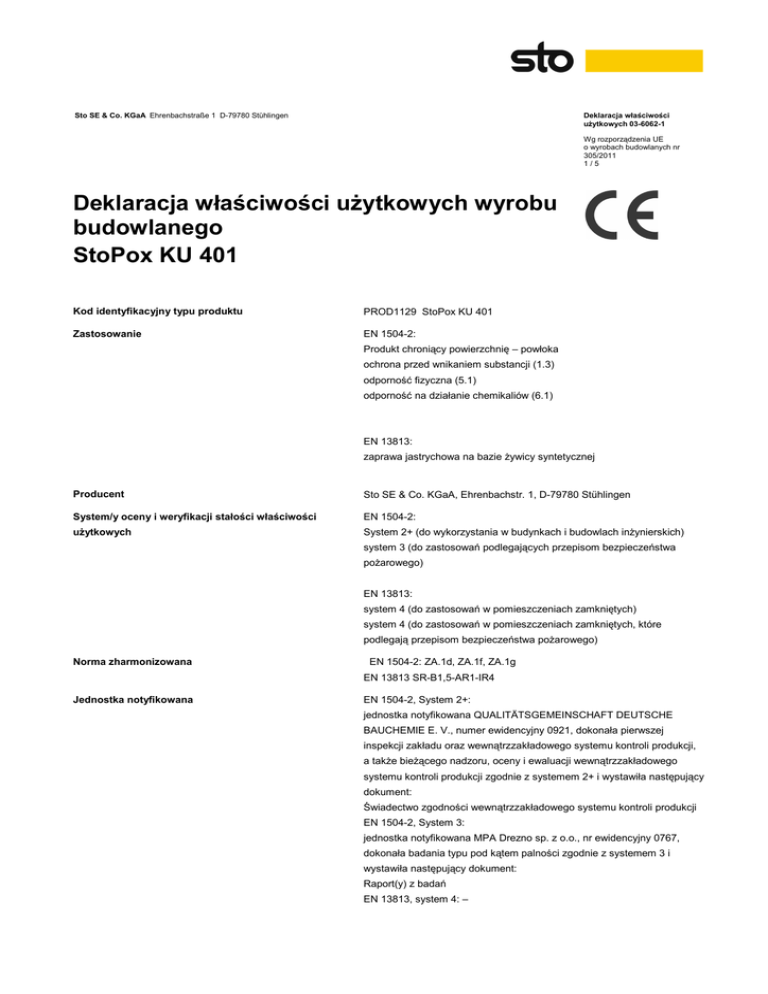 Sto SE & Co. KGaA Ehrenbachstraße 1 D-79780 Stühlingen Deklaracja właściwości użytkowych 03-6062-1 Wg rozporządzenia UE o wyrobach budowlanych nr 305/2011 1/5 Deklaracja właściwości użytkowych wyrobu budowlanego StoPox KU 401 Kod identyfikacyjny typu produktu Zastosowanie PROD1129 StoPox KU 401 EN 1504-2: Produkt chroniący powierzchnię – powłoka ochrona przed wnikaniem substancji (1.3) odporność fizyczna (5.1) odporność na działanie chemikaliów (6.1) EN 13813: zaprawa jastrychowa na bazie żywicy syntetycznej Producent Sto SE & Co. KGaA, Ehrenbachstr. 1, D-79780 Stühlingen System/y oceny i weryfikacji stałości właściwości EN 1504-2: użytkowych System 2+ (do wykorzystania w budynkach i budowlach inżynierskich) system 3 (do zastosowań podlegających przepisom bezpieczeństwa pożarowego) EN 13813: system 4 (do zastosowań w pomieszczeniach zamkniętych) system 4 (do zastosowań w pomieszczeniach zamkniętych, które podlegają przepisom bezpieczeństwa pożarowego) Norma zharmonizowana EN 1504-2: ZA.1d, ZA.1f, ZA.1g EN 13813 SR-B1,5-AR1-IR4 Jednostka notyfikowana EN 1504-2, System 2+: jednostka notyfikowana QUALITÄTSGEMEINSCHAFT DEUTSCHE BAUCHEMIE E. V., numer ewidencyjny 0921, dokonała pierwszej inspekcji zakładu oraz wewnątrzzakładowego systemu kontroli produkcji, a także bieżącego nadzoru, oceny i ewaluacji wewnątrzzakładowego systemu kontroli produkcji zgodnie z systemem 2+ i wystawiła następujący dokument: Świadectwo zgodności wewnątrzzakładowego systemu kontroli produkcji EN 1504-2, System 3: jednostka notyfikowana MPA Drezno sp. z o.o., nr ewidencyjny 0767, dokonała badania typu pod kątem palności zgodnie z systemem 3 i wystawiła następujący dokument: Raport(y) z badań EN 13813, system 4: – Sto SE & Co. KGaA Ehrenbachstraße 1 D-79780 Stühlingen Deklaracja właściwości użytkowych 03-6062-1 Wg rozporządzenia UE o wyrobach budowlanych nr 305/2011 2/5 Europejska ocena techniczna Nie dotyczy Odpowiednia dokumentacja techniczna Reakcja na ogień: Efl (StoDok_20140624_2) Deklarowane właściwości użytkowe produkt stosowany jest w połączeniu ze środkiem gruntującym: Zasadnicze charakterystyki Właściwości użytkowe Zharmonizowana specyfikacja techniczna Reakcja na ogień E(fl) EN 1504-2:2004 Reakcja na ogień E(fl) (StoDok_20140624_2) EN 13813:2002 Opór dyfuzyjny względny warstwy wierzchniej Klasa III EN 1504-2:2004 Przyczepność ≥B 1,5 EN 13813:2002 Pochłanianie dźwięku NPD EN 13813:2002 Przepuszczalność wody NPD EN 13813:2002 Odporność na ścieranie ≤AR1.. EN 13813:2002 Przyczepność przy odrywaniu ≥2,0 (1,5) N/mm² EN 1504-2:2004 Odporność na ścieranie Ubytek masy < 3000 mg EN 1504-2:2004 Właściwości antystatyczne NPD EN 1504-2:2004 Odporność chemiczna NPD EN 13813:2002 Uwalnianie substancji powodujących korozję SR EN 13813:2002 Nacinanie NPD EN 1504-2:2004 Odporność na poślizg NPD EN 1504-2:2004 Sztuczne starzenie NPD EN 1504-2:2004 Skurcz liniowy NPD EN 1504-2:2004 Izolacja akustyczna NPD EN 13813:2002 Izolacja cieplna NPD EN 13813:2002 Odporność na szok termiczny NPD EN 1504-2:2004 0,5 Absorpcja kapilarna i przepuszczalność wody w < 0,1 kg/(m²*h ) EN 1504-2:2004 Odporność na uderzenia klasa I EN 1504-2:2004 Odporność na uderzenia ≥IR4 EN 13813:2002 Współczynnik rozszerzalności cieplnej NPD EN 1504-2:2004 Odporność chemiczna NPD EN 1504-2:2004 Odporność na silną agresję chemiczną zmniejszenie twardości < 50 % EN 1504-2:2004 Substancje niebezpieczne NPD EN 1504-2:2004 Przyczepność do wilgotnego betonu NPD EN 1504-2:2004 Kompatybilność cieplna NPD EN 1504-2:2004 Wytrzymałość na ściskanie NPD EN 1504-2:2004 Przepuszczalność dwutlenku węgla Sd > 50 m EN 1504-2:2004 Zdolność do mostkowania rys NPD EN 1504-2:2004 Sto SE & Co. KGaA Ehrenbachstraße 1 D-79780 Stühlingen Deklaracja właściwości użytkowych 03-6062-1 Wg rozporządzenia UE o wyrobach budowlanych nr 305/2011 3/5 Właściwości użytkowe wyrobu odpowiadają deklarowanym właściwościom użytkowym. Niniejsza deklaracja właściwości użytkowych wydana zostaje na wyłączną odpowiedzialność producenta. W imieniu producenta podpisał: 13.11.2014 Sto SE & Co. KGaA D-79780 Stühlingen Załącznik: Karta charakterystyki Z up. dr Hans Klein/Kierownik Działu Aprobat i Badań Sto SE & Co. KGaA Ehrenbachstraße 1 D-79780 Stühlingen Deklaracja właściwości użytkowych 03-6062-1 Wg rozporządzenia UE o wyrobach budowlanych nr 305/2011 4/5 Sto SE & Co. KGaA Ehrenbachstraße 1 D-79780 Stühlingen 03-6062-1 09 PROD1129 StoPox KU 401 EN 1504-2: ZA.1d, ZA.1f, ZA.1g EN 1504-2: Produkt chroniący powierzchnię – powłoka ochrona przed wnikaniem substancji (1.3) odporność fizyczna (5.1) odporność na działanie chemikaliów (6.1) EN 13813: zaprawa jastrychowa na bazie żywicy syntetycznej Reakcja na ogień E(fl) Reakcja na ogień E(fl) (StoDok_20140624_2) Przyczepność ≥B 1,5 Opór dyfuzyjny względny warstwy wierzchniej Klasa III Pochłanianie dźwięku NPD Przepuszczalność wody NPD Odporność na ścieranie ≤AR1 Przyczepność przy odrywaniu ≥2,0 (1,5) N/mm² Odporność na ścieranie Ubytek masy < 3000 mg Właściwości antystatyczne NPD Odporność chemiczna NPD Uwalnianie substancji powodujących korozję SR Nacinanie NPD Odporność na poślizg NPD Sztuczne starzenie NPD Skurcz liniowy NPD Izolacja akustyczna NPD Izolacja cieplna NPD Odporność na szok termiczny NPD Sto SE & Co. KGaA Ehrenbachstraße 1 D-79780 Stühlingen Deklaracja właściwości użytkowych 03-6062-1 Wg rozporządzenia UE o wyrobach budowlanych nr 305/2011 5/5 Absorpcja kapilarna i przepuszczalność wody w < 0,1 kg/(m²*h0,5) Odporność na uderzenia klasa I Odporność na uderzenia ≥IR4 Współczynnik rozszerzalności cieplnej NPD Odporność chemiczna NPD Odporność na silną agresję chemiczną zmniejszenie twardości < 50 % Substancje niebezpieczne NPD Przyczepność do wilgotnego betonu NPD Kompatybilność 