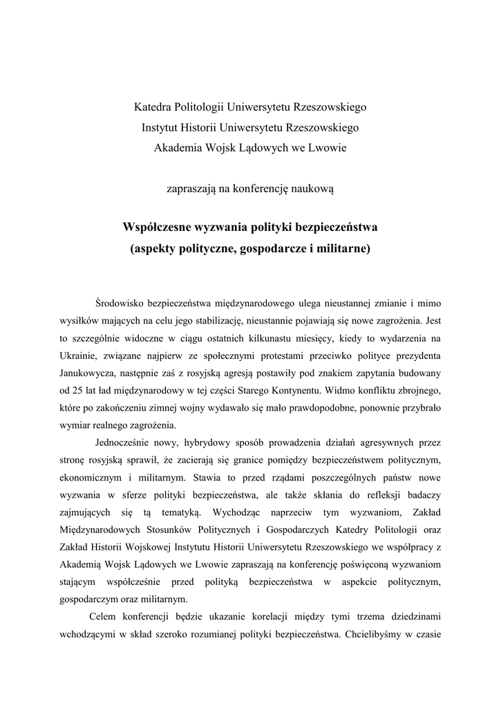 Katedra Politologii Uniwersytetu Rzeszowskiego Instytut Historii Uniwersytetu Rzeszowskiego Akademia Wojsk Lądowych we Lwowie zapraszają na konferencję naukową Współczesne wyzwania polityki bezpieczeństwa (aspekty polityczne, gospodarcze i militarne) Środowisko bezpieczeństwa międzynarodowego ulega nieustannej zmianie i mimo wysiłków mających na celu jego stabilizację, nieustannie pojawiają się nowe zagrożenia. Jest to szczególnie widoczne w ciągu ostatnich kilkunastu miesięcy, kiedy to wydarzenia na Ukrainie, związane najpierw ze społecznymi protestami przeciwko polityce prezydenta Janukowycza, następnie zaś z rosyjską agresją postawiły pod znakiem zapytania budowany od 25 lat ład międzynarodowy w tej części Starego Kontynentu. Widmo konfliktu zbrojnego, które po zakończeniu zimnej wojny wydawało się mało prawdopodobne, ponownie przybrało wymiar realnego zagrożenia. Jednocześnie nowy, hybrydowy sposób prowadzenia działań agresywnych przez stronę rosyjską sprawił, że zacierają się granice pomiędzy bezpieczeństwem politycznym, ekonomicznym i militarnym. Stawia to przed rządami poszczególnych państw nowe wyzwania w sferze polityki bezpieczeństwa, ale także skłania do refleksji badaczy zajmujących się tą tematyką. Wychodząc naprzeciw tym wyzwaniom, Zakład Międzynarodowych Stosunków Politycznych i Gospodarczych Katedry Politologii oraz Zakład Historii Wojskowej Instytutu Historii Uniwersytetu Rzeszowskiego we współpracy z Akademią Wojsk Lądowych we Lwowie zapraszają na konferencję poświęconą wyzwaniom stającym współcześnie przed polityką bezpieczeństwa w aspekcie politycznym, gospodarczym oraz militarnym. Celem konferencji będzie ukazanie korelacji między tymi trzema dziedzinami wchodzącymi w skład szeroko rozumianej polityki bezpieczeństwa. Chcielibyśmy w czasie obrad spróbować odpowiedzieć na pytania, jak zmieniło się środowisko bezpieczeństwa w Europie, ze szczególnym uwzględnieniem jej wschodniej części, jakim wyzwaniom musi stawić czoła polska polityka bezpieczeństwa, a także jakimi instrumentami może się w tych działaniach posłużyć. Mamy nadzieję, ze powyższe problemy stanowić będą główne wyznaczniki dyskusji, ale nie zamkną zbioru poruszanych tematów. Konferencja odbędzie się w Rzeszowie w dniach 23-24 czerwca 2015 roku. Zgłoszenia prosimy nadsyłać do 31 marca 2015 r. Opłata konferencyjna wynosi 400 zł i obejmuje jeden nocleg w pokoju dwuosobowym, posiłki w trakcie konferencji, materiały konferencyjne oraz publikację referatów wygłoszonych podczas konferencji w recenzowanej monografii (po uzyskaniu pozytywnej recenzji). Opłatę konferencyjną wnieść należy do 30 kwietnia 2015 r. na rachunek Uniwersytetu Rzeszowskiego (Bank PBS Oddział w Rzeszowie; nr konta: 48 8642 1126 2012 1119 9353 0001) z dopiskiem „polityka bezpieczeństwa – konferencja”. Formularz zgłoszenia dostępny jest w zakładce konferencji w witrynie Katedry Politologii Uniwersytetu Rzeszowskiego http://www.politologia.ur.edu.pl/pl oraz na stronie internetowej Instytutu Historii UR. Zgłoszenia prosimy przesyłać drogą elektroniczną na adres [email protected]. Tekst referatu przeznaczony do publikacji i przesłany do 30 września 2015 r. nie powinien przekraczać 30 tys. znaków ze spacjami. Prof. nadzw. dr hab. Paweł Grata Prof. nadzw. dr hab. Andrzej Olejko Kierownik Zakładu Międzynarodowych Kierownik Zakładu Historii Wojskowości Stosunków Politycznych i Gospodarczych Katedra Politologii Sekretarze konferencji: Dr Marek Delong tel. 662 144 438 Dr Paweł Korzeniowski tel. 691 545 816 Instytut Historii