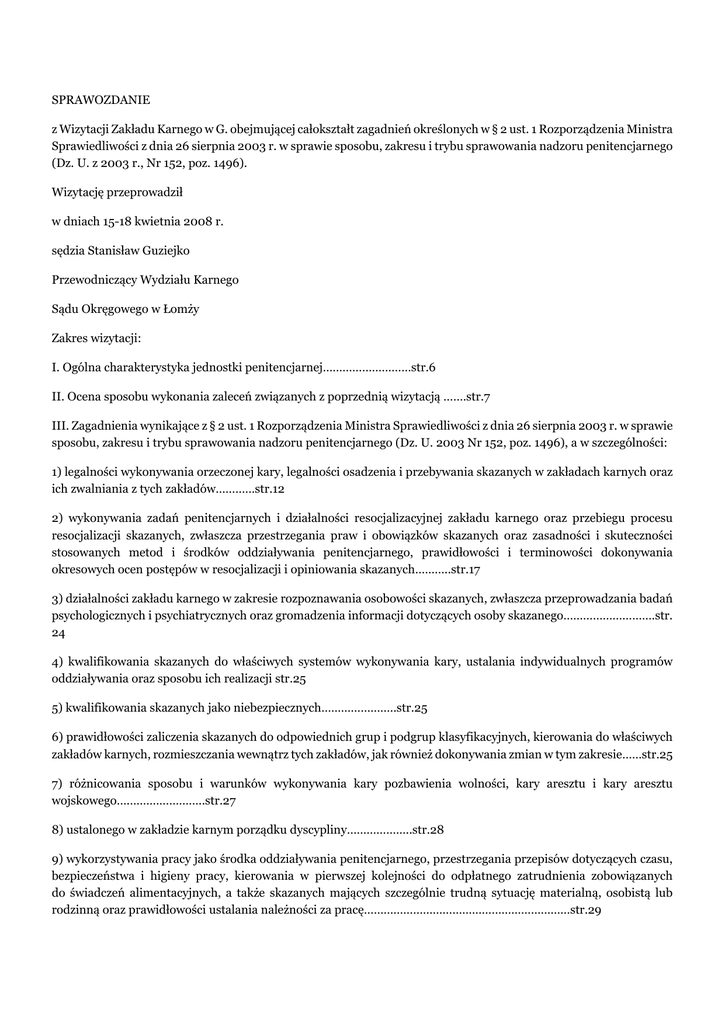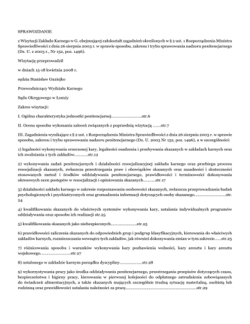 SPRAWOZDANIE z Wizytacji Zakładu Karnego w G. obejmującej całokształt zagadnień określonych w § 2 ust. 1 Rozporządzenia Ministra Sprawiedliwości z dnia 26 sierpnia 2003 r. w sprawie sposobu, zakresu i trybu sprawowania nadzoru penitencjarnego (Dz. U. z 2003 r., Nr 152, poz. 1496). Wizytację przeprowadził w dniach 15-18 kwietnia 2008 r. sędzia Stanisław Guziejko Przewodniczący Wydziału Karnego Sądu Okręgowego w Łomży Zakres wizytacji: I. Ogólna charakterystyka jednostki penitencjarnej………………………str.6 II. Ocena sposobu wykonania zaleceń związanych z poprzednią wizytacją …….str.7 III. Zagadnienia wynikające z § 2 ust. 1 Rozporządzenia Ministra Sprawiedliwości z dnia 26 sierpnia 2003 r. w sprawie sposobu, zakresu i trybu sprawowania nadzoru penitencjarnego (Dz. U. 2003 Nr 152, poz. 1496), a w szczególności: 1) legalności wykonywania orzeczonej kary, legalności osadzenia i przebywania skazanych w zakładach karnych oraz ich zwalniania z tych zakładów…………str.12 2) wykonywania zadań penitencjarnych i działalności resocjalizacyjnej zakładu karnego oraz przebiegu procesu resocjalizacji skazanych, zwłaszcza przestrzegania praw i obowiązków skazanych oraz zasadności i skuteczności stosowanych metod i środków oddziaływania penitencjarnego, prawidłowości i terminowości dokonywania okresowych ocen postępów w resocjalizacji i opiniowania skazanych………..str.17 3) działalności zakładu karnego w zakresie rozpoznawania osobowości skazanych, zwłaszcza przeprowadzania badań psychologicznych i psychiatrycznych oraz gromadzenia informacji dotyczących osoby skazanego……………………….str. 24 4) kwalifikowania skazanych do właściwych systemów wykonywania kary, ustalania indywidualnych programów oddziaływania oraz sposobu ich realizacji str.25 5) kwalifikowania skazanych jako niebezpiecznych…………………..str.25 6) prawidłowości zaliczenia skazanych do odpowiednich grup i podgrup klasyfikacyjnych, kierowania do właściwych zakładów karnych, rozmieszczania wewnątrz tych zakładów, jak również dokonywania zmian w tym zakresie……str.25 7) różnicowania sposobu i warunków wykonywania kary pozbawienia wolności, kary aresztu i kary aresztu wojskowego….…………………..str.27 8) ustalonego w zakładzie karnym porządku dyscypliny………………..str.28 9) wykorzystywania pracy jako środka oddziaływania penitencjarnego, przestrzegania przepisów dotyczących czasu, bezpieczeństwa i higieny pracy, kierowania w pierwszej kolejności do odpłatnego zatrudnienia zobowiązanych do świadczeń alimentacyjnych, a także skazanych mających szczególnie trudną sytuację materialną, osobistą lub rodzinną oraz prawidłowości ustalania należności za pracę………………………………………………………str.29 10) kierowania skazanych do nauczania ogólnego i zawodowego, jak również przestrzegania ustalonych zasad szkolenia i samokształcenia str. 36 11) organizowania czasu wolnego skazanych, zwłaszcza zajęć kulturalno-oświatowych, zajęć wychowania fizycznego i sportowych, oraz pobudzania aktywności społecznej skazanych str.38 12) prawidłowości przyznawania nagród, ulg i zezwoleń na czasowe opuszczenie zakładu karnego oraz wymierzania kar dyscyplinarnych i wykorzystywania ich jako środka oddziaływania penitencjarnego str. 41 13) współdziałania ze społeczeństwem, zwłaszcza z zakładami pracy zatrudniającymi skazanych, placówkami oświatowo-wychowawczymi i rodzinami skazanych oraz pozyskiwania ich do udziału w procesie wychowawczym str. 42 14) przestrzegania praw skazanych w zakresie korzystania z praktyk i posług religijnych, uczestniczenia w prowadzonym nauczaniu religii i udziału w działalności charytatywnej i społecznej kościoła lub innego związku wyznaniowego str. 48 15) warunków bytowych skazanych, stanu opieki medycznej i stanu sanitarnego str.49 16) prawidłowości i terminowości załatwiania próśb, skarg i wniosków skazanych str.55 17) kolejności wykonywania orzeczeń, jak również prawidłowości zawiadamiania o przystąpieniu do wykonania orzeczenia lub o braku możliwości przystąpienia do jego wykonywania oraz przesyłania obliczenia kary str.58 18) prawidłowości i terminowości realizacji świadczeń alimentacyjnych oraz innych należności stwierdzonych tytułem wykonawczym str.58 19) przestrzegania przepisów o bezpieczeństwie w zakładzie karnym, w tym przepisów dotyczących użycia broni, siły fizycznej i środków przymusu bezpośredniego str.59 20) prawidłowości postępowania administracji zakładu karnego w razie ujawnienia popełnienia przestępstwa, a także w wypadkach buntów, samouszkodzeń i zgonów str.59 21) zakresu, terminowości i trafności podejmowanych czynności mających na celu przygotowanie skazanego do życia po zwolnieniu z zakładu karnego str. 69 22) udzielania pomocy postpenitencjarnej, zwłaszcza w zakresie uzyskania przez skazanego dokumentów tożsamości, znalezienia pracy i zakwaterowania po zwolnieniu z zakładu karnego, a także pomocy w ustaleniu niezdolności do pracy i prawa do renty z tytułu tej niezdolności str. 69 IV. Zalecenia powizytacyjne str.71 z uwagi na specyfikę Zakładu Karnego w G. niektóre z punków wyszczególnionych wyżej omówiono łącznie. I. Ogólna charakterystyka jednostki penitencjarnej. Zakład Karny w G. został formalnie powołany do życia Zarządzeniem Ministra Sprawiedliwości o wykazie jednostek penitencjarnych i ich przeznaczeniu z dnia 2 stycznia 1996 r., z tym że wówczas faktycznie pozostawał on jednostką penitencjarną w budowie. Jeszcze do końca 1998 r. administracyjnie obsługiwany był przez Zakład Karny w B., dopiero od 1 stycznia 1999 r. został usamodzielniony. Pierwszy transport skazanych zgodnie z decyzją Dyrektora Okręgowego przesłano tu w dniu 11 czerwca 1999 r. Aktualnie Zakład Karny w G. jest zakładem typu póło