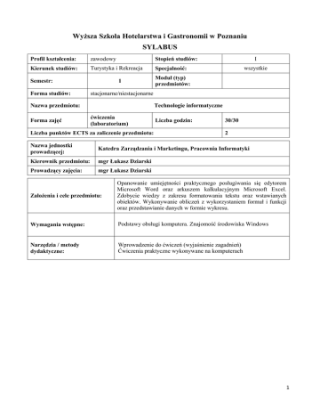 Wyższa Szkoła Hotelarstwa i Gastronomii w Poznaniu SYLABUS Profil kształcenia: zawodowy Stopień studiów: Kierunek studiów: Turystyka i Rekreacja Specjalność: Semestr: Forma studiów: 1 wszystkie Moduł (typ) przedmiotów: stacjonarne/niestacjonarne Nazwa przedmiotu: Forma zajęć I Technologie informatyczne ćwiczenia (laboratorium) Liczba punktów ECTS za zaliczenie przedmiotu: Liczba godzin: 30/30 2 Nazwa jednostki prowadzącej: Katedra Zarządzania i Marketingu, Pracownia Informatyki Kierownik przedmiotu: mgr Łukasz Dziarski Prowadzący zajęcia: mgr Łukasz Dziarski Założenia i cele przedmiotu: Opanowanie umiejętności praktycznego posługiwania się edytorem Microsoft Word oraz arkuszem kalkulacyjnym Microsoft Excel. Zdobycie wiedzy z zakresu formatowania tekstu oraz wstawianych obiektów. Wykonywanie obliczeń z wykorzystaniem formuł i funkcji oraz przedstawianie danych w formie wykresu. Wymagania wstępne: Podstawy obsługi komputera. Znajomość środowiska Windows Narzędzia / metody dydaktyczne: Wprowadzenie do ćwiczeń (wyjaśnienie zagadnień) Ćwiczenia praktyczne wykonywane na komputerach 1 WYKAZ TEMATÓW I ZAGADNIEŃ – HARMONOGRAM ZAJĘĆ Liczba godzin Lp. Tematy i zagadnienia Razem 1 1 2 Microsoft Word: 3 14 2 Przygotowanie strony do wydruku, formatowanie akapitów, formatowanie tekstu, nagłówek i stopka, tabulatory, punktowanie i numerowanie, formatowanie tekstu w kolumnach, wstawianie obiektów: WordArt, clipart i plików graficznych, wstawianie tabel i ich formatowanie, wstawianie przypisów, wykresów, edytowanie równań matematycznych, korespondencja seryjna, wstawianie spisu treści; Microsoft Excel: 16 Formy zajęć Wykład Inne 4 5 14 16 Przygotowanie arkusza do wydruku (ustawienia strony), formatowanie komórek arkusza, automatyczne wypełnianie komórek arkusza, zmiana nazwy i kopiowanie arkusza danych, porządkowanie zestawień tabelarycznych, ilustrowanie danych w formie wykresów, operacje obliczeniowe (z wykorzystaniem formuł i funkcji), formatowanie warunkowe zawartości komórek, prognozowanie na podstawie zestawionych danych. Razem Symbol efektów kształcenia 30 Opis zamierzonych efektów kształcenia Po zaliczeniu zajęć student: - 30 Odniesienie do efektów kształcenia dla kierunku W zakresie wiedzy W01 Zapoznanie się z możliwością rozwiązywania typowych problemów wynikających z praktycznego stosowania programów: Microsoft Word i Microsoft Excel K1_W14 W02 Definiowanie podstawowych pojęć z zakresu Microsoft Word i Microsoft Excel K1_W14 W03 Znajomość podstawowych narzędzi i funkcji programów Microsoft Word i Microsoft Excel. K1_W14 W zakresie umiejętności U01 Formatowanie tekstu, akapitów oraz wstawianych obiektów K1_U06, K1_U11 U02 Wstawianie do tekstu różnorodnych obiektów K1_U06, K1_U11 U03 Prezentowanie tekstu w tabelach i kolumnach K1_U06, K1_U11 U04 Prezentowanie danych w tabeli i na wykresie K1_U06, K1_U11 U05 Wykorzystanie formuł oraz funkcji w obliczeniach K1_U06, K1_U11 U06 Formatowanie komórek arkusza i wykresów K1_U06, K1_U11 W zakresie kompetencji personalnych i społecznych K01 Umiejętność samodzielnego wykonywania zleconej pracy K1_K04 K02 Umiejętność współpracy w grupie K1_K04 2 Forma zajęć: Zamierzone efekty kształcenia ćwiczenia praktyczne na komputerach, kolokwium laboratorium / ćwiczenia Elementy składowe oceny końcowej Efekt kształcenia Metody / formy oceny Sposób sprawdzenia osiągnięć efektów kształcenia Procenty kolokwium z opanowania programu Microsoft Word 50 % kolokwium z opanowania programu Microsoft Excel 50 % Forma oceny Egzamin ustny Egzamin pisemny Kolokwium W01 X W02 X W03 X U01 X U02 X U03 X U04 X U05 X U06 X Całkowity nakład pracy studenta potrzebny do osiągnięcia efektów w godzinach Projekt Aktywność ………. ……… Obciążenie studenta Udział w ćwiczeniach 30 h Przygotowanie do zaliczenia (kolokwium) 10 h Zalecana literatura przedmiotu Wesołowski P., Tauber R. D. „Podstawy praktycznej edycji tekstu”, WSHiG Poznań 2007 Podstawowa: Wesołowski P., Tauber R. D. „Podstawy kalkulacji komputerowych”, WSHiG Poznań 2008 Uzupełniająca: Tematycznie zbliżone pozycje Oświadczenie i podpis prowadzącego zajęcia Oświadczam, że treści programowe zawarte w niniejszym sylabusie są rezultatem mojej indywidualnej pracy twórczej wykonywanej w ramach stosunku pracy/współpracy wynikającej z umowy cywilnoprawnej oraz że osobom trzecim nie przysługują z tego tytułu autorskie prawa majątkowe. Dnia: ……………….. …………………………………….. 3