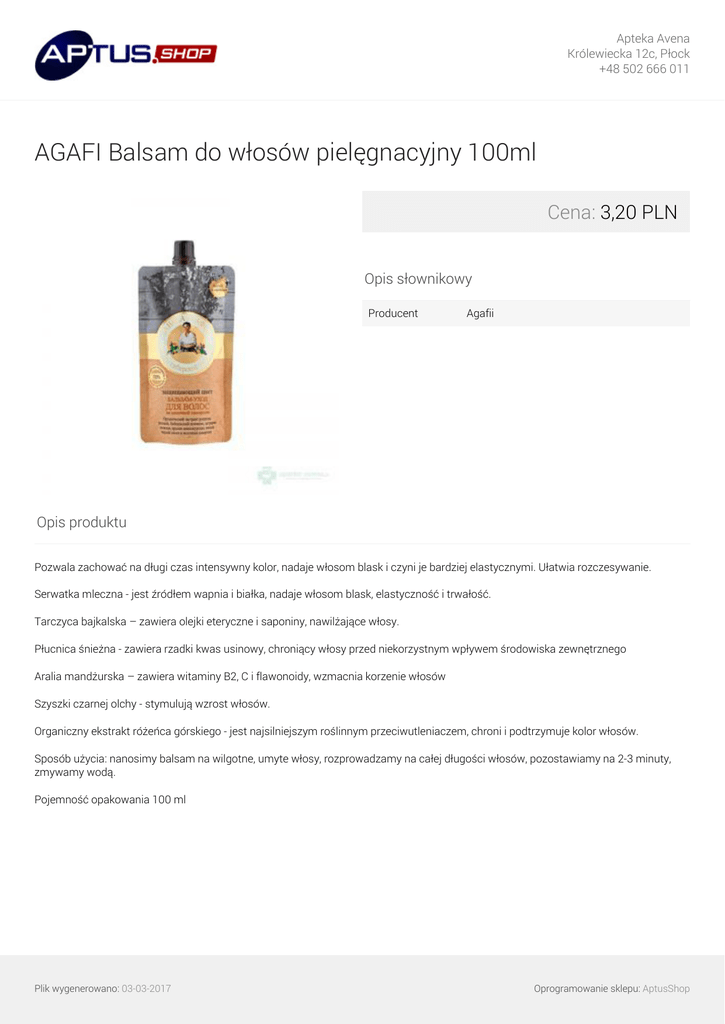 Apteka Avena Królewiecka 12c, Płock +48 502 666 011 AGAFI Balsam do włosów pielęgnacyjny 100ml Cena: 3,20 PLN Opis słownikowy Producent Agafii Opis produktu Pozwala zachować na długi czas intensywny kolor, nadaje włosom blask i czyni je bardziej elastycznymi. Ułatwia rozczesywanie. Serwatka mleczna - jest źródłem wapnia i białka, nadaje włosom blask, elastyczność i trwałość. Tarczyca bajkalska – zawiera olejki eteryczne i saponiny, nawilżające włosy. Płucnica śnieżna - zawiera rzadki kwas usinowy, chroniący włosy przed niekorzystnym wpływem środowiska zewnętrznego Aralia mandżurska – zawiera witaminy B2, C i flawonoidy, wzmacnia korzenie włosów Szyszki czarnej olchy - stymulują wzrost włosów. Organiczny ekstrakt różeńca górskiego - jest najsilniejszym roślinnym przeciwutleniaczem, chroni i podtrzymuje kolor włosów. Sposób użycia: nanosimy balsam na wilgotne, umyte włosy, rozprowadzamy na całej długości włosów, pozostawiamy na 2-3 minuty, zmywamy wodą. Pojemność opakowania 100 ml Plik wygenerowano: 03-03-2017 Powered by TCPDF (www.tcpdf.org) Oprogramowanie sklepu: AptusShop