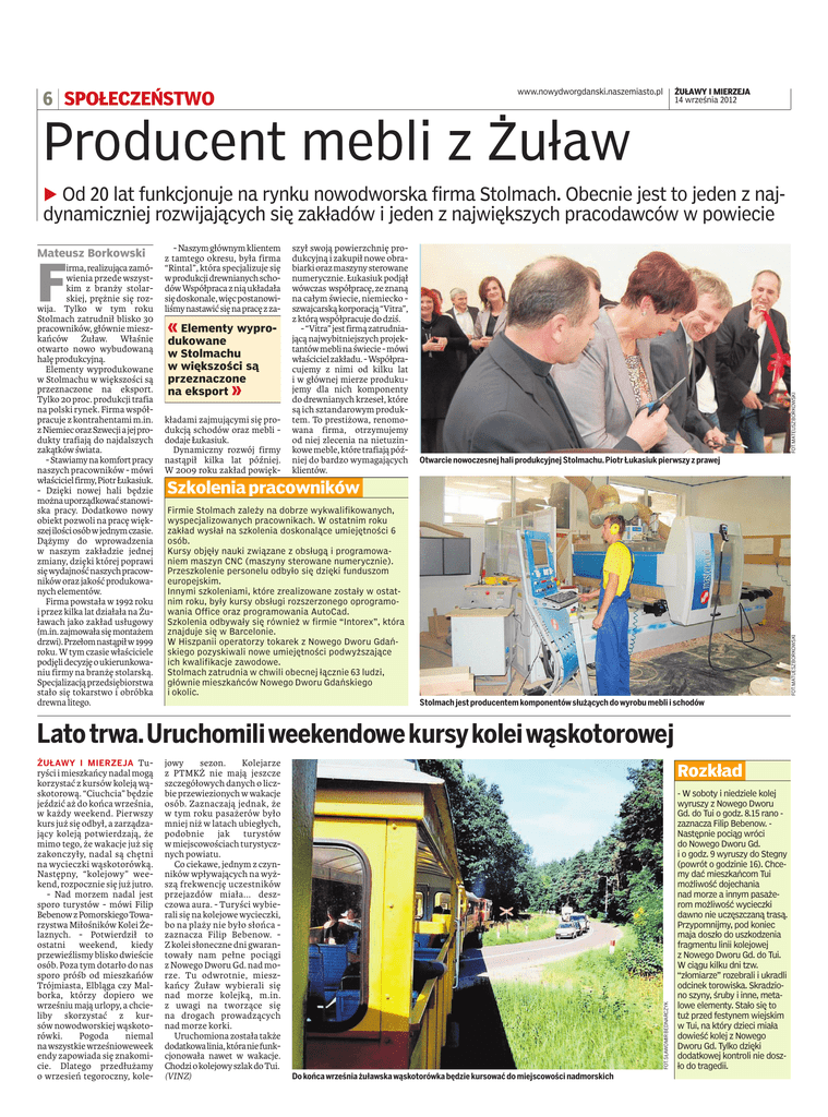 ŻUŁAWY I MIERZEJA 14 września 2012 www.nowydworgdanski.naszemiasto.pl 6 SPOŁECZEŃSTWO Producent mebli z Żuław F irma, realizująca zamówienia przede wszystkim z branży stolarskiej, prężnie się rozwija. Tylko w tym roku Stolmach zatrudnił blisko 30 pracowników, głównie mieszkańców Żuław. Właśnie otwarto nowo wybudowaną halę produkcyjną. Elementy wyprodukowane w Stolmachu w większości są przeznaczone na eksport. Tylko 20 proc. produkcji trafia na polski rynek. Firma współpracuje z kontrahentami m.in. z Niemiec oraz Szwecji a jej produkty trafiają do najdalszych zakątków świata. - Stawiamy na komfort pracy naszych pracowników - mówi właściciel firmy, Piotr Łukasiuk. - Dzięki nowej hali będzie można uporządkować stanowiska pracy. Dodatkowo nowy obiekt pozwoli na pracę większejilościosóbwjednymczasie. Dążymy do wprowadzenia w naszym zakładzie jednej zmiany, dzięki której poprawi się wydajność naszych pracowników oraz jakość produkowanych elementów. Firma powstała w 1992 roku i przez kilka lat działała na Żuławach jako zakład usługowy (m.in. zajmowała się montażem drzwi). Przełom nastąpił w1999 roku. W tym czasie właściciele podjęli decyzję o ukierunkowaniu firmy na branżę stolarską. Specjalizacją przedsiębiorstwa stało się tokarstwo i obróbka drewna litego. - Naszym głównym klientem z tamtego okresu, była firma “Rintal”, która specjalizuje się w produkcji drewnianych schodów Współpraca z nią układała się doskonale, więc postanowiliśmy nastawić się na pracę z za- « Elementy wyprodukowane w Stolmachu w większości są przeznaczone na eksport » kładami zajmującymi się produkcją schodów oraz mebli dodaje Łukasiuk. Dynamiczny rozwój firmy nastąpił kilka lat później. W 2009 roku zakład powięk- szył swoją powierzchnię produkcyjną i zakupił nowe obrabiarki oraz maszyny sterowane numerycznie. Łukasiuk podjął wówczas współpracę, ze znaną na całym świecie, niemiecko szwajcarską korporacją “Vitra”, z którą współpracuje do dziś. - “Vitra” jest firmą zatrudniającą najwybitniejszych projektantów mebli na świecie - mówi właściciel zakładu. - Współpracujemy z nimi od kilku lat i w głównej mierze produkujemy dla nich komponenty do drewnianych krzeseł, które są ich sztandarowym produktem. To prestiżowa, renomowana firma, otrzymujemy od niej zlecenia na nietuzinkowe meble, które trafiają później do bardzo wymagających klientów. Otwarcie nowoczesnej hali produkcyjnej Stolmachu. Piotr Łukasiuk pierwszy z prawej Szkolenia pracowników Firmie Stolmach zależy na dobrze wykwalifikowanych, wyspecjalizowanych pracownikach. W ostatnim roku zakład wysłał na szkolenia doskonalące umiejętności 6 osób. Kursy objęły nauki związane z obsługą i programowaniem maszyn CNC (maszyny sterowane numerycznie). Przeszkolenie personelu odbyło się dzięki funduszom europejskim. Innymi szkoleniami, które zrealizowane zostały w ostatnim roku, były kursy obsługi rozszerzonego oprogramowania Office oraz programowania AutoCad. Szkolenia odbywały się również w firmie “Intorex”, która znajduje się w Barcelonie. W Hiszpanii operatorzy tokarek z Nowego Dworu Gdańskiego pozyskiwali nowe umiejętności podwyższające ich kwalifikacje zawodowe. Stolmach zatrudnia w chwili obecnej łącznie 63 ludzi, głównie mieszkańców Nowego Dworu Gdańskiego i okolic. FOT.MATUESZBORKOWSKI Mateusz Borkowski FOT.MATEUSZBORKOWSKI b Od 20 lat funkcjonuje na rynku nowodworska firma Stolmach. Obecnie jest to jeden z najdynamiczniej rozwijających się zakładów i jeden z największych pracodawców w powiecie Stolmach jest producentem komponentów służących do wyrobu mebli i schodów Lato trwa.Uruchomili weekendowe kursy kolei wąskotorowej ryści i mieszkańcy nadal mogą korzystać z kursów koleją wąskotorową. “Ciuchcia” będzie jeździć aż do końca września, w każdy weekend. Pierwszy kurs już się odbył, a zarządzający koleją potwierdzają, że mimo tego, że wakacje już się zakonczyły, nadal są chętni na wycieczki wąskotorówką. Następny, “kolejowy” weekend, rozpocznie się już jutro. - Nad morzem nadal jest sporo turystów - mówi Filip Bebenow z Pomorskiego Towarzystwa Miłośników Kolei Żelaznych. - Potwierdził to ostatni weekend, kiedy przewieźlismy blisko dwieście osób. Poza tym dotarło do nas sporo próśb od mieszkańów Trójmiasta, Elbląga czy Malborka, którzy dopiero we wrześniu mają urlopy, a chcieliby skorzystać z kursów nowodworskiej wąskotorówki. Pogoda niemal na wszystkie wrześnioweweek endy zapowiada się znakomicie. Dlatego przedłużamy o wrzesień tegoroczny, kole- jowy sezon. Kolejarze z PTMKŻ nie mają jeszcze szczegółowych danych o liczbie przewiezionych w wakacje osób. Zaznaczają jednak, że w tym roku pasażerów było mniej niż w latach ubiegłych, podobnie jak turystów w miejscowościach turystycznych powiatu. Co ciekawe, jednym z czynników wpływających na wyższą frekwencję uczestników przejazdów miała... deszczowa aura. - Turyści wybierali się na kolejowe wycieczki, bo na plaży nie było słońca zaznacza Filip Bebenow. Z kolei słoneczne dni gwarantowały nam pełne pociągi z Nowego Dworu Gd. nad morze. Tu odwrotnie, mieszkańcy Żuław wybierali się nad morze kolejką, m.in. z uwagi na tworzące się na drogach prowadzących nad morze korki. Uruchomiona została także dodatkowalinia,któraniefunkcjonowała nawet w wakacje. Chodzi o kolejowy szlak do Tui. (VINZ) Rozkład FOT.SŁAWOMIRBEDNARCZYK ŻUŁAWY I MIERZEJA Tu- Do końca września żuławska wąskotorówka będzie kursować do miejscowości nadmorskich - W soboty i niedziele kolej wyruszy z Nowego Dworu Gd. do Tui o godz. 8.15 rano zaznacza Filip Bebenow. Następnie pociąg wróci do Nowego Dworu Gd. i o godz. 9 wyruszy do Stegny (powrót o godzinie 16). Chcemy dać mieszkańcom Tui możliwość dojechani