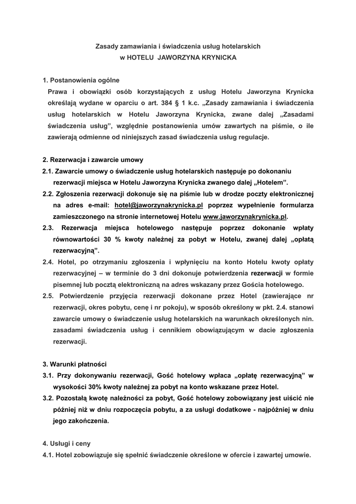 Zasady zamawiania i świadczenia usług hotelarskich w HOTELU JAWORZYNA KRYNICKA 1. Postanowienia ogólne Prawa i obowiązki osób korzystających z usług Hotelu Jaworzyna Krynicka określają wydane w oparciu o art. 384 § 1 k.c. „Zasady zamawiania i świadczenia usług hotelarskich w Hotelu Jaworzyna Krynicka, zwane dalej „Zasadami świadczenia usług”, względnie postanowienia umów zawartych na piśmie, o ile zawierają odmienne od niniejszych zasad świadczenia usług regulacje. 2. Rezerwacja i zawarcie umowy 2.1. Zawarcie umowy o świadczenie usług hotelarskich następuje po dokonaniu rezerwacji miejsca w Hotelu Jaworzyna Krynicka zwanego dalej „Hotelem”. 2.2. Zgłoszenia rezerwacji dokonuje się na piśmie lub w drodze poczty elektronicznej na adres e-mail: [email protected] poprzez wypełnienie formularza zamieszczonego na stronie internetowej Hotelu www.jaworzynakrynicka.pl. 2.3. Rezerwacja miejsca hotelowego następuje poprzez dokonanie wpłaty równowartości 30 % kwoty naleŜnej za pobyt w Hotelu, zwanej dalej „opłatą rezerwacyjną”. 2.4. Hotel, po otrzymaniu zgłoszenia i wpłynięciu na konto Hotelu kwoty opłaty rezerwacyjnej – w terminie do 3 dni dokonuje potwierdzenia rezerwacji w formie pisemnej lub pocztą elektroniczną na adres wskazany przez Gościa hotelowego. 2.5. Potwierdzenie przyjęcia rezerwacji dokonane przez Hotel (zawierające nr rezerwacji, okres pobytu, cenę i nr pokoju), w sposób określony w pkt. 2.4. stanowi zawarcie umowy o świadczenie usług hotelarskich na warunkach określonych nin. zasadami świadczenia usług i cennikiem obowiązującym w dacie zgłoszenia rezerwacji. 3. Warunki płatności 3.1. Przy dokonywaniu rezerwacji, Gość hotelowy wpłaca „opłatę rezerwacyjną” w wysokości 30% kwoty naleŜnej za pobyt na konto wskazane przez Hotel. 3.2. Pozostałą kwotę naleŜności za pobyt, Gość hotelowy zobowiązany jest uiścić nie później niŜ w dniu rozpoczęcia pobytu, a za usługi dodatkowe - najpóźniej w dniu jego zakończenia. 4. Usługi i ceny 4.1. Hotel zobowiązuje się spełnić świadczenie określone w ofercie i zawartej umowie. 4.2. Oferta zawierająca szczegółowe warunki świadczonych usług umieszczona jest na stronie internetowej Hotelu www.jaworzynakrynicka.pl i przedkładana jest w formie pisemnej wraz z kalkulacją kosztów pobytu. 4.3. Ceny usług świadczonych przez Hotel zawarte są w cenniku obowiązującym w Hotelu w dniu dokonania rezerwacji pobytu a takŜe zawarte są w ofercie, o której mowa w pkt 4.2. Dopuszcza się stosowanie innych cen ustalonych na piśmie, w drodze negocjacji stron. 4.4. Cena pokoju zawiera: podatek VAT, opłatę klimatyczną, śniadanie, miejsce do parkowania dla jednego pojazdu mechanicznego (samochodu bez przyczepy lub motocykla), korzystanie z Internetu, siłowni i przechowalni sprzętu narciarskiego. 4.5. Doba hotelowa rozpoczyna się od godz. 1600. i kończy się o godz. 1200 . Jeśli Gość hotelowy nie określił w zamówieniu czasu pobytu w hotelu, przyjmuje się, Ŝe pokój został wynajęty na jedną dobę. MoŜliwość przedłuŜenia pobytu poza okres wskazany w dniu przybycia, Gość hotelowy powinien zgłosić w recepcji do godziny 1000 dnia, w którym upływa termin najmu pokoju. 4.6. Zabrania się uŜyczania pokoju osobom nie zameldowanym w hotelu. Pokój jest wynajmowany konkretnym osobom na rzecz których została zawarta umowa, a osoby nie zameldowane w hotelu mogą przebywać w pokoju Gościa hotelowego w godzinach od 1000. do 2000 po zgłoszeniu osoby odwiedzającej w recepcji. 4.7. Do Hotelu nie moŜna przyjeŜdŜać ze zwierzętami. 4.8. We wszystkich pomieszczeniach hotelu obowiązuje zakaz palenia tytoniu. 5. Zmiany warunków wykonywania usług. 5.1. Hotel zastrzega sobie prawo do odstąpienia od świadczenia usług z przyczyn od niego niezaleŜnych (decyzja władz państwowych, strajki, powódź, itp.). Gość hotelowy otrzymuje z tego tytułu zwrot pełnej wpłaty, natomiast nie przysługuje mu odszkodowanie. 5.2. W przypadku niemoŜności spełnienia pełnego zakresu usług wynikających z zawartej umowy, Hotel zobowiązany jest do obniŜenia ceny. 5.3. W przypadku awarii urządzeń, Hotel moŜe zakwaterować Gości w innym hotelu o tym samym lub wyŜszym standardzie, bez moŜliwości domagania się od Gościa hotelowego podwyŜszenia opłaty za pobyt. 6. Rezygnacja z usług. 6.1. Gość hotelowy moŜe w kaŜdym czasie odwołać rezerwację pobytu w Hotelu, składając oświadczenie pisemne. Za datę rezygnacji decydującej o naliczeniu kosztów przyjmuje się dzień otrzymania przez Hotel pisemnej rezygnacji. 6.2. W przypadku rezygnacji Gościa hotelowego, Hotel będzie uprawniony do naliczenia poniesionych kosztów i utraconych dochodów. Przy obliczeniu naleŜnych do zapłaty kwot Hotel uwzględnia koszty zaoszczędzone, a takŜe moŜliwość wykorzystania świadczeń przez inne osoby. Kwota naleŜna do zapłaty z tytułu rezygnacji z usług zawiera w szczególności koszty zamówienia i anulowania świadczeń, które Hotel ponosi oraz dochody jakie mógłby uzyskać w przypadku gdyby nie została złoŜona rezygnacja. Utracone dochody i koszty rezygnacji z umowy o świadczenie usług w Hotelu wynoszą standardowo: - 50 PLN - gdy rezygnacja nastąpi do 72 godzin przed pierwszym dniem, w którym rozpoczyna się rezerwacja miejsca noclegowego; - 90% kosztu pierwszego dnia pobytu w Hotelu gdy rezygnacja nastąpi na 72 i mniej godzin przed pierwszym dniem, w którym rozpoczyna się rezerwacja miejsca noclegowego, - 95% całkowitego kosztu rezerwacji, gdy Gość hotelowy nie przyjedzie lub nie wykorzysta w ustalonym terminie zarezerwowanego pobytu. Gość hotelowy moŜe zwrócić się do Hotelu o przedstawienie indywidualnych wyliczeń poniesionych przez Hotel kosztów i utraconych dochodów. 6.3. Koszty odwołania rezerwacji lub rezygnacji z pobytu w hotelu określone w pkt 6.2 mogą być obniŜone lub zniesione na wniosek Gościa hot