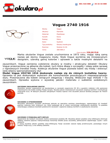 801 544 888 34 32 44 888 Vogue 2740 1916 Marka: Vogue Okulary: Damskie Materiał: Plastikowe Kształt: Kocie Rodzaj: Pełne Kolor: Szylkret Typ produktu: Okulary korekcyjne Rozmiar: Średnie 51-55 Cena: 300-499 zł Cena brutto: 358,88 PLN Marka okularów Vogue została uruchomiona w 1973 roku, mając taką samą nazwę jak słynny magazynu mody. Style Vogue wyróżnia się innowacyjnym designem, szeroką gamą kolorów i oprawek a także modnymi detalami na zausznikach. Vogue zamienia codzienne okulary w modny i atrakcyjny dotatek! Okulary Vogue przeznaczone są głównie dla kobiet, tych które dbają o szczegóły i zdają sobie sprawę z najnowszych trendów mody. Kolekcja okularów Vogue pozwala bawić się modą i stworzyć swój własny spersonalizowany styl Model Vogue VO2740 1916 doskonale nadaje się do różnych kształtów twarzy. Oprawka ta jest doskonałym wyborem dla konsumentów poszukujących niepowtarzalnego stylu. Przeznaczona dla kobiet ceniących elegancję i klasykę. Widoczne logo VOGUE ? na zausznikach. Oprawka wykona z wysokiej jakości materiału z subtelnie ozdobionym zausznikiem. SOCZEWKI OKULAROWE GRATIS! Wszystkie okulary wyposażone są standardowo w soczewki organiczne CR 39 o wysokim indeksie 1,56 wykonane indywidualnie dla Ciebie według Twojej recepty. Wysoka jakość montowanych soczewek zwiększa komfort i minimalizuje zmęczenie oczu. W dalszym procesie zakupowym możesz wybrać inne soczewki jeszcze bardziej pasujące do Twoich potrzeb. SOCZEWKI Z UTWARDZENIEM Wszystkie oferowane soczewki okularowe pokryte są specjalną warstwą utwardzającą, zapewniającą ich trwałość poprzez redukcję ilości drobnych rys, które pojawiają się w czasie normalnego użytkowania okularów. Ta powłoka utwardzająca zwiększa twardość powierzchni soczewki i zapewnia większy komfort w użytkowaniu okularów. SOCZEWKI Z POWŁOKĄ ANTY-REFLEX Opcjonalnie do każdych soczewek można zastosować powłokę AR. Wysokiej jakości powłoka anty-refleksyjna eliminuje refleksy świetlne poprzez maksymalizację transmisji światła przez soczewkę, jednocześnie zapewniając czyste i ostre widzenie. Z naszą wysokiej jakości powłoką anty-refleksyjną Twoje soczewki zawsze będą przeźroczyste, pozwalając innym widzieć Twoje oczy, a nie refleksy świetlne. http://www.okularo.pl sklep internetowy 801 544 888 34 32 44 888 FLEX Okulary posiadają elastyczne zawiasy tzw. flexy w zausznikach, zwiększające odporność oprawki na uszkodzenia i zwiększające komfort użytkowania okularów. ETUI I MIKROFIBRA GRATIS! Do każdej zamówionej pary dołączony jest zestaw oryginalnych akcesoriów (markowe etui i ściereczkę z mikrofibry). Etui może różnić się od przedstawionego na zdjęciu ze względu na pojawiające się nowe modele etui u producentów. WYSYŁKA 24H Towar dostępny w naszym magazynie. Wysyłamy w ciągu 24h. W przypadku okularów korekcyjnych termin może ulec zmianie w zależności od wybranych soczewek okularowych. 100% SATYSFAKCJI Z ZAKUPU Dokładamy wszelkich starań aby satysfakcja z zakupów u nas była 100-procentowa! Dlatego do każdego zamówionego u nas towaru dajemy 10-dniową gwarancję satysfakcji. Gwarantujemy Ci możliwość rezygnacji z dokonanego zakupu bez podania przyczyny w ciągu 10 dni od daty odebrania przesyłki. Zwracany towar nie może być używany, opakowanie ani żaden inny element wyposażenia nie mogą nosić śladów użytkowania ani zniszczenia, powinien być kompletny i zwrócony w oryginalnym opakowaniu firmowym producenta wraz z wszelkimi dodatkami. Przed wysłaniem przesyłki należy skontaktować sie z działem obsługi klientów okularo.pl. WYSOKA JAKOŚĆ Wszystkie oferowane przez nas okulary wykonujemy w naszych profesjonalnie wyposażonych pracowniach optycznych. Na najwyższej jakości sprzęcie przez doświadczonych Mistrzów Optyki Okularowej. Każde wykonane okulary przechodzą dokładne testy jakości, przez co otrzymujesz od nas wysoki komfort widzenia i ochronę swojego wzroku. GWARANCJA 12 MIESIĘCY Zwracamy szczególną uwagę na jakość wykonując okulary na zamówienie zgodnie z Twoją receptą. Jeśli w okresie 1 roku od zakupu pojawią się jakiekolwiek wady w zakupionych okularach, będziemy je naprawiać lub wymieniać na nowe bez żadnych opłat. Wszystkie oferowane przez nas towary posiadają gwarancję producenta, dystrybutora lub sprzedawcy na okres co najmniej 12 miesięcy. 100% ORYGINAŁ Wszystkie oferowane przez nas produkty są fabrycznie nowe w oryginalnych opakowaniach z gwarancją jakości i oryginalności. http://www.okularo.pl sklep internetowy 801 544 888 34 32 44 888 PRZESYŁKA GRATIS! Zamawiając ten produkt nie płacisz za przesyłkę. ZESTAW DO PIELĘGNACJI OKULARÓW GRATIS! W prezencie otrzymujesz zestaw do pielęgnacji okularów o wartości 30zł! http://www.okularo.pl sklep internetowy