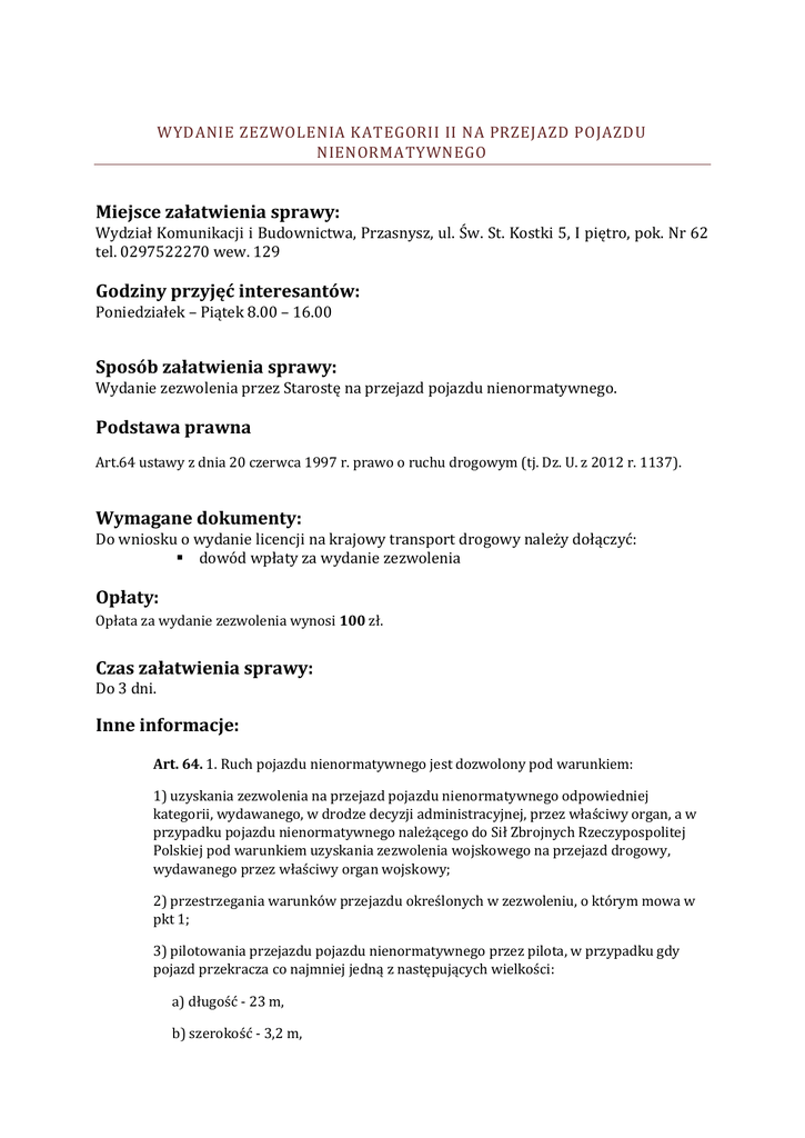 WYDANIE ZEZWOLENIA KATEGORII II NA PRZEJAZD POJAZDU NIENORMATYWNEGO Miejsce załatwienia sprawy: Wydział Komunikacji i Budownictwa, Przasnysz, ul. Św. St. Kostki 5, I piętro, pok. Nr 62 tel. 0297522270 wew. 129 Godziny przyjęć interesantów: Poniedziałek – Piątek 8.00 – 16.00 Sposób załatwienia sprawy: Wydanie zezwolenia przez Starostę na przejazd pojazdu nienormatywnego. Podstawa prawna Art.64 ustawy z dnia 20 czerwca 1997 r. prawo o ruchu drogowym (tj. Dz. U. z 2012 r. 1137). Wymagane dokumenty: Do wniosku o wydanie licencji na krajowy transport drogowy należy dołączyć: dowód wpłaty za wydanie zezwolenia Opłaty: Opłata za wydanie zezwolenia wynosi 100 zł. Czas załatwienia sprawy: Do 3 dni. Inne informacje: Art. 64. 1. Ruch pojazdu nienormatywnego jest dozwolony pod warunkiem: 1) uzyskania zezwolenia na przejazd pojazdu nienormatywnego odpowiedniej kategorii, wydawanego, w drodze decyzji administracyjnej, przez właściwy organ, a w przypadku pojazdu nienormatywnego należącego do Sił Zbrojnych Rzeczypospolitej Polskiej pod warunkiem uzyskania zezwolenia wojskowego na przejazd drogowy, wydawanego przez właściwy organ wojskowy; 2) przestrzegania warunków przejazdu określonych w zezwoleniu, o którym mowa w pkt 1; 3) pilotowania przejazdu pojazdu nienormatywnego przez pilota, w przypadku gdy pojazd przekracza co najmniej jedną z następujących wielkości: a) długość - 23 m, b) szerokość - 3,2 m, c) wysokość - 4,5 m, d) rzeczywista masa całkowita - 60 t; 4) zachowania szczególnej ostrożności przez kierującego pojazdem nienormatywnym. 2. Zabrania się przewozu pojazdem nienormatywnym ładunków innych niż ładunek niepodzielny, z wyłączeniem pojazdów nienormatywnych uprawnionych do poruszania się na podstawie zezwoleń kategorii I lub kategorii II. 3. Wymiary, masa, naciski osi pojazdów nienormatywnych uprawnionych do poruszania się na podstawie zezwoleń kategorii I-VII oraz drogi, po których pojazdy te mogą się poruszać, są określone w tabeli stanowiącej załącznik do ustawy. 4. Kierujący pojazdem nienormatywnym jest obowiązany mieć przy sobie i okazywać uprawnionym osobom zezwolenie, o którym mowa w ust. 1 pkt 1, albo wypis z zezwolenia w przypadku zezwolenia kategorii I. 5. Organ wydający zezwolenie na przejazd pojazdu nienormatywnego prowadzi rejestr wydanych zezwoleń. W rejestrze umieszcza się następujące dane: 1) numer zezwolenia; 2) datę wydania zezwolenia; 3) kategorię zezwolenia; 4) podmiotu, na który zezwolenie zostało wydane; 5) pojazdu lub zespołu pojazdów, jeżeli zostały określone w zezwoleniu. Art. 64b. 1. Zezwolenie kategorii II jest wydawane na przejazd nienormatywnego pojazdu wolnobieżnego, ciągnika rolniczego albo zespołu pojazdów składającego się z pojazdu wolnobieżnego lub ciągnika rolniczego i przyczepy specjalnej. 2. Zezwolenie wydaje się na wniosek podmiotu wykonującego przejazd. Do wniosku dołącza się dowód wniesienia opłaty za wydanie zezwolenia. 3. Zezwolenie wydaje starosta właściwy ze względu na siedzibę wnioskodawcy albo miejsce rozpoczęcia przejazdu. Zezwolenie wydaje się po uiszczeniu opłaty, w terminie 3 dni roboczych od dnia złożenia wniosku o jego wydanie. 4. Zezwolenie wydaje się na okres 12 miesięcy, wskazując w nim: 1) podmiot wykonujący przejazd; 2) pojazd, którym będzie wykonywany przejazd. 5. do ruchu pojazdu nienormatywnego, o którym mowa w ust. 1, nie stosuje się przepisu art. 64 ust. 1 pkt 3. Art. 64c. 1. Zezwolenia kategorii III-VI na przejazd pojazdu nienormatywnego są wydawane na wskazany we wniosku okres: miesiąca, 6 miesięcy, 12 miesięcy lub 24 miesięcy. 2. Zezwolenie wydaje się na wniosek zainteresowanego podmiotu. Do wniosku dołącza się dowód wniesienia opłaty za wydanie zezwolenia. 3. Zezwolenie wydaje: 1) właściwy ze względu na siedzibę wnioskodawcy albo miejsce rozpoczęcia przejazdu starosta - w zakresie zezwoleń kategorii III; 2) Generalny Dyrektor Dróg Krajowych i Autostrad - w zakresie zezwoleń kategorii IVVI. 4. Zezwolenia kategorii III i IV przy wjeździe na terytorium Rzeczypospolitej Polskiej wydaje także naczelnik urzędu celnego. 5. Zezwolenie kategorii IV uprawnia do poruszania się pojazdami i drogami, określonymi dla zezwolenia kategorii III. 6. Zezwolenie kategorii VI uprawnia do poruszania się pojazdami i drogami, określonymi dla zezwolenia kategorii V. 7. Zezwolenie wydaje się po uiszczeniu opłaty, w terminie 3 dni roboczych od dnia złożenia wniosku o jego wydanie. W przypadku niewydania zezwolenia zwraca się wniesioną opłatę. 8. Zezwolenie wydaje się dla podmiotu wykonującego przejazd, bez wskazania pojazdu, którym przejazd będzie wykonywany. Do zezwolenia kategorii VI organ wydający zezwolenie dołącza wykaz dróg krajowych, po których może odbywać się przejazd pojazdu nienormatywnego. 9. Podmiot posiadający zezwolenie kategorii V i VI, planujący wykonanie przejazdu przez most lub wiadukt po drogach innych niż krajowe pojazdem, którego rzeczywista masa całkowita jest większa od dopuszczalnej, jest obowiązany zawiadomić pisemnie właściwego dla tego mostu lub wiaduktu zarządcę drogi o terminie i trasie planowanego przejazdu, w terminie 7 dni roboczych przed datą planowanego przejazdu, przy czym 7. dzień terminu jest ostatecznym dniem wpływu zawiadomienia do organu. 10. Zarządca drogi w przypadku, o którym mowa w ust. 9, najpóźniej 3 dni przed datą planowanego przejazdu potwierdza przyjęcie zawiadomienia i może określić warunki przejazdu przez most lub wiadukt albo zgłosić uzasadniony sprzeciw. 11. Warunki przejazdu pojazdu nienormatywnego przez most lub wiadukt określa zarządca drogi, ustalając, zależnie od potrzeb, ograniczenia w zakresie ruchu, sposób przejazdu oraz przystosowanie obiektu do przejazdu. 12. Zarządca drogi może zgłosić sprzeciw, o którym mowa w ust. 10, jeżeli stan technicznej sprawności mostu lub wiaduktu, po którym p