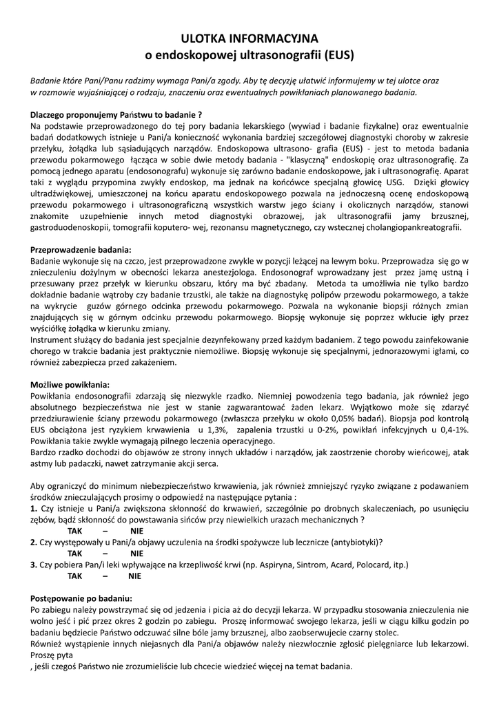 ULOTKA INFORMACYJNA o endoskopowej ultrasonografii (EUS) Badanie które Pani/Panu radzimy wymaga Pani/a zgody. Aby tę decyzję ułatwić informujemy w tej ulotce oraz w rozmowie wyjaśniającej o rodzaju, znaczeniu oraz ewentualnych powikłaniach planowanego badania. Dlaczego proponujemy Państwu to badanie ? Na podstawie przeprowadzonego do tej pory badania lekarskiego (wywiad i badanie fizykalne) oraz ewentualnie badań dodatkowych istnieje u Pani/a konieczność wykonania bardziej szczegółowej diagnostyki choroby w zakresie przełyku, żołądka lub sąsiadujących narządów. Endoskopowa ultrasono- grafia (EUS) - jest to metoda badania przewodu pokarmowego łącząca w sobie dwie metody badania - "klasyczną" endoskopię oraz ultrasonografię. Za pomocą jednego aparatu (endosonografu) wykonuje się zarówno badanie endoskopowe, jak i ultrasonografię. Aparat taki z wyglądu przypomina zwykły endoskop, ma jednak na końcówce specjalną głowicę USG. Dzięki głowicy ultradźwiękowej, umieszczonej na końcu aparatu endoskopowego pozwala na jednoczesną ocenę endoskopową przewodu pokarmowego i ultrasonograficzną wszystkich warstw jego ściany i okolicznych narządów, stanowi znakomite uzupełnienie innych metod diagnostyki obrazowej, jak ultrasonografii jamy brzusznej, gastroduodenoskopii, tomografii koputero- wej, rezonansu magnetycznego, czy wstecznej cholangiopankreatografii. Przeprowadzenie badania: Badanie wykonuje się na czczo, jest przeprowadzone zwykle w pozycji leżącej na lewym boku. Przeprowadza się go w znieczuleniu dożylnym w obecności lekarza anestezjologa. Endosonograf wprowadzany jest przez jamę ustną i przesuwany przez przełyk w kierunku obszaru, który ma być zbadany. Metoda ta umożliwia nie tylko bardzo dokładnie badanie wątroby czy badanie trzustki, ale także na diagnostykę polipów przewodu pokarmowego, a także na wykrycie guzów górnego odcinka przewodu pokarmowego. Pozwala na wykonanie biopsji różnych zmian znajdujących się w górnym odcinku przewodu pokarmowego. Biopsję wykonuje się poprzez wkłucie igły przez wyściółkę żołądka w kierunku zmiany. Instrument służący do badania jest specjalnie dezynfekowany przed każdym badaniem. Z tego powodu zainfekowanie chorego w trakcie badania jest praktycznie niemożliwe. Biopsję wykonuje się specjalnymi, jednorazowymi igłami, co również zabezpiecza przed zakażeniem. Możliwe powikłania: Powikłania endosonografii zdarzają się niezwykle rzadko. Niemniej powodzenia tego badania, jak również jego absolutnego bezpieczeństwa nie jest w stanie zagwarantować żaden lekarz. Wyjątkowo może się zdarzyć przedziurawienie ściany przewodu pokarmowego (zwłaszcza przełyku w około 0,05% badań). Biopsja pod kontrolą EUS obciążona jest ryzykiem krwawienia u 1,3%, zapalenia trzustki u 0-2%, powikłań infekcyjnych u 0,4-1%. Powikłania takie zwykle wymagają pilnego leczenia operacyjnego. Bardzo rzadko dochodzi do objawów ze strony innych układów i narządów, jak zaostrzenie choroby wieńcowej, atak astmy lub padaczki, nawet zatrzymanie akcji serca. Aby ograniczyć do minimum niebezpieczeństwo krwawienia, jak również zmniejszyć ryzyko związane z podawaniem środków znieczulających prosimy o odpowiedź na następujące pytania : 1. Czy istnieje u Pani/a zwiększona skłonność do krwawień, szczególnie po drobnych skaleczeniach, po usunięciu zębów, bądź skłonność do powstawania sińców przy niewielkich urazach mechanicznych ? TAK – NIE 2. Czy występowały u Pani/a objawy uczulenia na środki spożywcze lub lecznicze (antybiotyki)? TAK – NIE 3. Czy pobiera Pan/i leki wpływające na krzepliwość krwi (np. Aspiryna, Sintrom, Acard, Polocard, itp.) TAK – NIE Postępowanie po badaniu: Po zabiegu należy powstrzymać się od jedzenia i picia aż do decyzji lekarza. W przypadku stosowania znieczulenia nie wolno jeść i pić przez okres 2 godzin po zabiegu. Proszę informować swojego lekarza, jeśli w ciągu kilku godzin po badaniu będziecie Państwo odczuwać silne bóle jamy brzusznej, albo zaobserwujecie czarny stolec. Również wystąpienie innych niejasnych dla Pani/a objawów należy niezwłocznie zgłosić pielęgniarce lub lekarzowi. Proszę pyta , jeśli czegoś Państwo nie zrozumieliście lub chcecie wiedzieć więcej na temat badania.