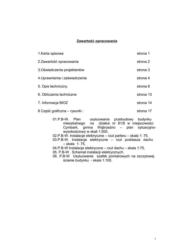 Zawartość opracowania 1.Karta opisowa strona 1 2.Zawartość opracowania strona 2 3.Oświadczenia projektantów strona 3 4.Uprawnienia i zaświadczenia strona 4 5. Opis techniczny. strona 8 6. Obliczenia techniczne strona 13 7. Informacja BIOZ strona 14 8 Część graficzna – rysunki : strona 17 01.P.B-W. Plan usytuowania przebudowy budynku mieszkalnego na działce nr 81/8 w miejscowości Cymbark, gmina Wąbrzeźno – plan sytuacyjnowysokościowy w skali 1:500, 02.P.B-W. Instalacje elektryczne – rzut parteru – skala 1: 75, 03.P.B-W. Instalacje elektryczne – rzut poddasza dachu – skala 1: 75, 04.P.B-W Instalacje elektryczne – rzut dachu – skala 1:75, 05. P.B-W . Schemat instalacji elektrycznych. 06. P.B-W Usytuowanie szafek pomiarowych na szczytowej ścianie budynku - skala 1:100. 1 5.Opis techniczny do projektu budowlano - wykonawczego instalacji elektrycznych w remontowanym mieszkaniu, w budynku, w miejscowości Cymbark – na działce 81/8, gmina Wąbrzeźno. 5.1.Podstawa opracowania. Projekt niniejszy opracowano na podstawie : - ustaleń dokonanych z inwestorem, - dokumentacji technicznej remontu mieszkania w budynku mieszkalnym branży budowlano-konstrukcyjnej i instalacji sanitarnych, - rozmów i uzgodnień dokonanych z przedstawicielem „ENERGAOPERATOR” S.A. Oddział Energetyczny w Toruniu – Rejon Dystrybucji w Grudziądzu – w zakresie wymiany przyłącza i usytuowania szafek pomiarowych wnękowych na zewnętrznej ścianie obiektu - umowy na opracowanie dokumentacji projektowej zawartej z inwestorem, - obowiązujących przepisów w zakresie projektowania. 5.2.Zakres opracowania. Projekt niniejszy obejmuje wykonanie następujących instalacji elektrycznych: - wykonanie linii zasilających od szafek pomiarowych napowietrznych usytuowanych w ścianie frontowej obiektu, do tablic w istniejącej części mieszkalnej obiektu i w mieszkaniu projektowanym, - wykonanie i instalacji odbiorczych w remontowanym mieszkaniu, - wykonanie instalacji odgromowej, - wykonanie instalacji ochrony od porażeń i ochrony przeciwprzepięciowej. 5.3.Ogólne informacje o obiekcie. Przedmiotowy budynek to obiekt istniejący z dwoma mieszkaniami zasilanymi ze wspólnego przyłącza napowietrznego, z dachem dwuspadowym, w części pokrytej blachą i w mniejszej pokryty części papą, wykonany w metodzie tradycyjnej, z poddaszem nieużytkowym, bez podpiwniczenia. W obiekcie znajdują się dwa mieszkania opomiarowane wspólnym licznikiem, jednofazowym, z których jedno opomiarowano podlicznikiem. Zakres remontu dotyczy i rozbudowy dotyczy mieszkania w którym zużycie energii elektrycznej obliczane jest podlicznikiem. Obiekt przygotowany będzie dla potrzeb budynku mieszkalnego – 2 z instalacjami sanitarnymi wodociągową, kanalizacji sanitarnej i centralnego ogrzewania. Przygotowanie c.w.u. i ciepła odbywać będzie się kociołku opalanych paliwem stałym umieszczonych w pomieszczeniu gospodarczym mieszkania. 5.4. Zasilenie obiektu . Zgodnie z warunkami przyłączenia, zasilanie obiektu po remoncie mieszkania przewidziano z istniejącej linii napowietrznej, wykonanej od stacji transformatorowej STA 2-0157 „CYMBARK 1”, przyłączem napowietrznym, linią napowietrzną izolowaną, która zostanie wykonana po zdemontowaniu istniejącego przyłącza YADYn 4x6mm2, doprowadzonym do haka instalowanego w ścianie szczytowej budynku. 5.5. Rozdział energii elektrycznej w obiekcie. Energia elektryczna dla potrzeb obiektu doprowadzona zostanie z istniejącej linii napowietrznej po wymianie przyłącza, przewodem napowietrznym izolowanym od słupa krańcowego nr 219 do haka umieszczonego na ścianie szczytowej budynku, przez projektowane szafki pomiarowe wnękowe PW-Rs, jako TL1 i TL2 usytuowane przy ścianie zewnętrznej szczytowej, obok wejścia do mieszkania. Od miejsca usytuowania haka ułożona zostanie w bruździe w ścianie szczytowej, rura ochronna RGSp50. W miejscu trasy ułożenia rury przy kominie należy odizolować przyłącze, zagłębiając rurowanie i wprowadzając izolację którą należy przykryć warstwą zaprawy grubości 20mm. Od szafek pomiarowych z licznikami pomiaru energii elektrycznej do tablic mieszkaniowych wykonać należy linie zasilające YDY żo 5x6mm2 lub linie LY 5x6mm2 ułożone w rurach ochronnych RGSp 40, ułożonych w bruzdach wykonanych w ścianie jako oddzielne linie, do dwu mieszkań. Linie w rurach ułożone w bruzdach należy wypełnić zaprawą cementową, po zewnętrznych ścianach obiektu, wg trasy ukazanej na rysunku 02 – rzut parteru. Pomiar energii elektrycznej dla potrzeb mieszkań zgodnie z uzgodnieniami i wytycznymi dostawcy Energa-Operator odbywał będzie się licznikami trójfazowymi umieszczonymi w szafkach pomiarowych usytuowanych na zewnętrznej ścianie budynku, w miejscu pokazanym na rysunku 02. 5.6.Wewnętrzne linie zasilające . Wewnętrzne linie zasilające wykonać należy przewodami o przekrojach określonych wcześniej - w opisie. Odgałęzienia od tablic pomiarowych do tablic mieszkaniowych TM wykonać należy przewodami typu YDYżo 5x6mm2 lub 5 x LY6mm2 w RRGSp40, układanymi pod tynkiem. Pod tablicami mieszkaniowymi zainstalować należy w oddzielnej skrzynce ochronniki przeciwprzepięciowe kategorii B+C. 3 5.7 .Instalacje elektryczne w mieszkaniu. Instalacja odbiorcza w mieszkaniu podzielona została na następujące obwody: -obwód 1 zasilający wypusty oświetleniowe sufitowe i ścienne do wykonania przewodami YDYp 3 i 4 x1,5 mm2 - pokoju dużym , łazience, kuchni, pomieszczeniu gospodarczym, -obwód 2 zasilający wypusty oświetleniowe sufitowe i ścienne do wykonania przewodami YDYp 3 i 4 mm2 - w pokojach mniejszych, przedpokoju, wiatrołapie, -obwód gniazd wtyczkowych ogólnego przeznaczenia do wykonania przewodami YDYp 3x2,5mm2 w pokojach, -wydzielony obwód zasilenia instalacji gniazd w kuchni do wykonania przewodami j.w., -wydzielony obwód zasilenia gniazd w pomieszczeniu w.c., do wykonania przewodami j.w., -