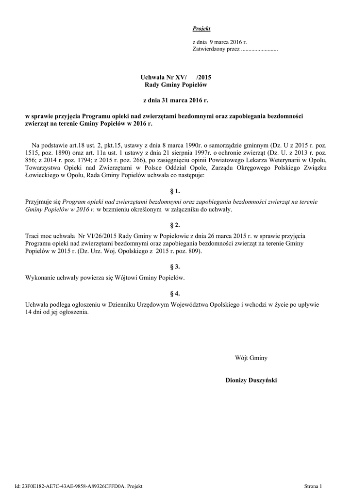Projekt z dnia 9 marca 2016 r. Zatwierdzony przez ......................... Uchwała Nr XV/ /2015 Rady Gminy Popielów z dnia 31 marca 2016 r. w sprawie przyjęcia Programu opieki nad zwierzętami bezdomnymi oraz zapobiegania bezdomności zwierząt na terenie Gminy Popielów w 2016 r. Na podstawie art.18 ust. 2, pkt.15, ustawy z dnia 8 marca 1990r. o samorządzie gminnym (Dz. U z 2015 r. poz. 1515, poz. 1890) oraz art. 11a ust. 1 ustawy z dnia 21 sierpnia 1997r. o ochronie zwierząt (Dz. U. z 2013 r. poz. 856; z 2014 r. poz. 1794; z 2015 r. poz. 266), po zasięgnięciu opinii Powiatowego Lekarza Weterynarii w Opolu, Towarzystwa Opieki nad Zwierzętami w Polsce Oddział Opole, Zarządu Okręgowego Polskiego Związku Łowieckiego w Opolu, Rada Gminy Popielów uchwala co następuje: § 1. Przyjmuje się Program opieki nad zwierzętami bezdomnymi oraz zapobiegania bezdomności zwierząt na terenie Gminy Popielów w 2016 r. w brzmieniu określonym w załączniku do uchwały. § 2. Traci moc uchwała Nr VI/26/2015 Rady Gminy w Popielowie z dnia 26 marca 2015 r. w sprawie przyjęcia Programu opieki nad zwierzętami bezdomnymi oraz zapobiegania bezdomności zwierząt na terenie Gminy Popielów w 2015 r. (Dz. Urz. Woj. Opolskiego z 2015 r. poz. 809). § 3. Wykonanie uchwały powierza się Wójtowi Gminy Popielów. § 4. Uchwała podlega ogłoszeniu w Dzienniku Urzędowym Województwa Opolskiego i wchodzi w życie po upływie 14 dni od jej ogłoszenia. Wójt Gminy Dionizy Duszyński Id: 23F0E182-AE7C-43AE-9858-A89326CFFD0A. Projekt Strona 1 Załącznik do Uchwały Nr XV/ /2015 Rady Gminy Popielów z dnia 31 marca 2016 r. Program opieki nad zwierzętami bezdomnymi oraz zapobiegania bezdomności zwierząt na terenie Gminy Popielów w 2016 r. § 1. Postanowienia ogólne Program opieki nad zwierzętami bezdomnymi oraz zapobiegania bezdomności zwierząt na terenie Gminy Popielów w 2016 r., zwany dalej Programem, ma zastosowanie do wszystkich zwierząt domowych, w szczególności do psów i kotów, w tym kotów wolno żyjących oraz zwierząt gospodarskich, przebywających w granicach administracyjnych Gminy Popielów. § 2. Cel i zadania programu 1. Celem programu jest zapewnienie opieki nad zwierzętami bezdomnymi oraz zapobieganie bezdomności zwierząt. 2. Zadania priorytetowe: 1) zapewnienie bezdomnym zwierzętom miejsca w schronisku dla zwierząt; 2) opieka nad wolno żyjącymi kotami, w tym ich dokarmianie; 3) odławianie bezdomnych zwierząt; 4) obligatoryjna sterylizacja albo kastracja zwierząt w schronisku dla zwierząt; 5) poszukiwanie nowych właścicieli dla bezdomnych zwierząt; 6) usypianie ślepych miotów; 7) wskazanie gospodarstwa rolnego, w celu zapewnienia miejsca dla zwierząt gospodarskich; 8) zapewnienie całodobowej opieki weterynaryjnej, w przypadkach zdarzeń drogowych z udziałem zwierząt; 9) edukację mieszkańców Gminy Popielów w zakresie opieki nad zwierzętami. § 3. Wykonawcy programu Realizacja działań dotyczących przy wzajemnej współpracy: przeciwdziałaniu bezdomności zwierząt prowadzona będzie 1) Wójta Gminy Popielów za pośrednictwem Referatu Inwestycji, Infrastruktury Technicznej, Rolnictwa i Ochrony Środowiska :osoba do kontaktu Renata Biel tel.77 427 58 53 lub po godzinach pracu Urzędu Gminy 604 215 787; Id: 23F0E182-AE7C-43AE-9858-A89326CFFD0A. Projekt Strona 1 2) organizacji społecznych, których statutowym celem działania jest ochrona zwierząt we współpracy z organami Inspekcji Weterynaryjnej; 3) schroniska dla zwierząt „SOS dla zwierząt” w Chorzowie, poprzez zapewnienie opieki zwierzętom bezdomnym; 4) placówek oświatowych poprzez aktywne uczestniczenie w działaniach informacyjnych i edukacyjnych mieszkańców; 5) Gabinetu Weterynaryjnego na Wapiennikach Mirosław Dymała, ul. Wapienniki 1, 46-037 Karłowice tel. 796 657 675; 6) gospodarstwa rolnego: ul. Wapienniki 1, 46-037 Karłowice zapewniającego miejsca dla zwierząt gospodarskich. § 4. Zapewnienie bezdomnym zwierzętom miejsca w schronisku dla zwierząt 1. Umieszczenie bezdomnych zwierząt w schronisku dla zwierząt, w którym otoczone będą podstawową opieką. Do podstawowych form opieki świadczonej przez schroniska dla bezdomnych zwierząt należy zapewnienie zwierzętom bezpiecznego schronienia, pożywienia podstawowej opieki weterynaryjnej oraz pomoc w znalezieniu nowych opiekunów. 2. Bezdomne zwierzęta z terenu Gminy Popielów będą kierowane do schroniska dla zwierząt „SOS dla zwierząt” w Chorzowie przez specjalistyczną firmę: Przedsiębiorstwo Usług Produkcyjno- Handlowych – Wielobranżowych „Gabi” ul. Dworcowa 24, 47-120 Żędowice, z którym Gmina ma podpisaną umowę. Schroniska posiadają aktualną umowę z lekarzem weterynarii na świadczenie kompleksowej obsługi weterynaryjnej nad zwierzętami przyjmowanymi i przebywającymi w schronisku oraz umowę na odbiór zwierząt uśpionych lub padłych w schronisku. § 5. Opieka nad wolno żyjącymi kotami, w tym ich dokarmianie 1. Sprawowanie opieki nad kotami wolno żyjącymi realizowane będzie poprzez podejmowanie interwencji w momencie pojawienia się sygnałów o zaistniałym problemie, w szczególności przez: 1) ustalenie miejsc, w których przebywają koty wolnożyjące; 2) zapewnienie dokarmiania oraz wody pitnej w okresach występowania trudnych warunków pogodowych utrudniających zdobywanie pożywienia w miejscach ich przebywania przez pracowników Urzędu gminy, sołtysów, przedstawicieli rad sołeckich lub wolontariuszy. 2. Dokonywanie w uzasadnionych przypadkach usypiania ślepych miotów kotów żyjących na wolności i zmniejszania populacji bezdomnych kotów poprzez sterylizację oraz kastrację na koszt Gminy do wyczerpania środków finansowych przeznaczonych na ten cel w danym roku kalendarzowym - (Gabinet Weterynaryjny na Wapiennikach Mirosław Dymała w Karłowicach ul. Wapienniki 1 tel. 796 657 6750). § 6. Id: 23F0E182-AE7C-43AE-9858-A89326CFFD0A. Projekt Strona 2 Odł
