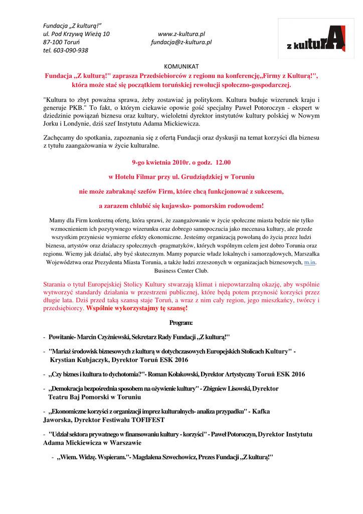 Fundacja „Z kulturą!” ul. Pod Krzywą Wieżą 10 87-100 Toruń tel. 603-090-938 www.z-kultura.pl [email protected] KOMUNIKAT Fundacja „Z kulturą!" zaprasza Przedsiebiorców z regionu na konferencję„Firmy z Kulturą!", która może stać się początkiem toruńskiej rewolucji społeczno-gospodarczej. "Kultura to zbyt poważna sprawa, żeby zostawiać ją politykom. Kultura buduje wizerunek kraju i generuje PKB." To fakt, o którym ciekawie opowie gość specjalny Paweł Potoroczyn - ekspert w dziedzinie powiązań biznesu oraz kultury, wieloletni dyrektor instytutów kultury polskiej w Nowym Jorku i Londynie, dziś szef Instytutu Adama Mickiewicza. Zachęcamy do spotkania, zapoznania się z ofertą Fundacji oraz dyskusji na temat korzyści dla biznesu z tytułu zaangażowania w życie kulturalne. 9-go kwietnia 2010r. o godz. 12.00 w Hotelu Filmar przy ul. Grudziądzkiej w Toruniu nie może zabraknąć szefów Firm, które chcą funkcjonować z sukcesem, a zarazem chlubić się kujawsko- pomorskim rodowodem! Mamy dla Firm konkretną ofertę, która sprawi, że zaangażowanie w życie społeczne miasta będzie nie tylko wzmocnieniem ich pozytywnego wizerunku oraz dobrego samopoczucia jako mecenasa kultury, ale przede wszystkim przyniesie wymierne efekty ekonomiczne. Jesteśmy organizacją powołaną do życia przez ludzi biznesu, artystów oraz działaczy społecznych -pragmatyków, których wspólnym celem jest dobro Torunia oraz regionu. Wiemy jak działać, aby być skutecznym. Mamy poparcie władz lokalnych i samorządowych, Marszałka Województwa oraz Prezydenta Miasta Torunia, a także ludzi zrzeszonych w organizacjach biznesowych, m.in. Business Center Club. Starania o tytuł Europejskiej Stolicy Kultury stwarzają klimat i niepowtarzalną okazję, aby wspólnie wytworzyć standardy działania w przestrzeni publicznej, które będą potem przynosić korzyści przez długie lata. Dziś przed taką szansą staje Toruń, a wraz z nim cały region, jego mieszkańcy, twórcy i przedsiębiorcy. Wspólnie wykorzystajmy tę szansę! Program: - Powitanie- Marcin Czyżniewski, Sekretarz Rady Fundacji „Z kulturą!" - "Mariaż środowisk biznesowych z kulturą w dotychczasowych Europejskich Stolicach Kultury" Krystian Kubjaczyk, Dyrektor Toruń ESK 2016 - „Czy biznes i kultura to dychotomia?"- Roman Kołakowski, Dyrektor Artystyczny Toruń ESK 2016 - „Demokracja bezpośrednia sposobem na ożywienie kultury" - Zbigniew Lisowski, Dyrektor Teatru Baj Pomorski w Toruniu - „Ekonomiczne korzyści z organizacji imprez kulturalnych- analiza przypadku" - Kafka Jaworska, Dyrektor Festiwalu TOFIFEST - "Udział sektora prywatnego w finansowaniu kultury - korzyści" - Paweł Potoroczyn, Dyrektor Instytutu Adama Mickiewicza w Warszawie - „Wiem. Widzę. Wspieram."- Magdalena Szwechowicz, Prezes Fundacji „Z kulturą!" Fundacja „Z kulturą!” ul. Pod Krzywą Wieżą 10 87-100 Toruń tel. 603-090-938 www.z-kultura.pl [email protected] Spotkaniu towarzyszyć będą liczne wydarzenia kulturalne: film o Toruniu, piosenka o Bydgoszczy, małe formy teatralne, wystawy grafik, fotografii, malarstwa, ceramiki i występy zespołów muzycznych. Swój aktywny udział w spotkaniu zadeklarowało już wielu artystów i instytucji m.in.: Lech Tadeusz Karczewski, Anka Wysocka, Marek Głowacki, Dariusz Przewięźlikowski, Tomasz Cebo, Spring Quintet, Teatr Baj Pomorski, Piotr Dziemianowski, Małgorzata Wojnowska Sobecka, Alicja Bogacka, Jacek Beszczyński, Klaudia i Stanisław Winiarscy, Jacek Smarz, Janusz Bogacki, CSW, studenci ASP. Czekamy na dalsze zgłoszenia twórców, którzy chcą pochwalić się swoim dorobkiem i pokazać Przedsiębiorcom kulturalne oblicze miasta i regionu. Spotkanie organizowane jest we współpracy z Instytucją Miejską Toruń 2016, a przedsięwzięcie wsparli już: Hotel Filmar, Budlex, Konsul Honorowy Litwy, Pracownia Poligraficzna oraz Impresariat Muzyczny Sauron. Patronat honorowy: Marszałek Województwa Kujawsko-Pomorskiego Piotr Całbecki Prezydent Miasta Torunia Michał Zaleski Patronat medialny: TVK Toruń Radio GRA Gazeta Pomorska Teraz Toruń Radio Eska Radio WAWA