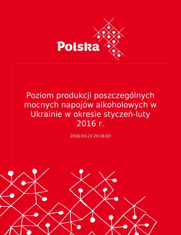Poziom produkcji poszczególnych mocnych napojów alkoholowych w Ukrainie w okresie styczeń-luty 2016 r. 2016-03-23 20:18:03 2 Państwowa Służba Statystyczna Ukrainy opublikowała dane dotyczące poziomu produkcji poszczególnych mocnych napojów alkoholowych w Ukrainie w okresie styczeń – luty 2016 r. Zgodnie z tymi danymi, w ciągu pierwszych dwóch miesięcy 2016 r. w Ukrainie wyprodukowano 4,67 mln dal wódki o zwartości spirytusu poniżej 45,4%, co oznacza 98% wzrost produkcji w porównaniu z analogicznym okresem 2015 r. Produkcja koniaku i brandy w Ukrainie w okresie styczeń – luty 2016 r. wzrosła w porównaniu z analogicznym okresem 2015 r. o 32,4% do 514 tys. dal. Z kolei poziom produkcji likerów oraz pozostałych napojów alkoholowych w w/w okresie zmniejszył się w porównaniu z analogicznym okresem 2015 r. o 57,3% do 528 tys. dal. Źródło: „Unian” 3